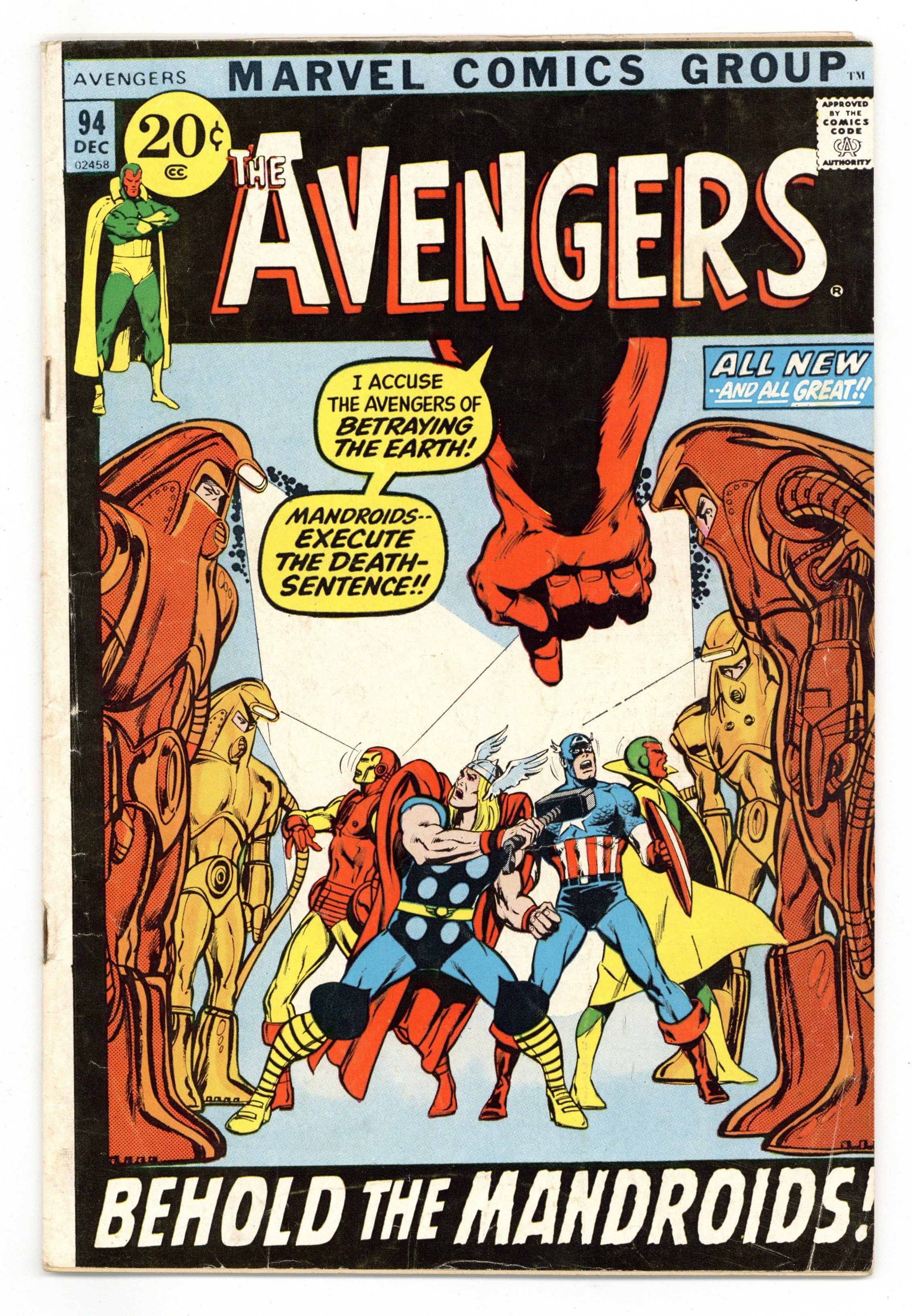 "More Than Inhuman!" Part 6 of 9. Guest-starring Captain Marvel. Script by Roy Thomas. Pencils by Neal Adams and John Buscema. Inks by Tom Palmer. Cover by Neal Adams and Tom Palmer (with John Romita touch-ups). After capturing Captain Marvel, Quicksilver, and the Scarlet Witch last issue; the victorious Super-Skrull pilots his spacecraft to the Himalayas to destroy the Inhumans! But the Vision's interference and the impenetrable dome over the Great Refuge thwart the evil skrull's plan! Frustrated by his failure, the Super-Skrull space warps to the Skrull Throneworld with his three super-powered captives in tow! Meanwhile at Avengers Mansion, Earth's Mightiest Heroes work feverishly to develop a counterpunch for the Kree and the Skrulls! But their most pressing problem turns out to be the Alien Activities Commission and the Mandroids! The Mighty Avengers are stuck...moving at the speed of government! First appearance of the Mandroids. Cameo appearances by Nick Fury, Triton, Mr. Fantastic, and the Thing. Avengers Lineup: Captain America, Goliath, Iron Man, Quicksilver, Scarlet Witch, Thor, and the Vision. First 20¢ issue. 36 pages. Cover price $0.20.