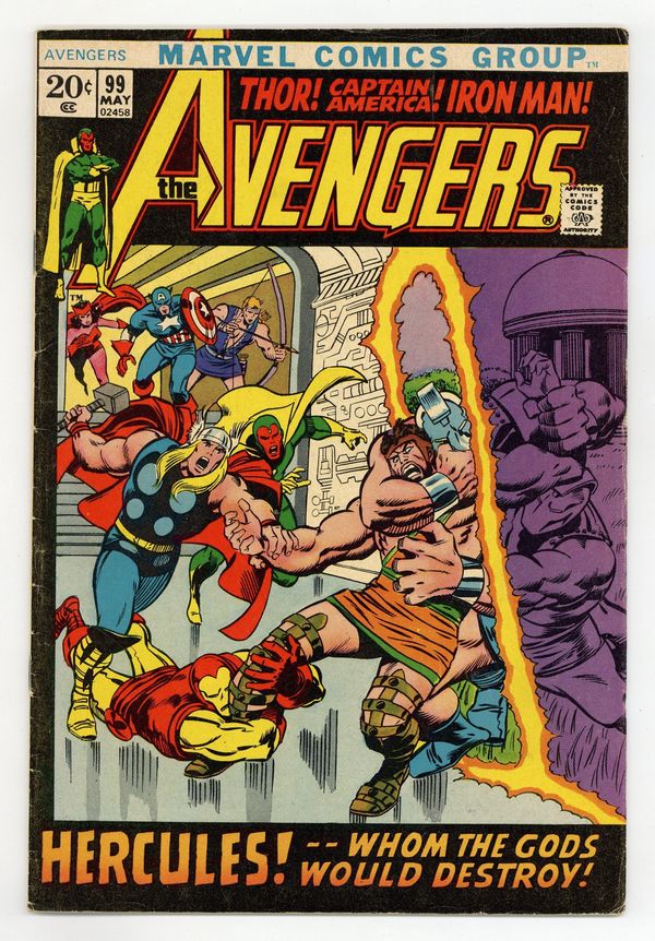 Tags: Marvel Legacy Numbering: Avengers (part 99), Print Run Statistics$16.00"They First Make Mad!" Part 2 of 3. Script by Roy Thomas. Pencils by Barry Windsor-Smith. Inks by Tom Sutton. Cover by John Buscema and Barry Windsor-Smith. Earth's Mightiest Heroes welcome back Hawkeye and Hercules to their ranks! However not all is well with the Prince of Power! Hercules has lost his memory! And while the Avengers feverishly work to restore it, Ares makes his next move! In a flash of light, Bia and Kratos appear inside Avengers Mansion and grab Hercules! Wow, this is the powerful duo that bound Prometheus in days of yore! But the Avengers don't care about the past, they will protect the Son of Zeus at all costs! The gods, demi-gods, and mortals throw down on Fifth Avenue for the Lion of Olympus! Cameo appearances by Jarvis, Ant-Man (aka Henry Pym), and the Black Panther. Flashback cameos by Goliath, the Guardsman (aka Kevin O'Brien), and the Skrulls to recap Clint Barton's narrow escape at the end of the Kree/Skrull war. Avengers Lineup: Captain America, Hawkeye, Hercules, Iron Man, Quicksilver, Scarlet Witch, Thor, and the Vision. (Notes: The letters page includes a letter from comics historian George Olshevsky. The letters page also contains a statement of ownership: average print run 342,236; average paid circulation 206,478.) 36 pages. Cover price $0.20.