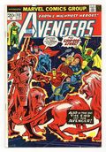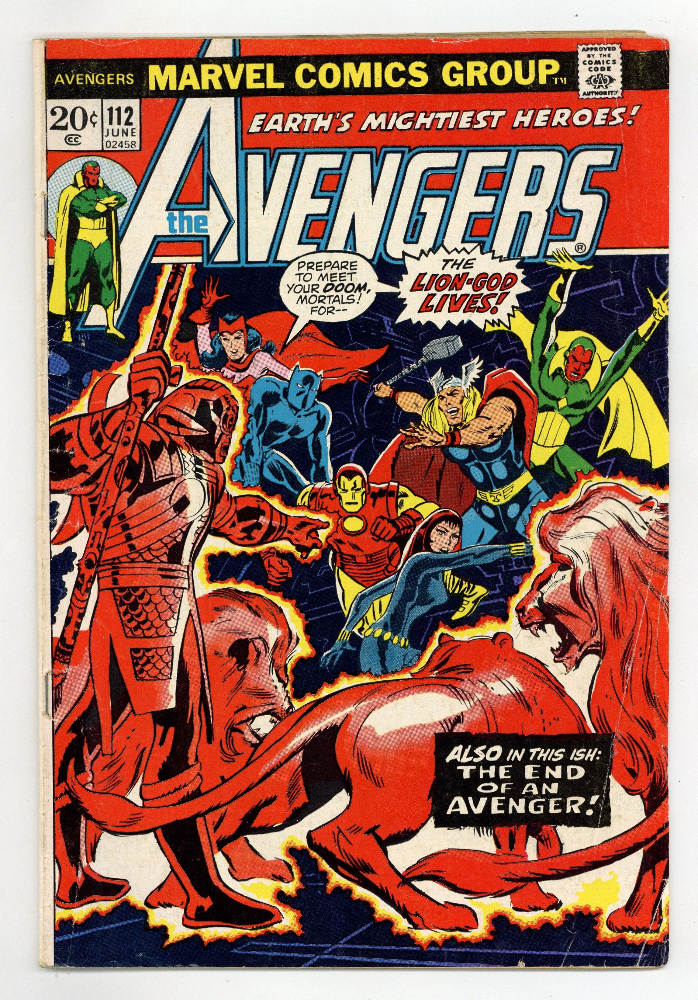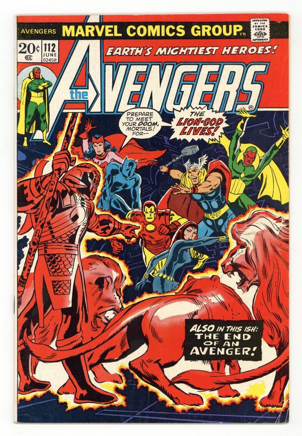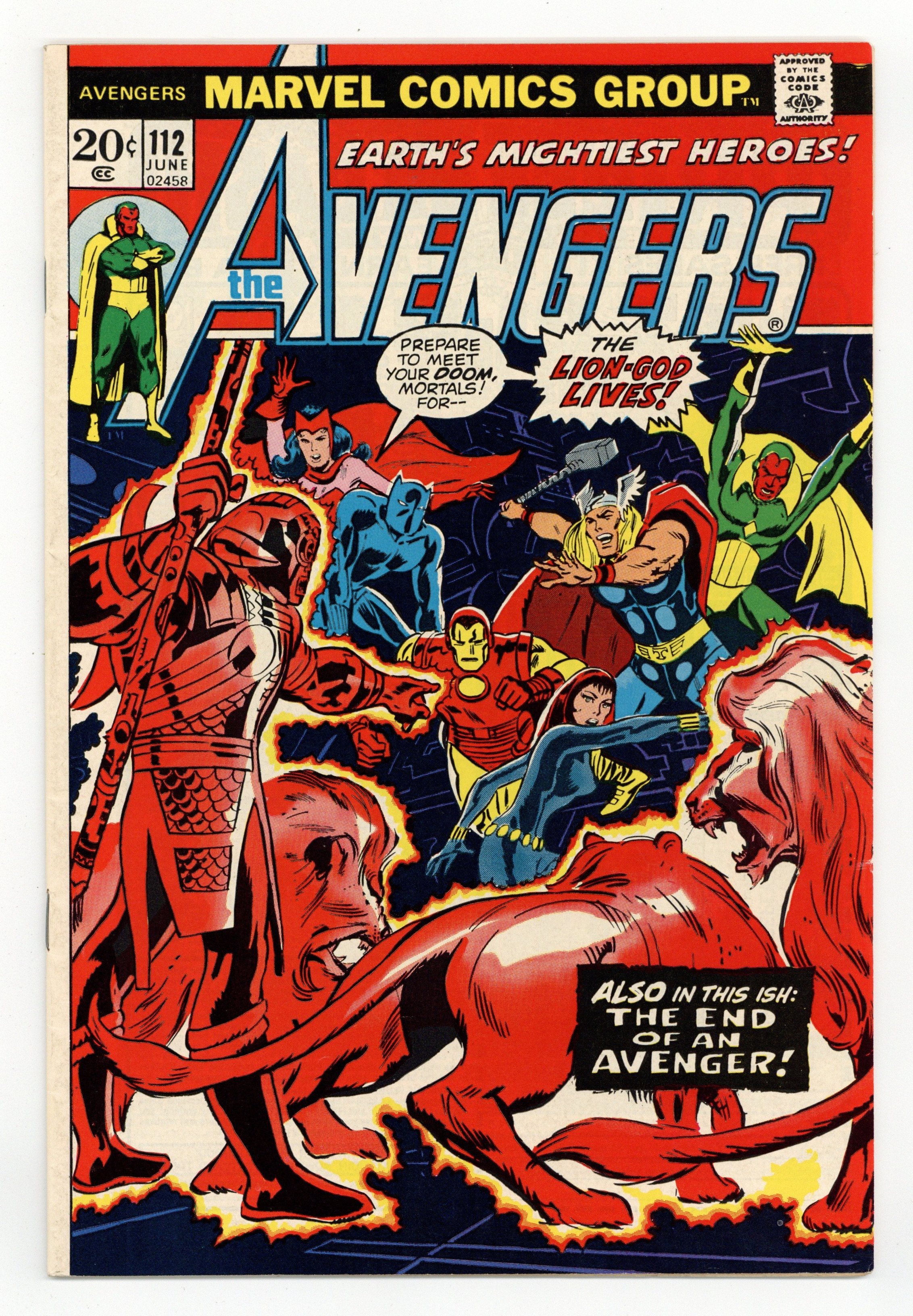 "The Lion God Lives!" First appearance of Mantis. Script by Steve Englehart. Pencils by Don Heck. Inks by Frank Rolle. Cover by Don Heck. A mob of African protesters gathers outside Avengers Mansion and demands that the Black Panther return to his native Wakanda! When T'Challa goes outside to talk, he's kidnapped by their leader, the Lion God! Then the mob disperses and the Avengers are left wondering what just happened! However several hours later, the Lion God returns to the mansion and the no-holds-barred battle begins! Unfortunately, Earth's Mightiest Heroes fall one-by-one until only the Avengers' resident god remains! Can the Mighty Thor bring down the thunder and lightning and silence the Lion God's roar? Meanwhile on the other side of the globe, a mysterious couple makes plans to travel to the United States and join the Avengers. Cameo appearances by Mantis and the Swordsman. Avengers Lineup: Black Panther, Black Widow, Captain America, Iron Man, Scarlet Witch, Thor, and the Vision. 36 pages Cover price $0.20.