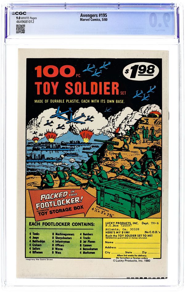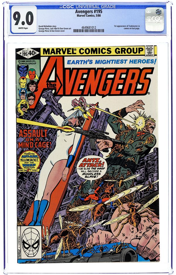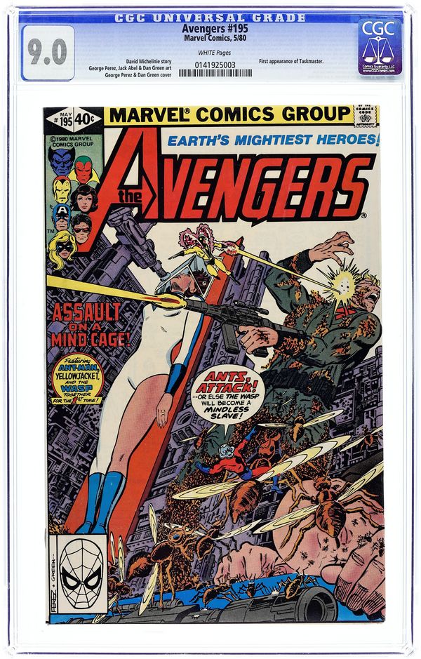 Tags: Marvel Legacy Numbering: Avengers (part 195), Avengers$12.00Direct Edition. "Assault on a Mind Cage!" Guest-starring Ant-Man. Script by David Michelinie. Pencils by George Perez. Inks by Jack Abel and Dan Green. Cover by George Perez and Dan Green. The Wasp has taken it upon herself to invade the Solomon Institute and find out what's going on inside! Unfortunately though, it's been several hours since anyone's heard from her! So Yellowjacket and Ant-Man (aka Scott Lang) infiltrate the institute, while the remaining avengers wait outside in the snow! The three insect-size heroes are having an easy time defeating all the guards in the asylum, but their fortunes dramatically change when the institute's head honcho arrives...the Taskmaster! First (cameo) appearance of the Taskmaster. Avengers Lineup: Beast, Captain America, Iron Man, Jocasta, Ms. Marvel, Vision, Wasp, Wonder Man, and Yellowjacket. 36 pages Cover price $0.40.