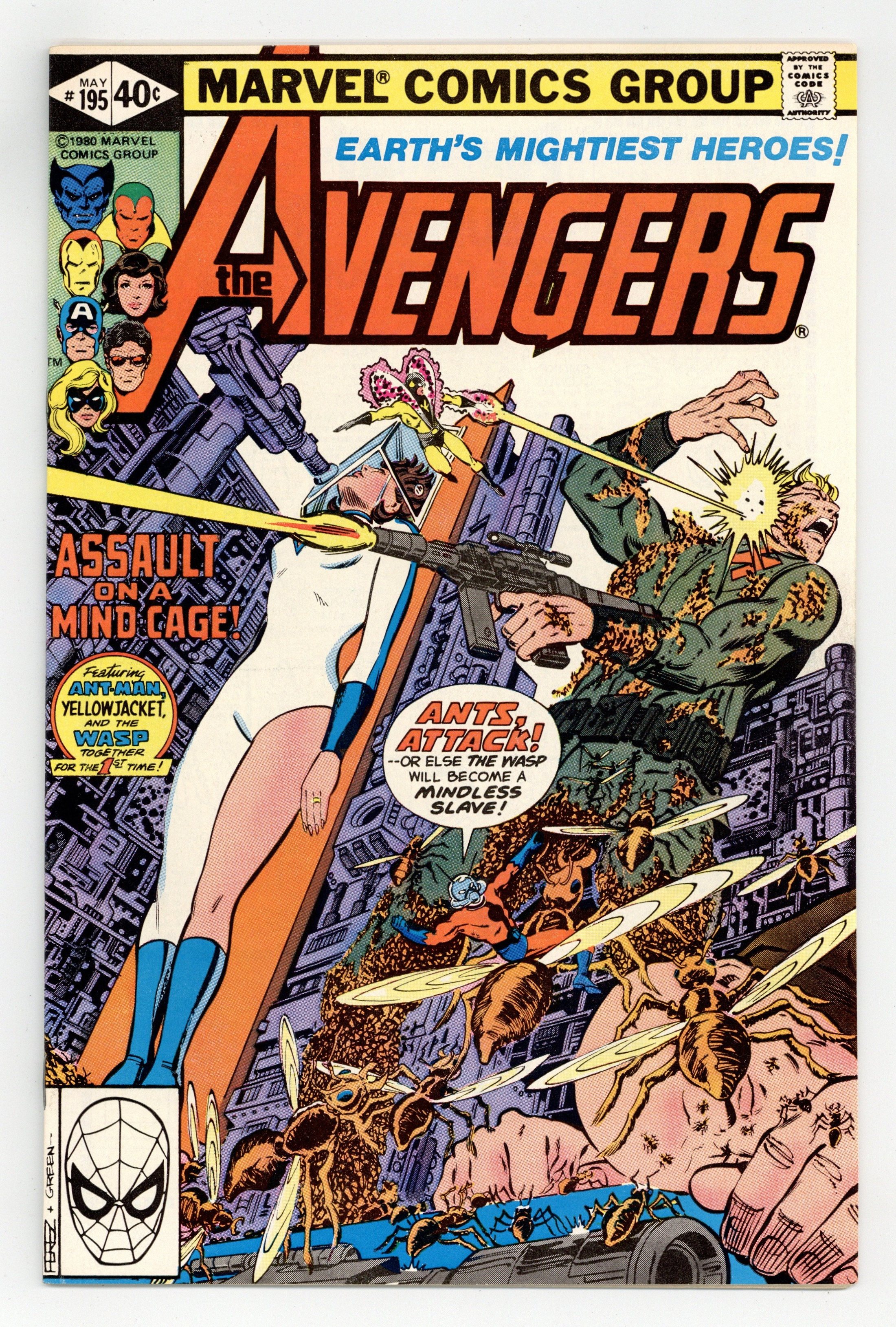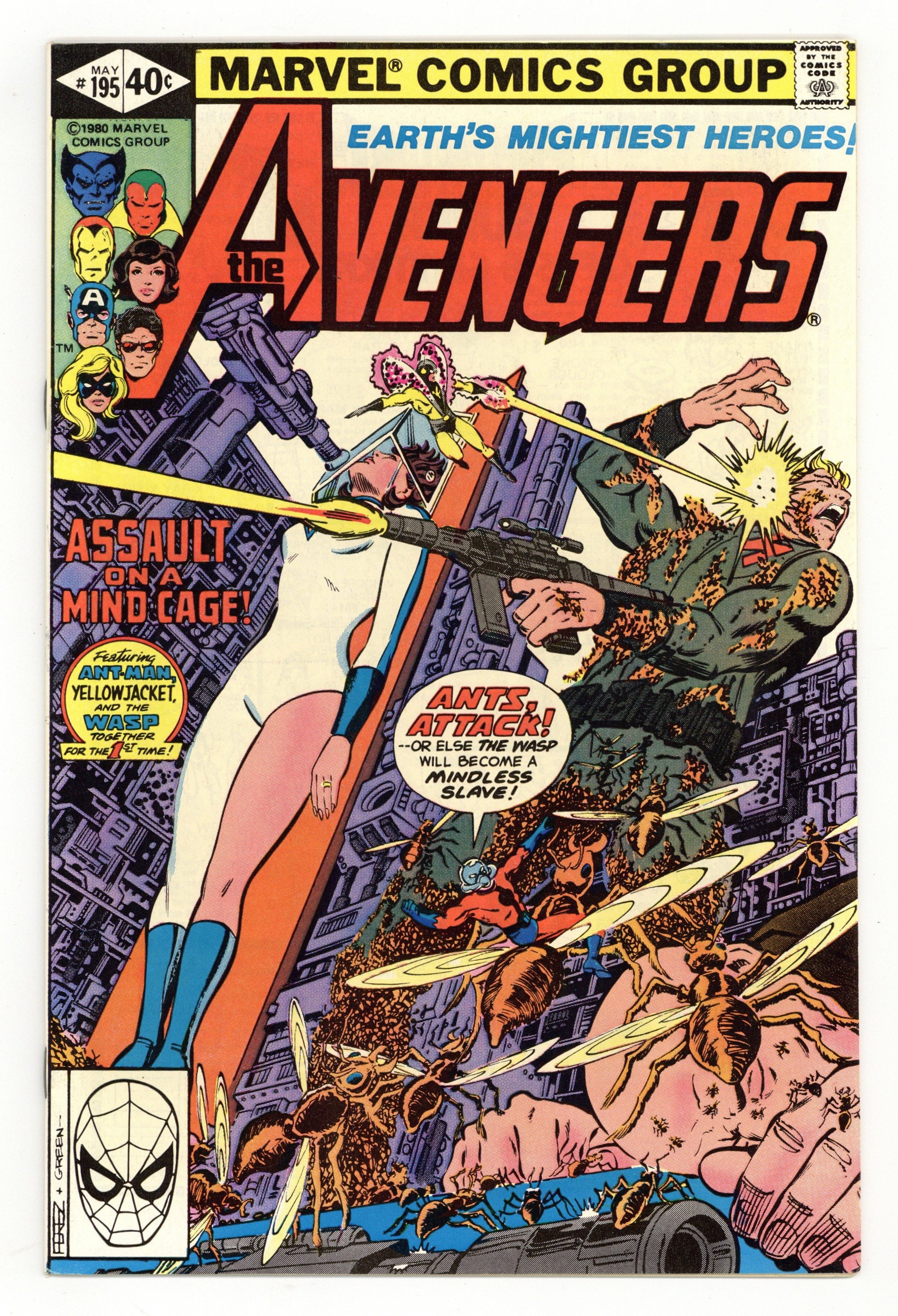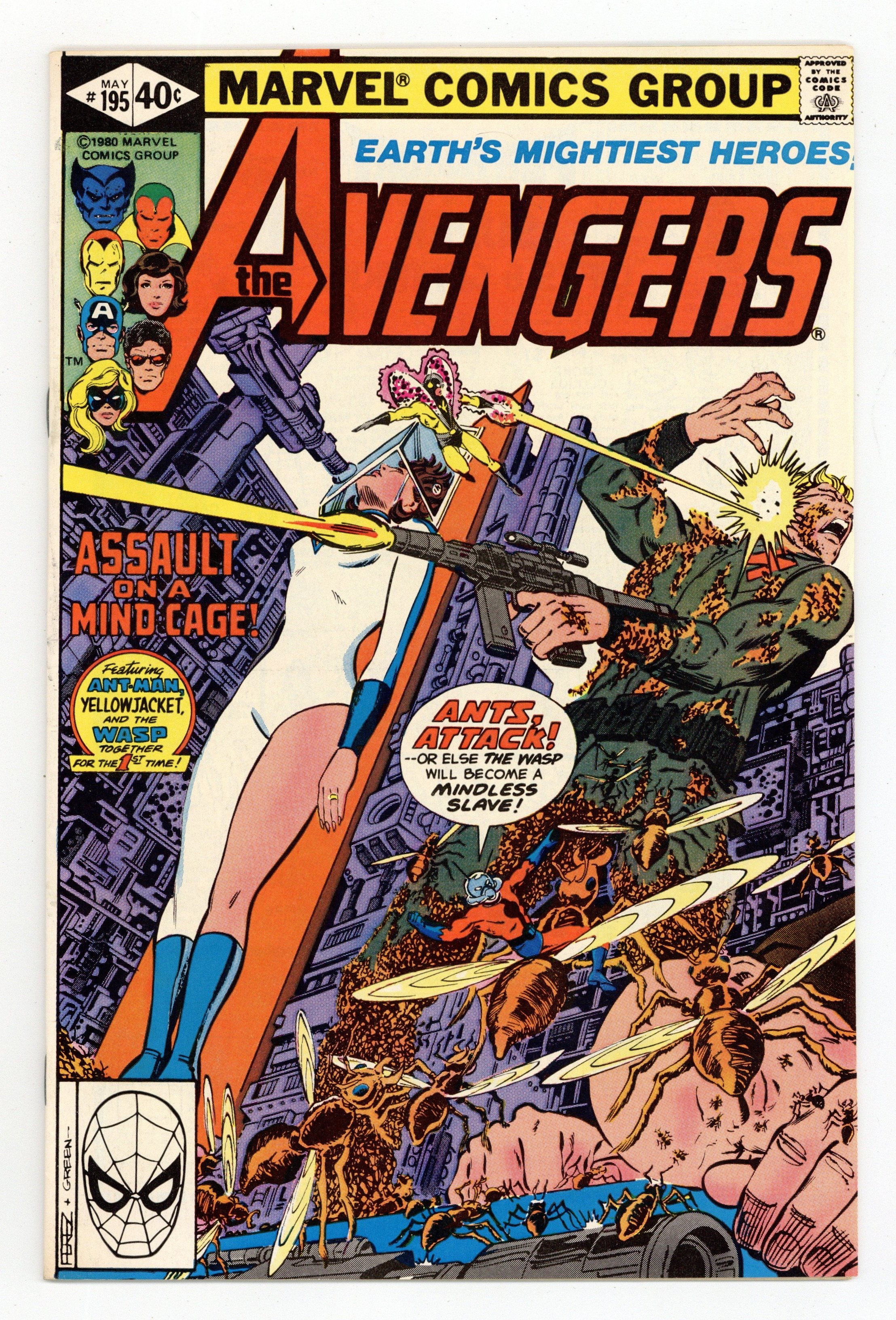 Tags: Marvel Legacy Numbering: Avengers (part 195), Avengers$11.00Direct Edition. "Assault on a Mind Cage!" Guest-starring Ant-Man. Script by David Michelinie. Pencils by George Perez. Inks by Jack Abel and Dan Green. Cover by George Perez and Dan Green. The Wasp has taken it upon herself to invade the Solomon Institute and find out what's going on inside! Unfortunately though, it's been several hours since anyone's heard from her! So Yellowjacket and Ant-Man (aka Scott Lang) infiltrate the institute, while the remaining avengers wait outside in the snow! The three insect-size heroes are having an easy time defeating all the guards in the asylum, but their fortunes dramatically change when the institute's head honcho arrives...the Taskmaster! First (cameo) appearance of the Taskmaster. Avengers Lineup: Beast, Captain America, Iron Man, Jocasta, Ms. Marvel, Vision, Wasp, Wonder Man, and Yellowjacket. 36 pages Cover price $0.40.