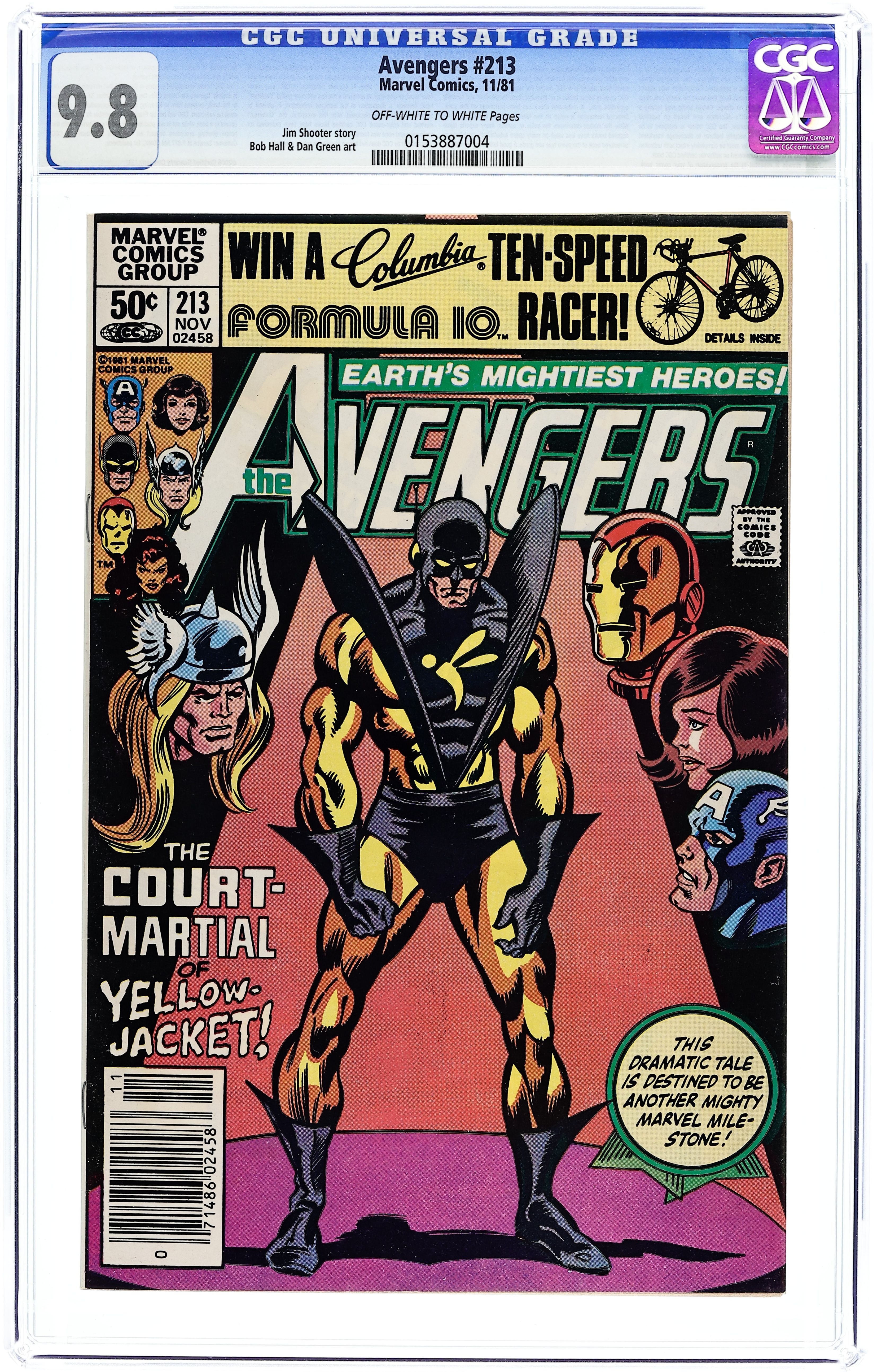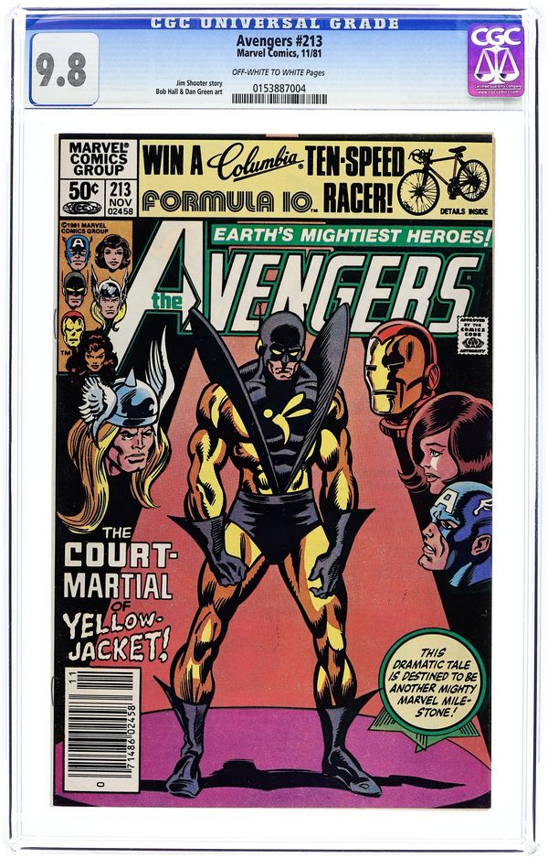 "Court Martial" Script by Jim Shooter. Pencils by Bob Hall. Inks by Dan Green. Cover by Bob Hall and Dan Green. Earth's Mightiest Heroes reach a low point in their proud history as one of the team's founding members, Hank Pym, faces court-martial following his brazen conduct last issue. Unfortunately, Yellowjacket has slipped further into delusion and builds a special adamantium robot to attack the Avengers during his court-martial. The Wasp intervenes at the last minute to save the day; but nothing will save Hank Pym's career or his marriage. A dark day indeed at Avengers Mansion. Flashback cameos by the Hulk, Vision, Grim Reaper, Ultron, and Jocasta to recap Hank Pym's history with the Avengers. (Note: The letters page includes a fan letter that details every costume the Wasp has worn to date.) 36 pages Cover price $0.50.
