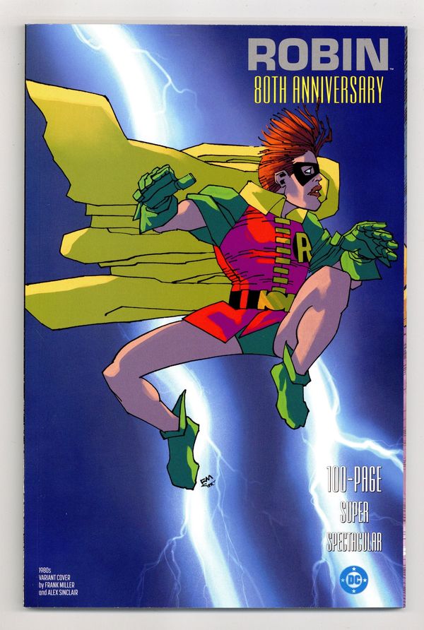 $8.50Cover by Frank Miller. Written by Marv Wolfman, Chuck Dixon, Devin Grayson, Tim Seeley, Tom King, Judd Winick, Adam Beechen, James Tynion IV, Amy Wolfram, Peter J. Tomasi and Robbie Thompson. Art by Tom Grummett, Scott McDaniel, Dan Jurgens, Mikel Janin, Dustin Nguyen, Freddie E. Williams II, Javier Fernandez, Damion Scott, Jorge Jimenez, Ramon Villalobos, Scott Hanna, Rob Hunter and Norm Rapmund. DC Comics celebrates Robin the Boy Wonder's 80th anniversary in style with an all-star creative team representing each iteration of the iconic character across eight decades of history! From the high-flying adventures of Dick Grayson to the tragedy of Jason Todd, the enthusiasm of Tim Drake and the arrogance of Damian Wayne, the persistence of Stephanie Brown and the rebelliousness of Carrie Kelley -- the mantle of Robin has been worn by many, but always represents one thing: a hero. Featuring: Dick Grayson, Robin in "A Little Nudge" by Marv Wolfman, Tom Grummett and Scott Hanna; Dick Grayson, Nightwing in "Aftershocks" by Chuck Dixon, Scott McDaniel and Rob Hunter; Nightwing and the Titans in "Team Building" by Devin Grayson, Dan Jurgens and Norm Rapmund; Dick Grayson, Agent 37 in "The Lesson Plan" by Tim Seeley, Tom King and Mikel Janin; Jason Todd, the Red Hood in "More Time" by Judd Winick and Dustin Nguyen; Tim Drake, Robin III in "Extra Credit" by Adam Beechen and Freddie E. Williams II; Tim Drake, Red Robin in "Boy Wonders" by James Tynion IV and Javier Fernandez; Stephanie Brown, Robin IV in "Fitting In" by Amy Wolfram and Damion Scott; the Super Sons in "My Best Friend" by Peter J. Tomasi and Jorge Jimenez; and Damian Wayne, Robin: Son of Batman in "Bat and Mouse" by Robbie Thompson and Ramon Villalobos. Plus: Red Hood and the Outlaws pin-up by Kenneth Rocafort; Stephanie Brown pin-up by Nicola Scott; Robins pin-up by Andy Kubert; and Carrie Kelley pin-up by Frank Miller. Cover price $9.99.