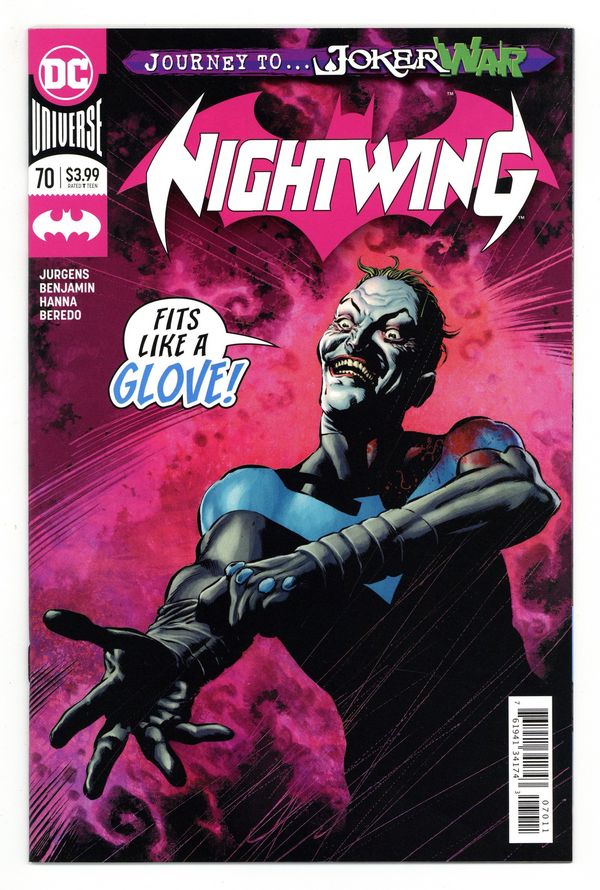 $18.00Journey to...Joker War - Written by Dan Jurgens. Art by Ryan Benjamin and Scott Hanna. Cover by Mike Perkins. How many Nightwings does it take for one Joker to strike to get to the real one? Four Nightwings. And that's not even the punchline-how will Ric interact with the Joker when he's not quite sure which one of his two memories is the real one…and exactly how dangerous this clown standing before him is? Cover price $3.99.