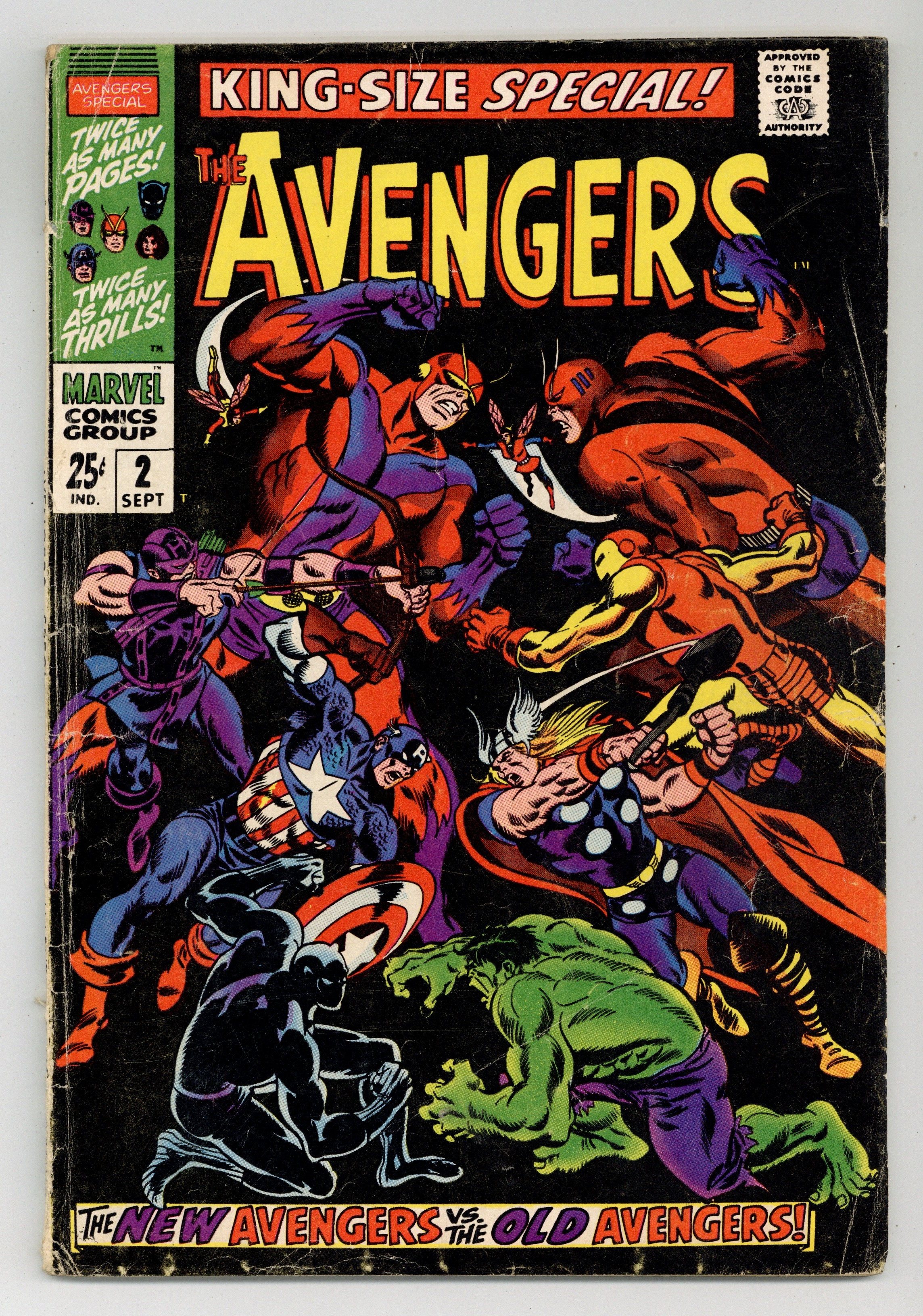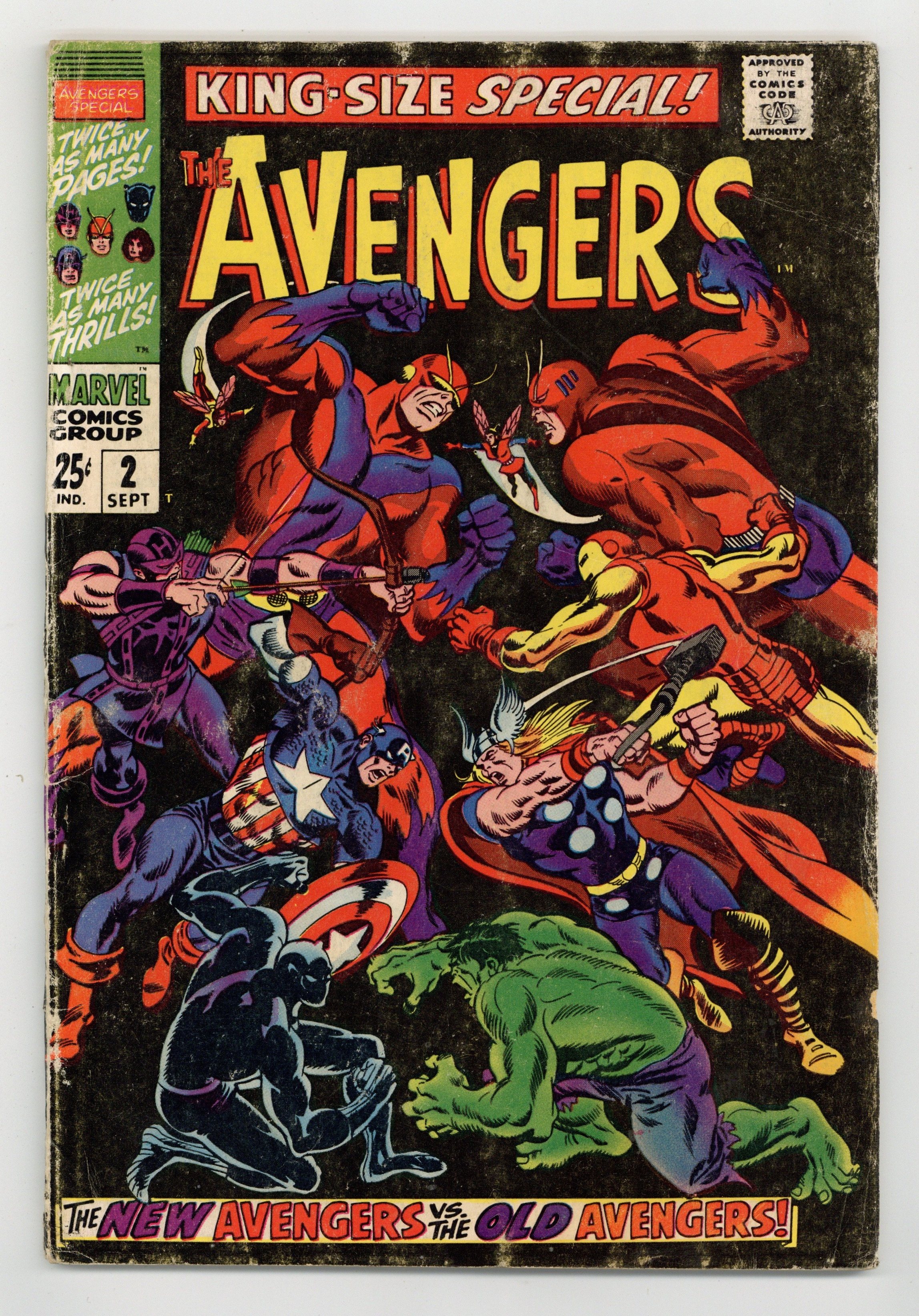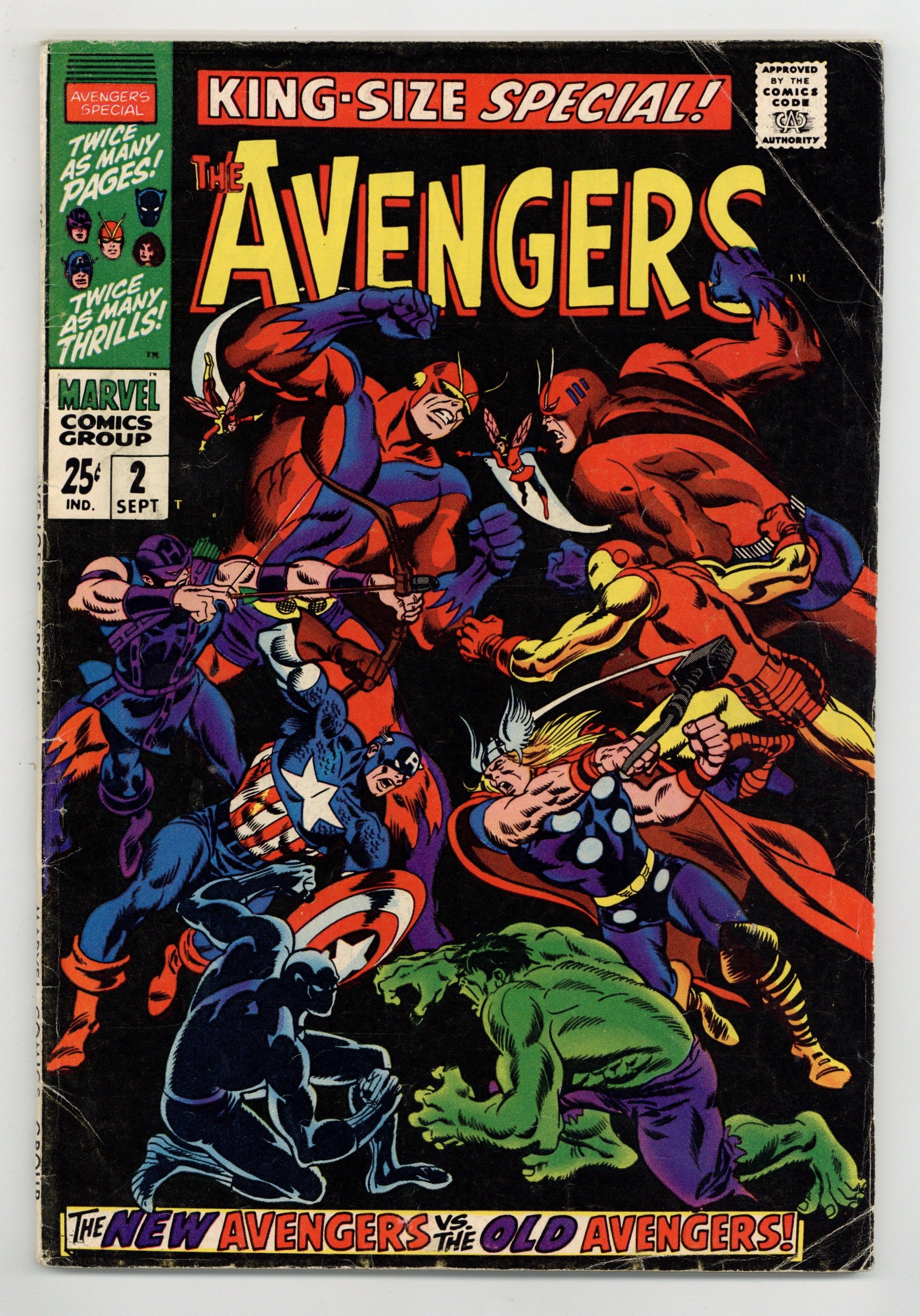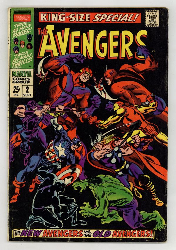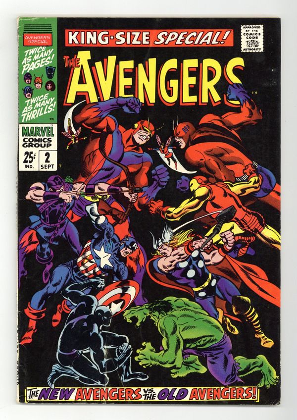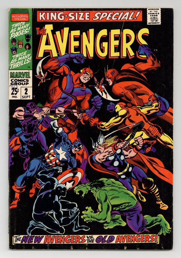 $60.00"...And Time, the Rushing River..." First appearance of the Scarlet Centurion. Script by Roy Thomas. Art by Don Heck (layouts) and Werner Roth (finishes). Inks by Vince Colletta. Cover by John Buscema and Frank Giacoia. Earth's Mightiest Heroes return to their mansion following the events of Avengers (1st series) #56. But upon entering their home -- they discover the original avengers inside: Thor, Iron Man, Giant-Man, the Wasp, and the Hulk! What is happening? After a brief skirmish with the original team, Cap and his group flee the mansion to collect their thoughts...and realize they may have stumbled into an alternate reality! Oh boy, now what? The Avengers' only hope is to find Doctor Doom's time machine (on this world)...and go back in time to reverse history. However the mighty and mysterious Scarlet Centurion stands in their way! Can Earth's Mightiest outsmart the future Kang? And return to their rightful reality? Cameo appearance by the Watcher. Flashback cameos by the Fantastic Four, Daredevil, Dr. Strange, Spider-Man, Sub-Mariner, and the original X-Men. Second feature: "Hang Loose, Heroes!" Beautiful Two-page pin-up of all the avengers to date by John Buscema, George Klein, and Bill Everett. Third feature: "Avenjerks Assemble!" Script by Roy Thomas. Pencils by John Buscema. Inks by Frank Giacoia. Five-page parody of the Marvel bullpen. Avengers Lineup: Black Panther, Captain America, Goliath, Hawkeye, and the Wasp. (Note: What If (1st series) #29 revisits the alternate reality warped by the Scarlet Centurion.) 68 pages. Cover price $0.25.