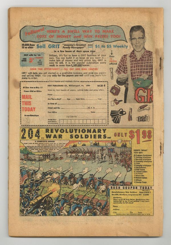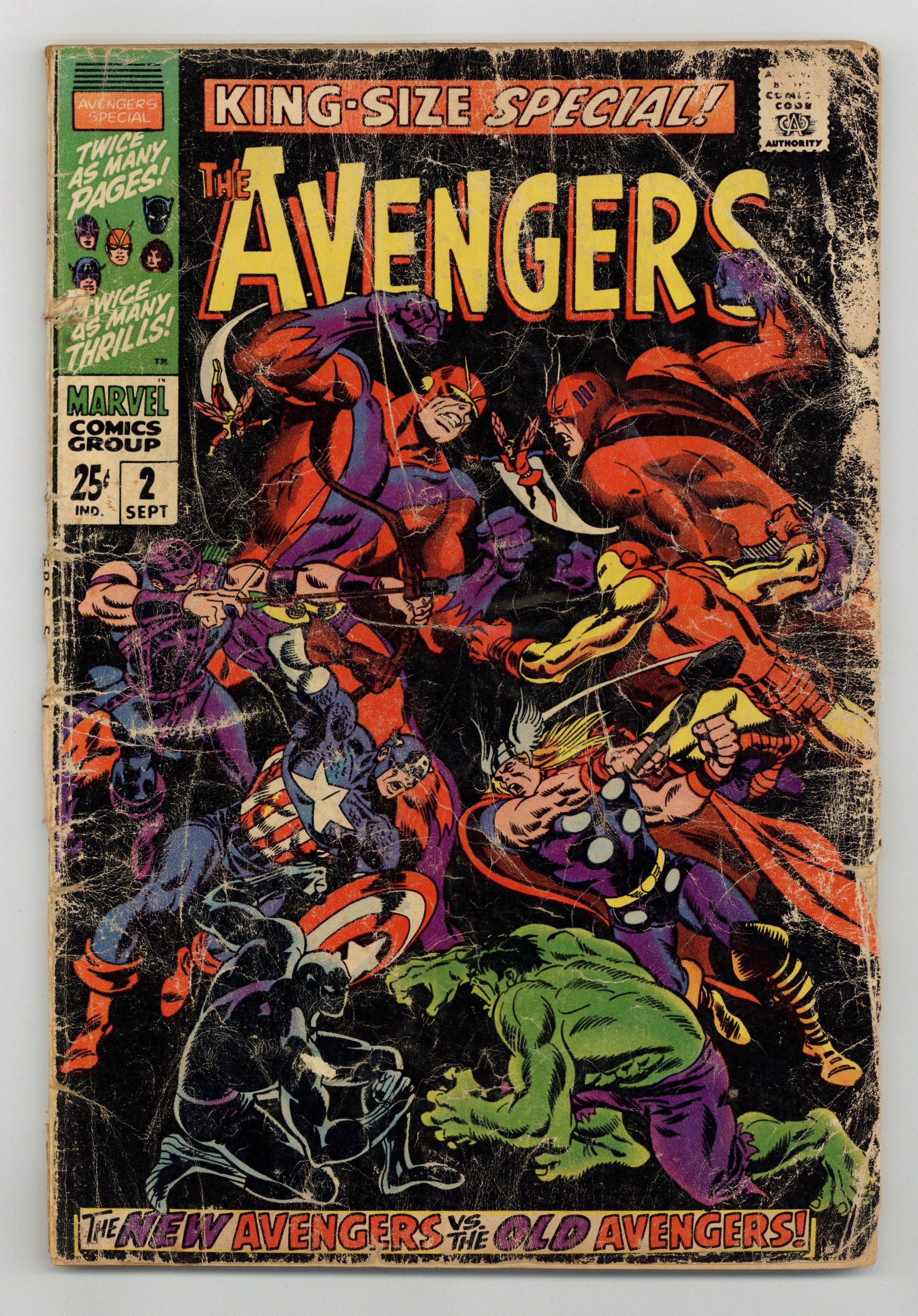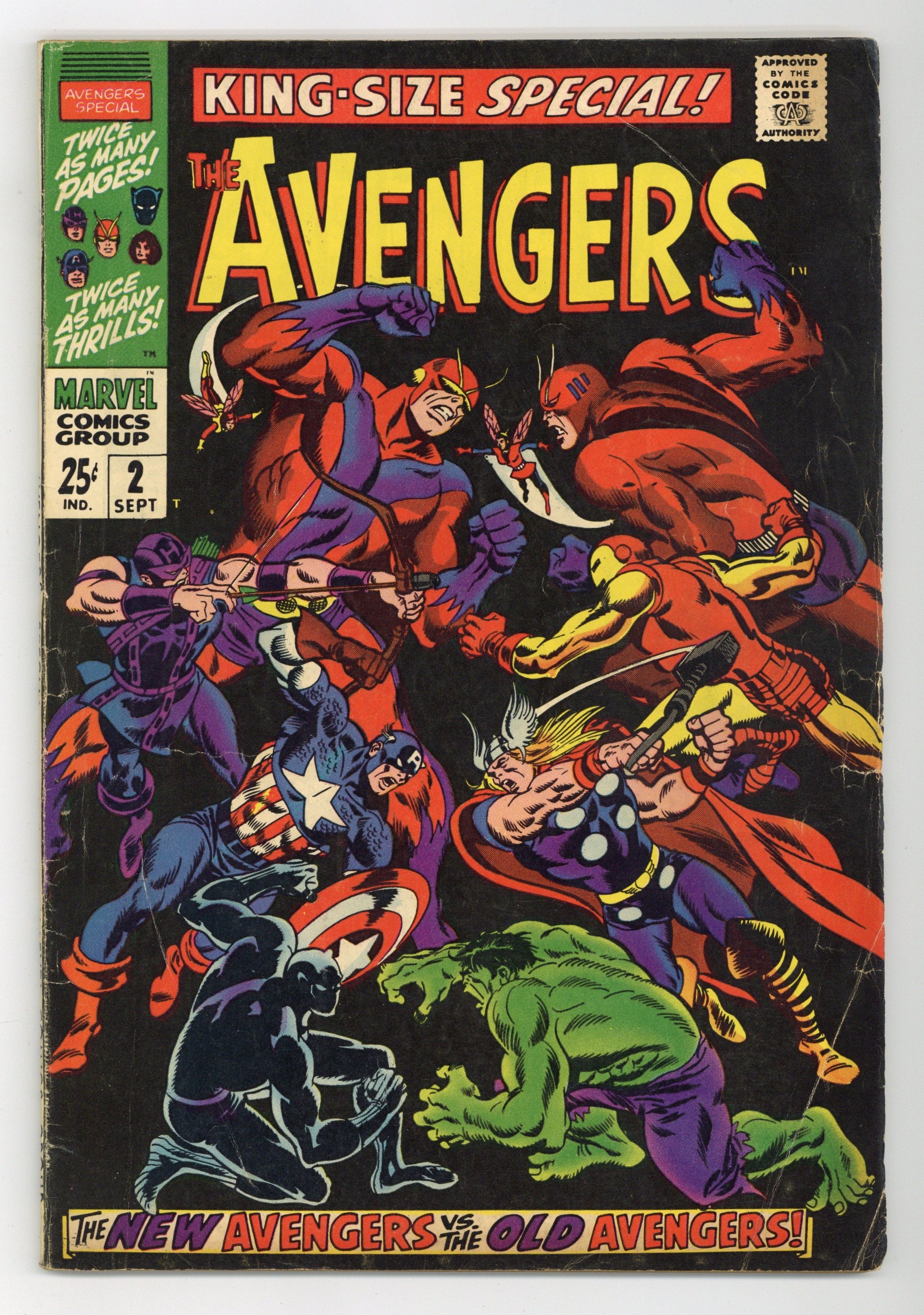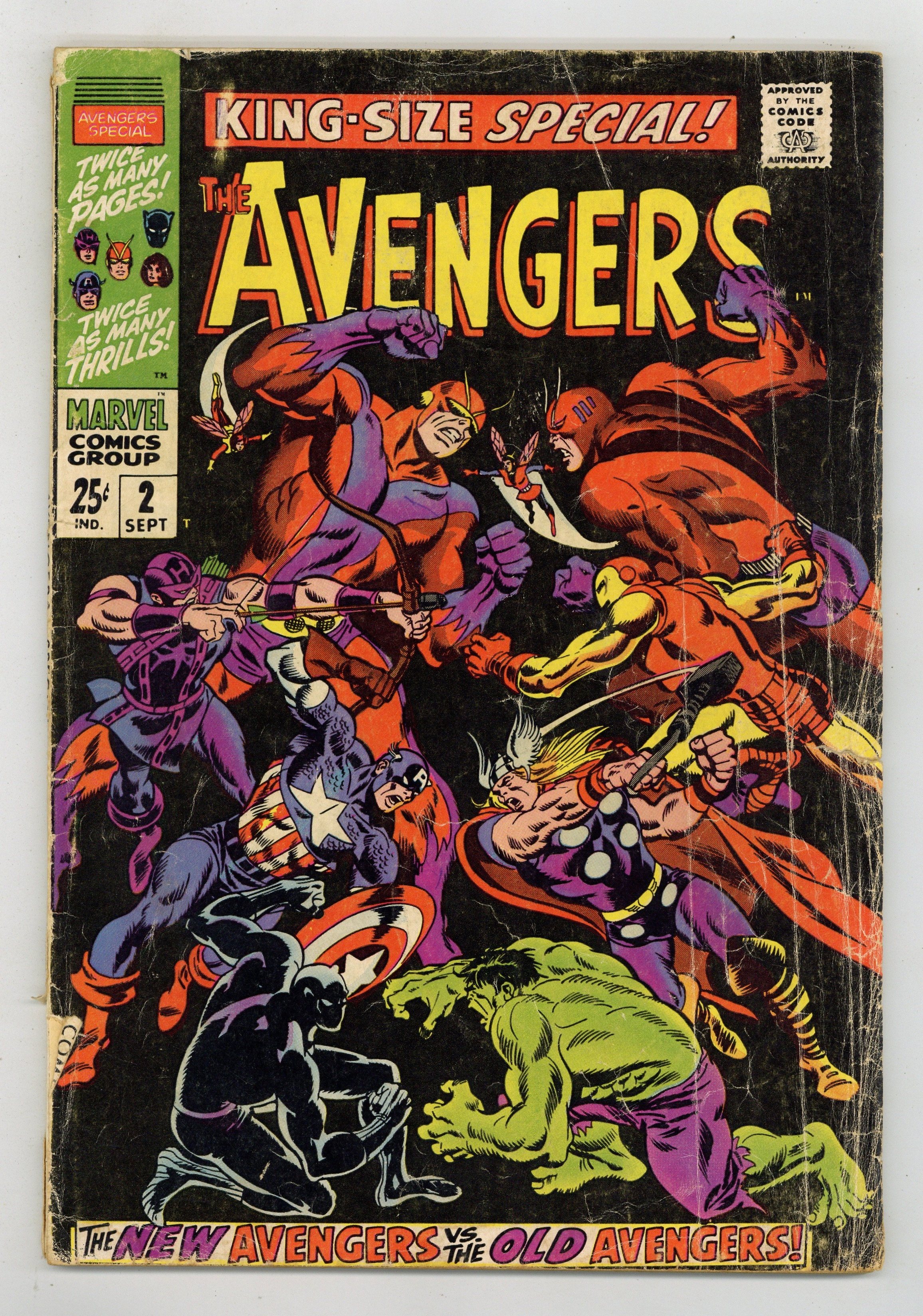 $60.00"...And Time, the Rushing River..." First appearance of the Scarlet Centurion. Script by Roy Thomas. Art by Don Heck (layouts) and Werner Roth (finishes). Inks by Vince Colletta. Cover by John Buscema and Frank Giacoia. Earth's Mightiest Heroes return to their mansion following the events of Avengers (1st series) #56. But upon entering their home -- they discover the original avengers inside: Thor, Iron Man, Giant-Man, the Wasp, and the Hulk! What is happening? After a brief skirmish with the original team, Cap and his group flee the mansion to collect their thoughts...and realize they may have stumbled into an alternate reality! Oh boy, now what? The Avengers' only hope is to find Doctor Doom's time machine (on this world)...and go back in time to reverse history. However the mighty and mysterious Scarlet Centurion stands in their way! Can Earth's Mightiest outsmart the future Kang? And return to their rightful reality? Cameo appearance by the Watcher. Flashback cameos by the Fantastic Four, Daredevil, Dr. Strange, Spider-Man, Sub-Mariner, and the original X-Men. Second feature: "Hang Loose, Heroes!" Beautiful Two-page pin-up of all the avengers to date by John Buscema, George Klein, and Bill Everett. Third feature: "Avenjerks Assemble!" Script by Roy Thomas. Pencils by John Buscema. Inks by Frank Giacoia. Five-page parody of the Marvel bullpen. Avengers Lineup: Black Panther, Captain America, Goliath, Hawkeye, and the Wasp. (Note: What If (1st series) #29 revisits the alternate reality warped by the Scarlet Centurion.) 68 pages. Cover price $0.25.