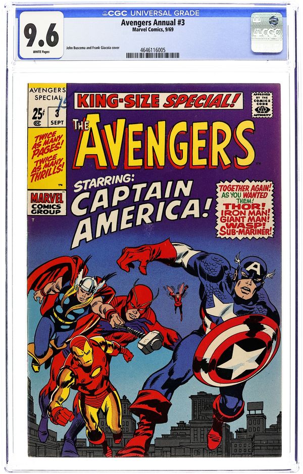 This annual features four reprint stories and a new cover by John Buscema and Frank Giacoia. First story reprinted from Avengers (1st series) 4: "Captain America Joins the Avengers!" Script by Stan Lee. Pencils by Jack Kirby. Inks by George Roussos. The first silver age appearance of Captain America! With inadvertent aid from the Sub-Mariner, the Avengers find the frozen body of Captain America drifting aimlessly in the North Sea! And at that very moment...the legend of the star-spangled avenger is born! Second story reprinted from Tales of Suspense 66: "The Fantastic Origin of the Red Skull" Script by Stan Lee. Pencils by Jack Kirby. Inks by Chic Stone. The Red Skull tells his origin to his star-spangled prisoner, Captain America. Third story reprinted from Tales of Suspense 67: "Lest Tyranny Triumph!" Script by Stan Lee. Pencils by Jack Kirby. Inks by Frank Ray (aka Frank Giacoia). Under the mental control of the skull, Captain America invades the Allied Headquarters in London! But his loyal partner, Bucky, will try to stop him from accidentally shooting the Allied Supreme Commander! Fourth story reprinted from Tales of Suspense 68: "The Sentinel and the Spy!" Script by Stan Lee. Pencils by Jack Kirby. Inks by Frank Ray. The shield-slinger and Bucky foil the Red Skull's plans...not once but twice! 68 pgs. Cover price $0.25.
