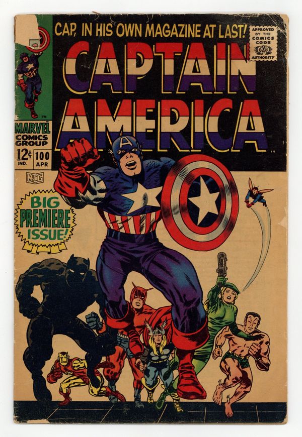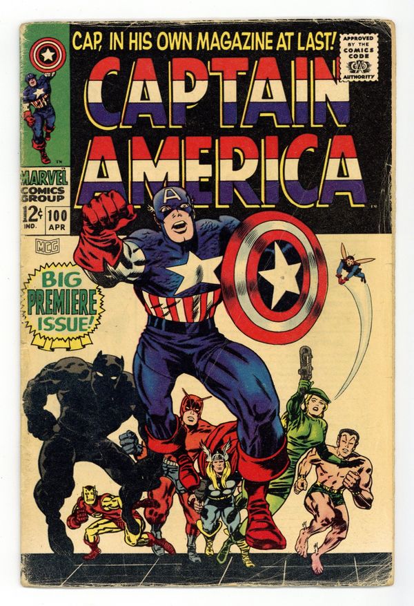 Cover pencils by Jack Kirby, inks by Syd Shores and Joe Sinnott. First issue, continued from Tales of Suspense 99. Origin of Captain America retold, as originally depicted in Avengers #4, in "This Monster Unmasked!", script by Stan Lee, pencils by Jack Kirby, inks by Syd Shores; Baron Zemo orders Agent 13, who is posing as female spy Irma Kruhl, to execute Captain America and Black Panther; Zemo plans to use a solar ray to destroy America; Agent 13, Captain America and Black Pather battle Zemos robot, Destructon. Brief Nick Fury appearance. Cameos by the Avengers and the Sub-Mariner. 36 pgs., full color. $0.12. Cover price $0.12.
