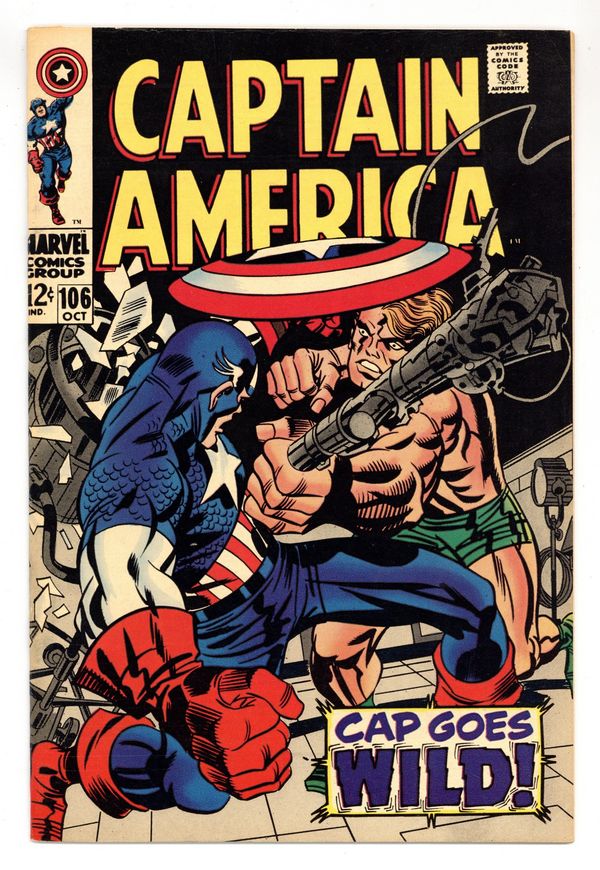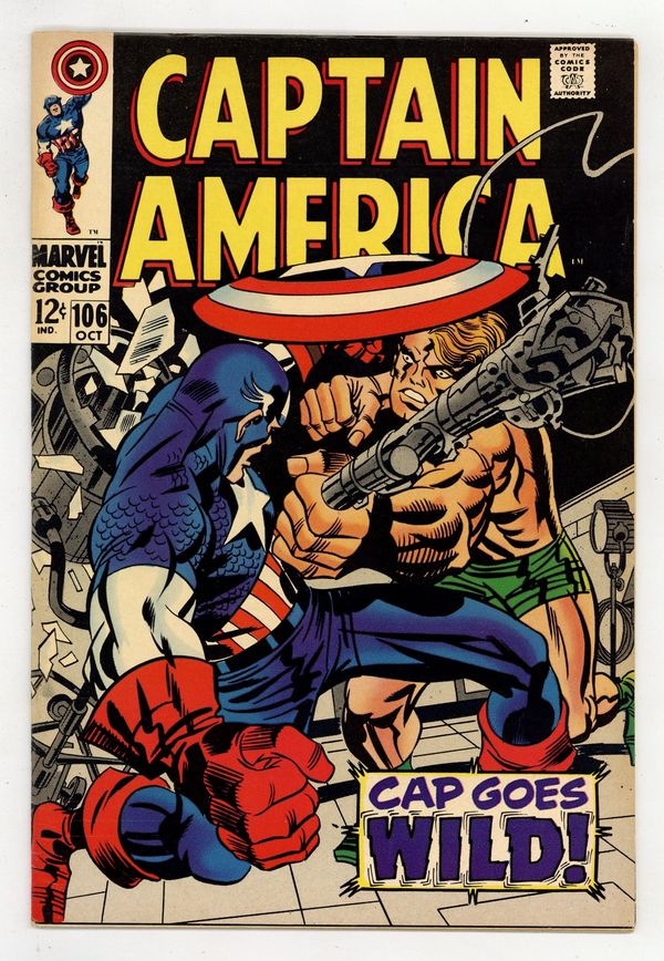 Tags: Marvel Legacy Numbering: Captain America (part 106), Captain America$49.00Cover pencils by Jack Kirby, inks by Frank Giacoia. "Cap Goes Wild!", script by Stan Lee, pencils by Jack Kirby, inks by Frank Giacoia; Costumed Asian spies attack SHIELD headquarters and steal the plans for the latest prototype model of the Life Model Decoy for what they call Operation: Replica, which Chairman Mao oversees; Captain America tries to stop them; Infinity Productions film company is working on a Captain America movie. Letter to the editor from writer Dwight Decker. 36 pgs., full color. $0.12. Cover price $0.12.