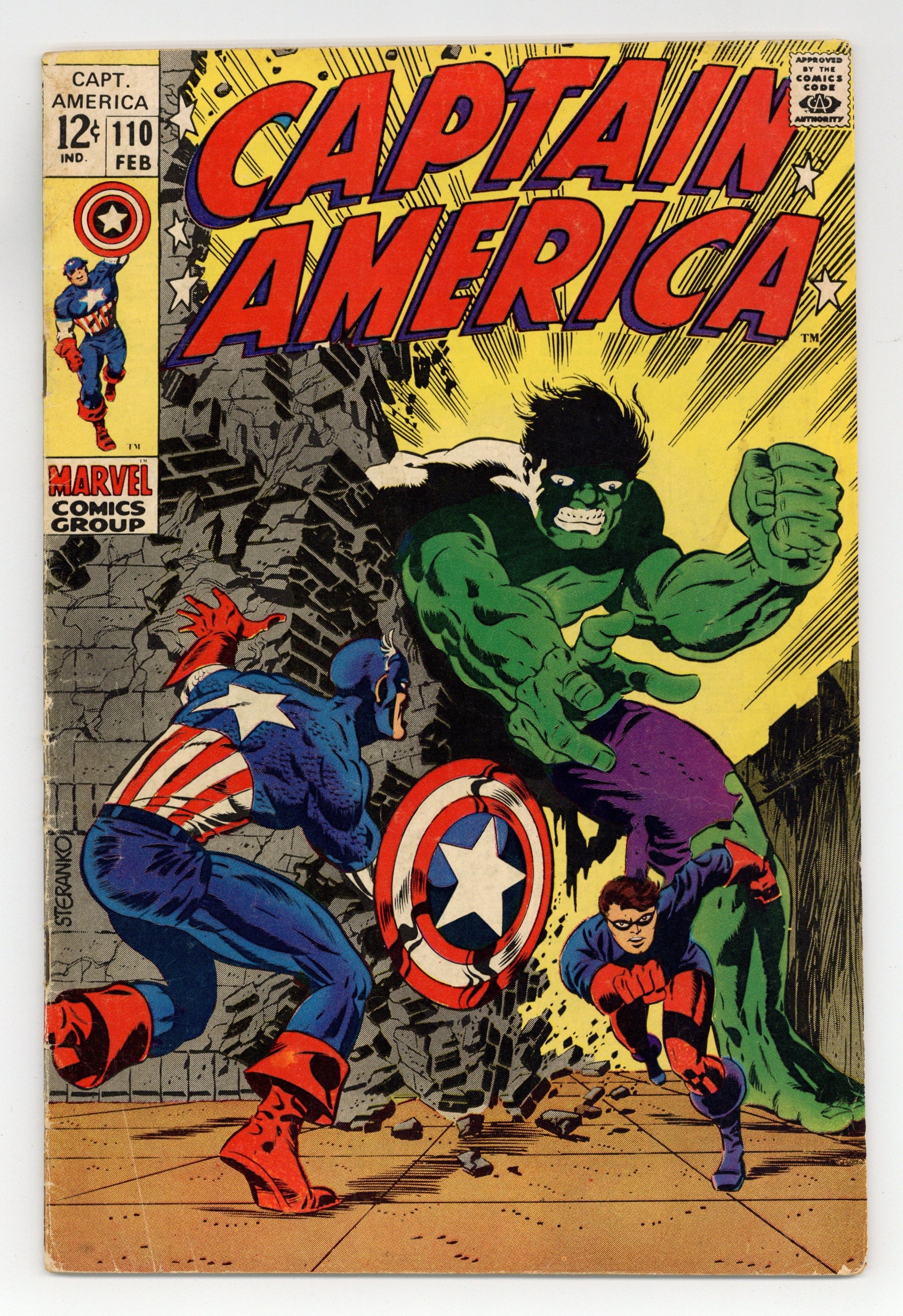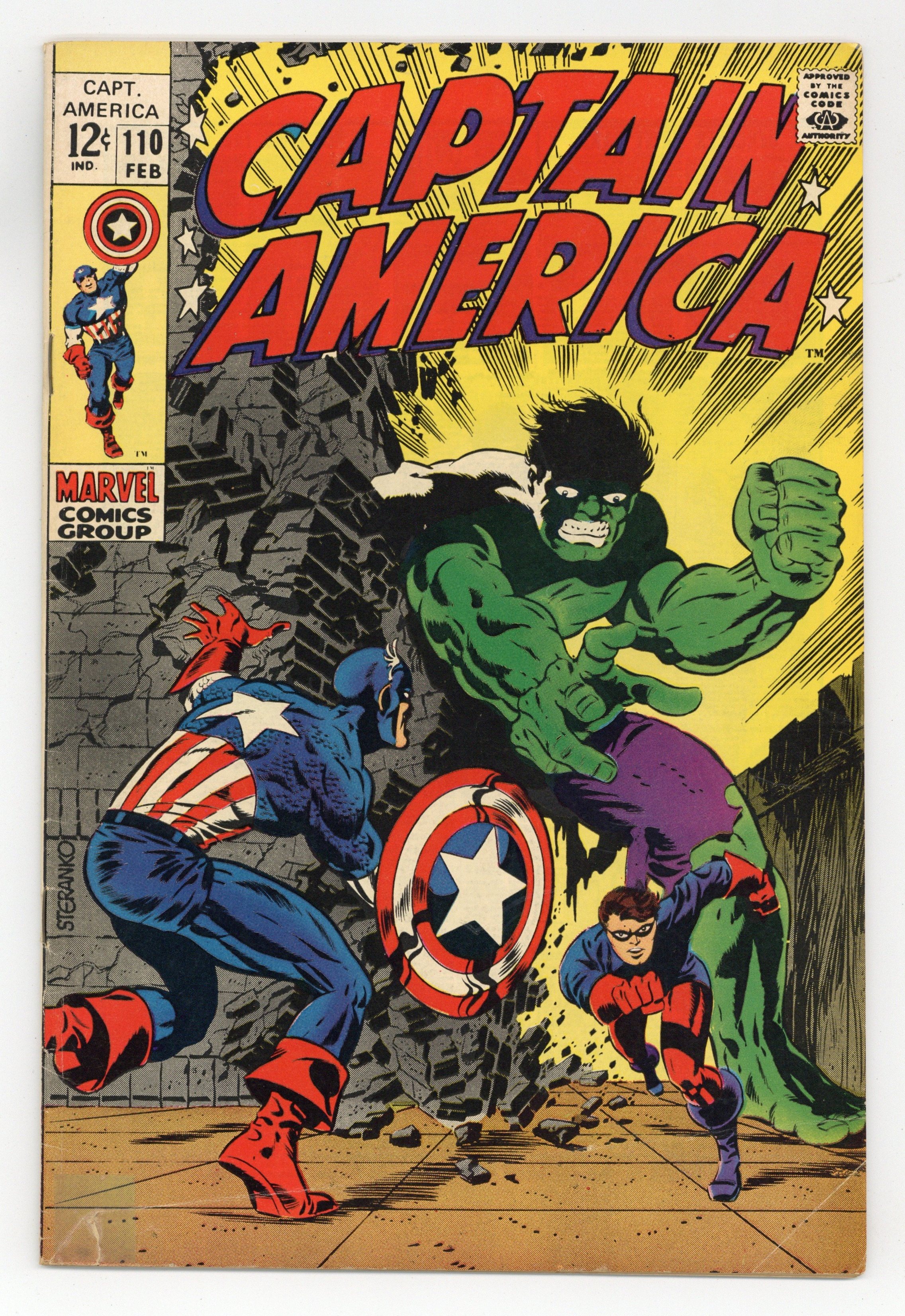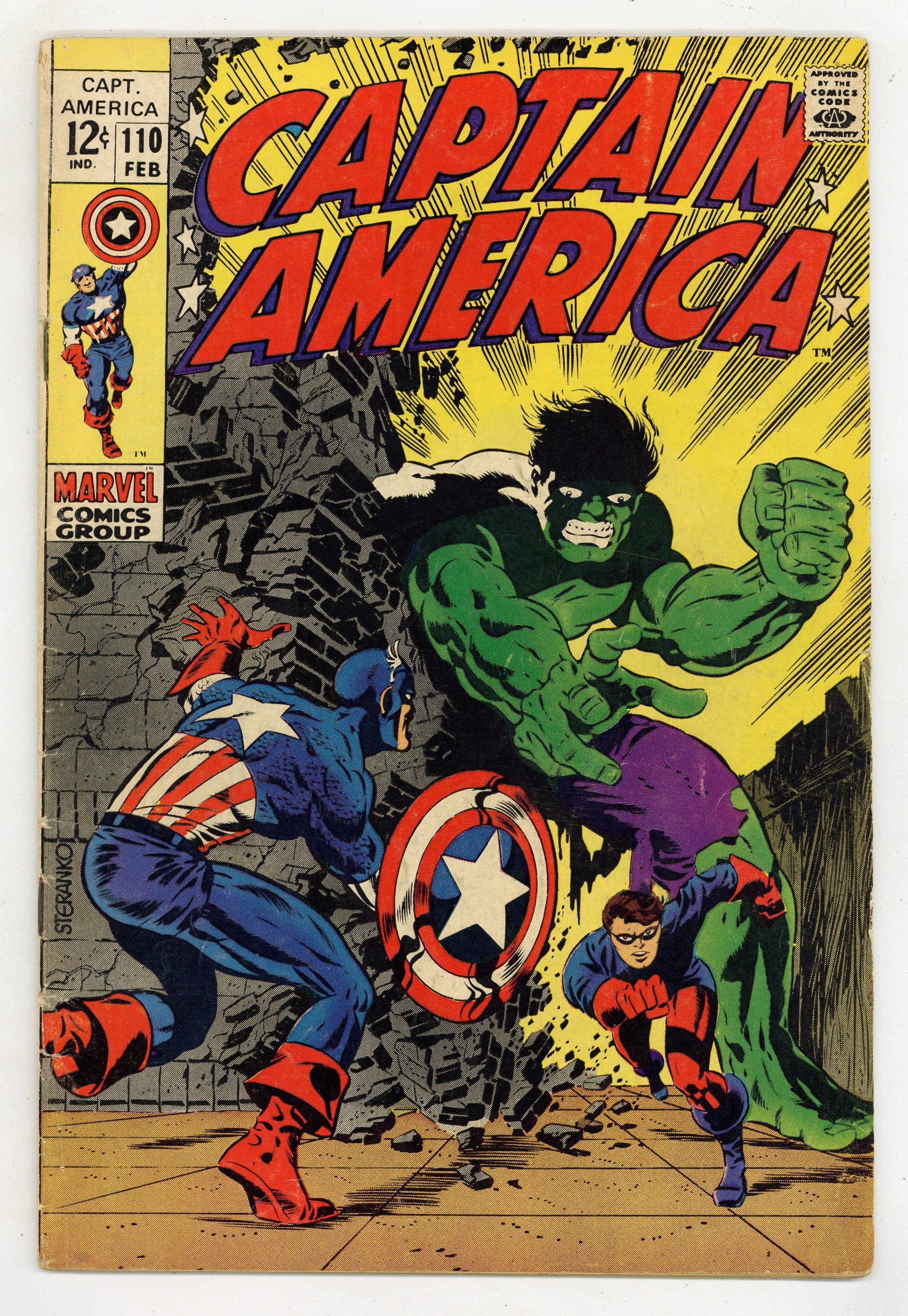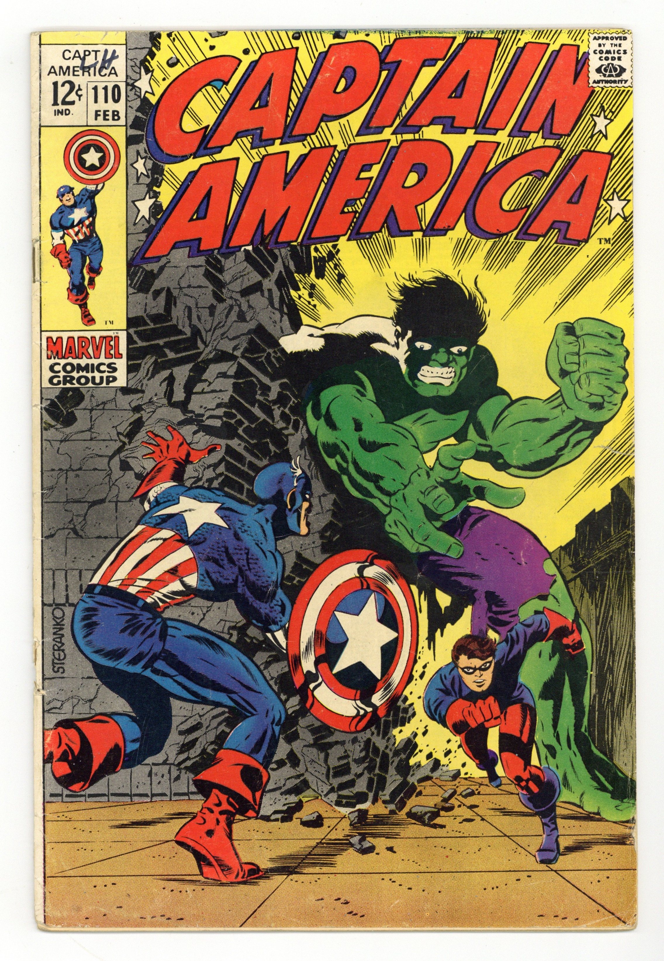 Tags: Marvel Legacy Numbering: Captain America (part 110), Captain America$95.00Cover by Jim Steranko. Rick Jones becomes Cap's partner in "No Longer Alone!", script by Jim Steranko (plot) and Stan Lee (dialogue), pencils by Jim Steranko, inks by Joe Sinnott; Cap runs across the Hulk on a rampage in NYC; The Hulk escapes and Cap vows Rick must never put himself in danger until the monster can be tamed. Back at Avengers Mansion Rick finds Bucky Barnes' old uniform, and rejects Cap's protests against wearing it; After putting him off for years, Cap finally accepts Rick officially as his new partner; Almost immediately they uncover a plot by HYDRA to contaminate the city's water supply. After a series of battles the HYDRA goons are driven off, and Cap tells Rick he survived his "baptism of fire" like a man. 36 pgs., full color. NOTE: 1st appearance of Madame Hydra Cover price $0.12.