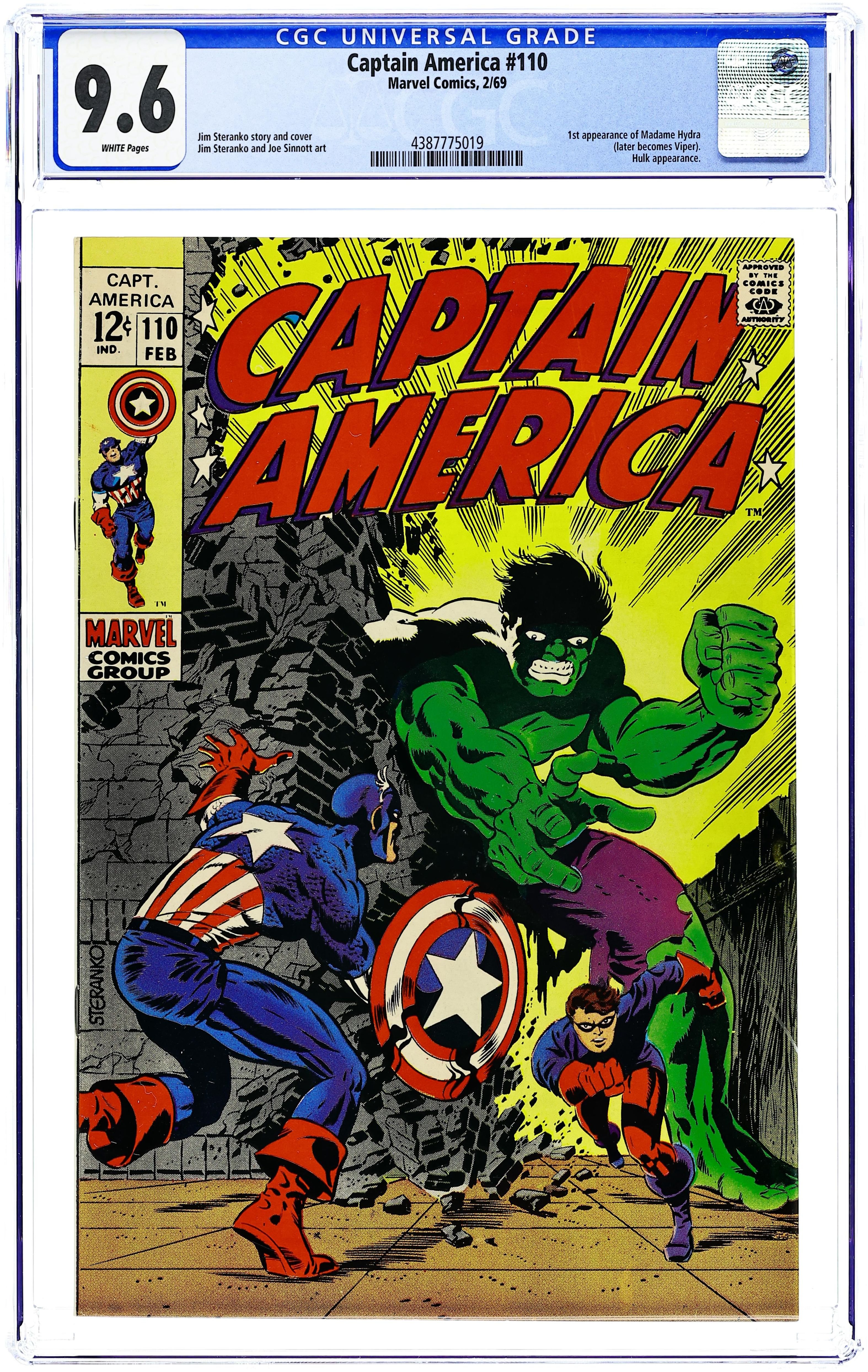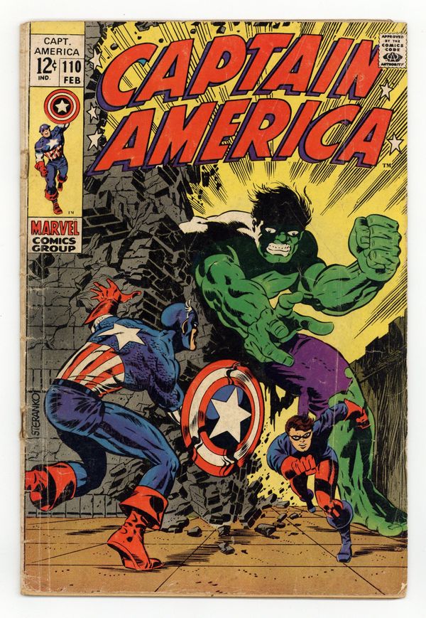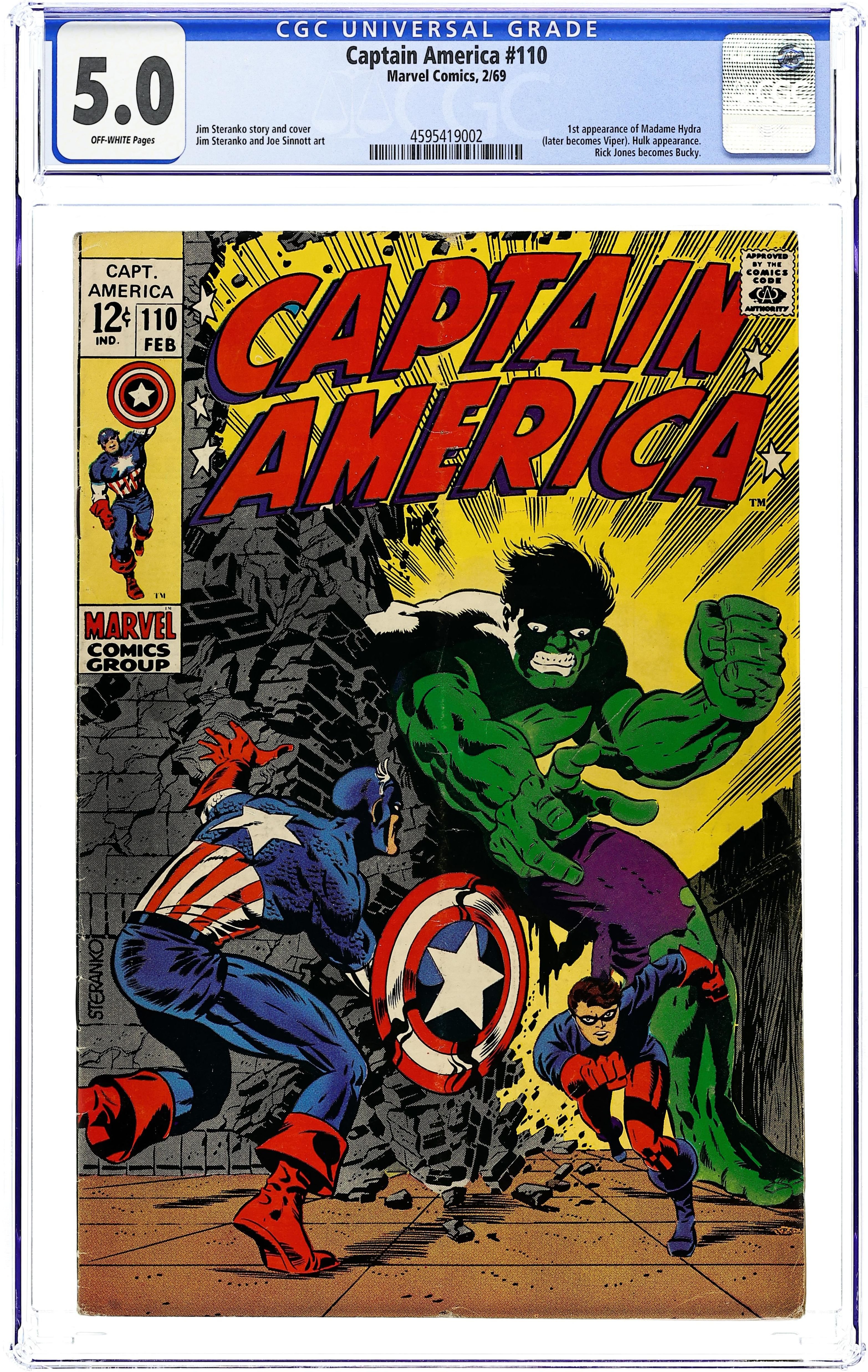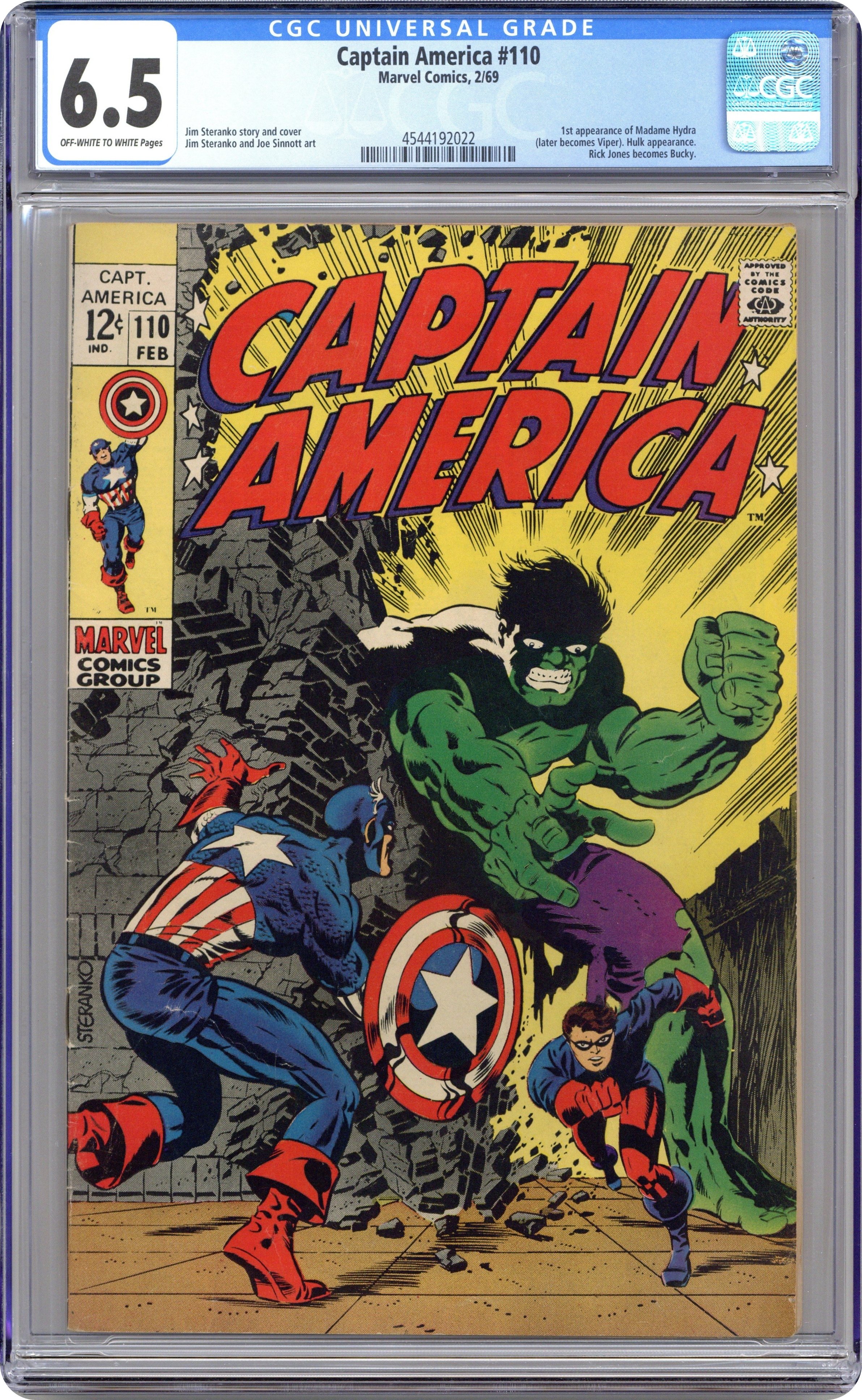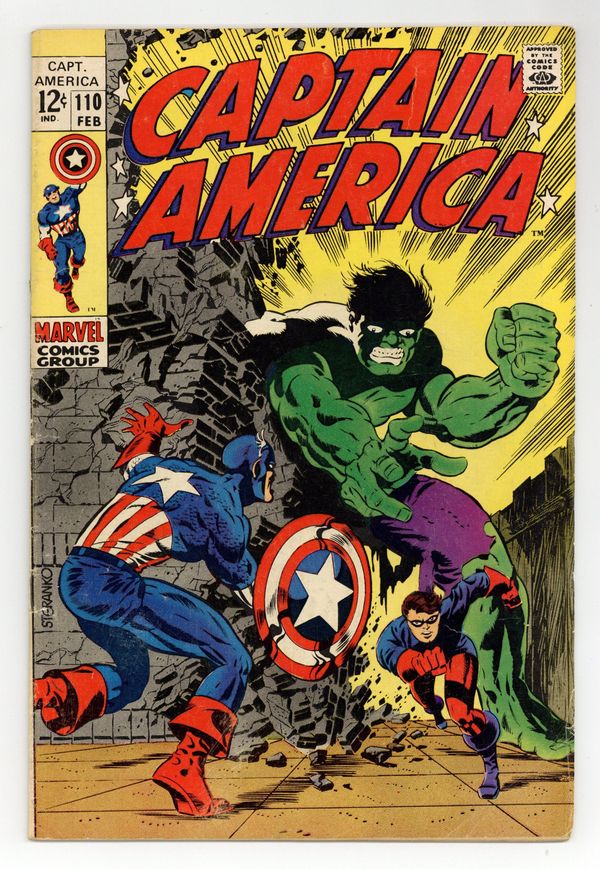 Tags: Marvel Legacy Numbering: Captain America (part 110), Captain America$95.00Cover by Jim Steranko. Rick Jones becomes Cap's partner in "No Longer Alone!", script by Jim Steranko (plot) and Stan Lee (dialogue), pencils by Jim Steranko, inks by Joe Sinnott; Cap runs across the Hulk on a rampage in NYC; The Hulk escapes and Cap vows Rick must never put himself in danger until the monster can be tamed. Back at Avengers Mansion Rick finds Bucky Barnes' old uniform, and rejects Cap's protests against wearing it; After putting him off for years, Cap finally accepts Rick officially as his new partner; Almost immediately they uncover a plot by HYDRA to contaminate the city's water supply. After a series of battles the HYDRA goons are driven off, and Cap tells Rick he survived his "baptism of fire" like a man. 36 pgs., full color. NOTE: 1st appearance of Madame Hydra Cover price $0.12.