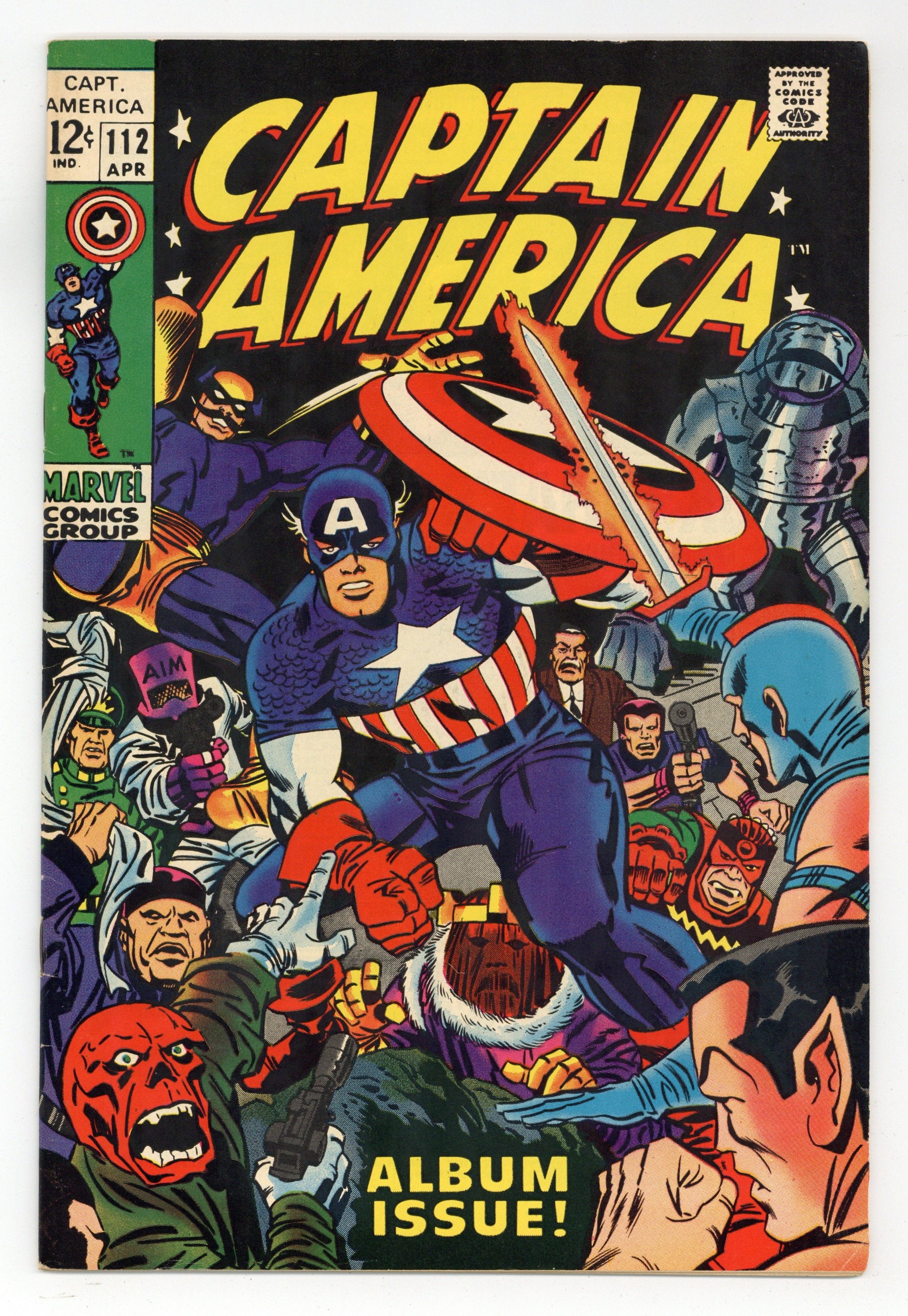 Tags: Marvel Legacy Numbering: Captain America (part 112), Captain America$31.00Cover pencils by Jack Kirby, inks by Frank Giacoia. "Lest We Forget!", script by Stan Lee, pencils by Jack Kirby (Jack did the art for this issue in a single 24 hour marathon!), inks by George Tuska; After Hydra attacks at a carnival, Captain Americas uniform, riddled with bullets, convinces everyone that Cap is dead; At Avengers Mansion, Iron Man prepares a statement saying Cap is dead; Reminiscing on Captain America's heroic feats during World War II, Iron Man recalls how Cap and Bucky battles the Red Skull, including a story in which Cap and Bucky ruined the Red Skulls plot to use a giant power drill; He also recalls Cap clashes with such villains as the Butterfly, the original Circus of Crime, the Unholy Legion of Beggars, White Death, the Toadman, and Baron Zemo; Cameo by Red Skull imposter George Maxon; Tony Stark (Iron Man) narrates this story. 36 pgs., full color. $0.12. Cover price $0.12.