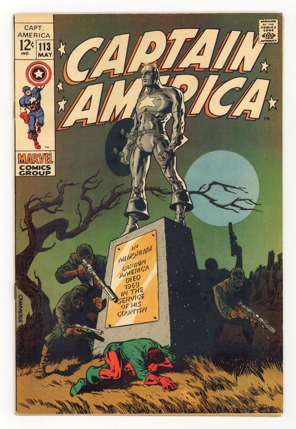 Tags: Marvel Legacy Numbering: Captain America (part 113), Captain America$74.00Cover by Jim Steranko. "The Strange Death of Captain America," script by Jim Steranko (plot) and Stan Lee (dialogue), pencils by Jim Steranko, inks by Tom Palmer and Jim Steranko; The news reports Cap's death and explains that "Steve Rogers" was a fake identity while Madame Hydra has Cap's HYDRA file burned; A flashback reveals how she replaced Baron Strucker as head of the organization; The Avengers, Nick Fury, Sharon Carter and several SHIELD agents hold a wake but are suddenly gassed by HYDRA; Rick follows to the cemetery and is almost caught, but Cap unexpectedly appears on a motorcycle, very much alive!; A battle follows, ending when a set of missiles miss their target and kill Madame Hydra; Cap reveals he faked his death in order to retain his secret identity. Appearances by the Vivion, the Black Panther, Iron Man, Hawkeye, and Thor. 36 pgs., full color. $0.12. Cover price $0.12.