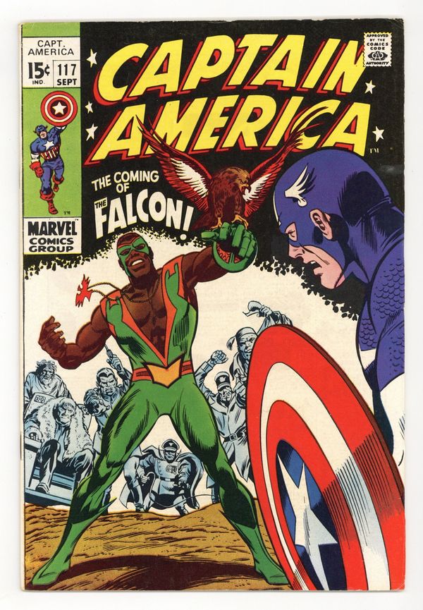 Cover pencils by Gene Colan and John Romita (alterations), inks by Joe Sinnott and John Romita (alterations). First appearance and origin of the Falcon in "The Coming of... the Falcon!", script by Stan Lee, pencils by Gene Colan, inks by Joe Sinnott; With the Red Skull previously having switched bodies with Captain America, the Skull uses the Cosmic Cube to send Cap to the tropical island home of the Exiles; There Cap encounters a falconer from Harlem who had been hired by the Exiles but who is now attempting to help the island natives kick the Exiles from their home; Cap joins forces with the falconer who, with Cap's urging, dons a costume and takes the name the Falcon. Letter to the editor from writer James Van Hise. 36 pgs., full color. $0.15. Cover price $0.15.