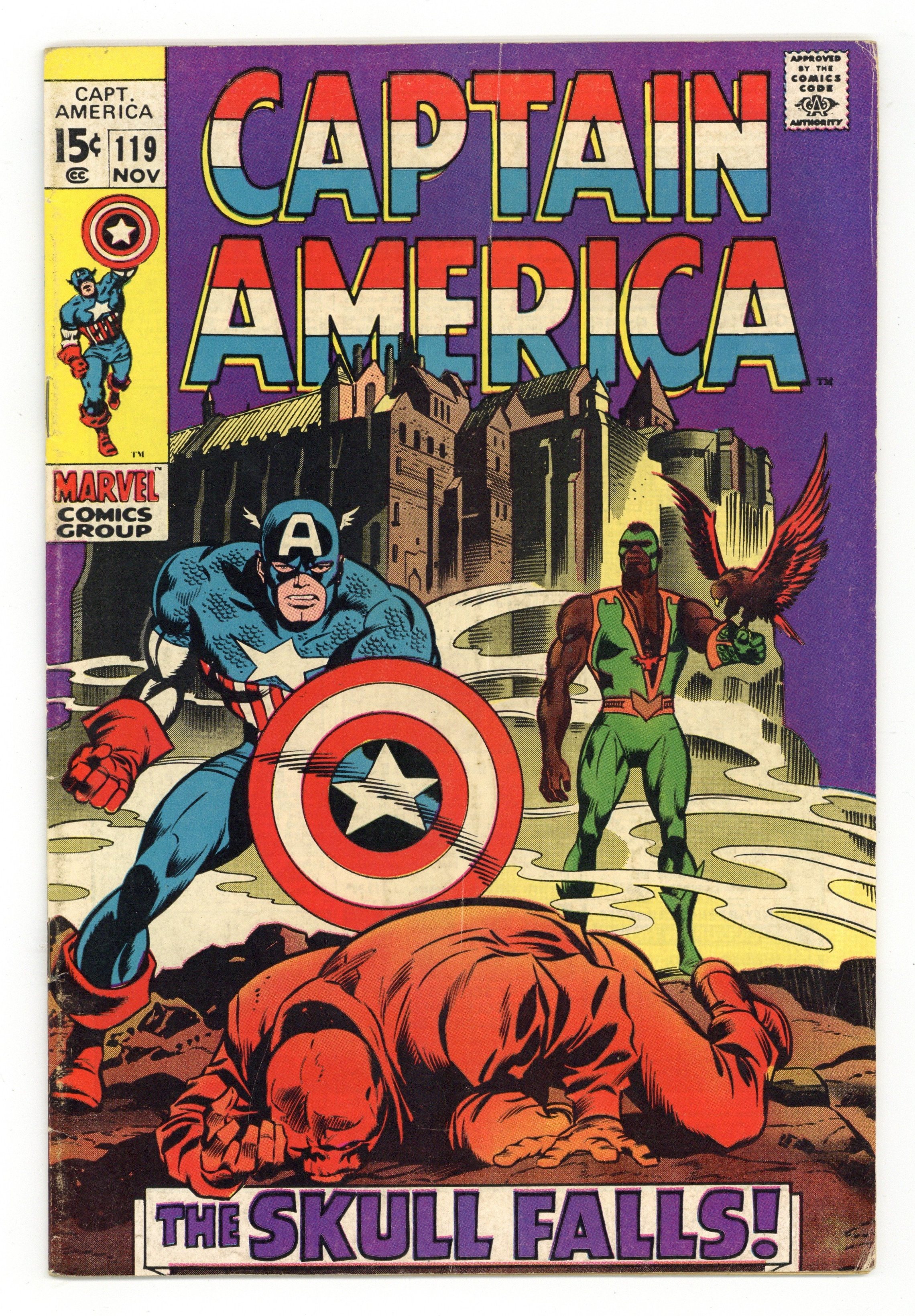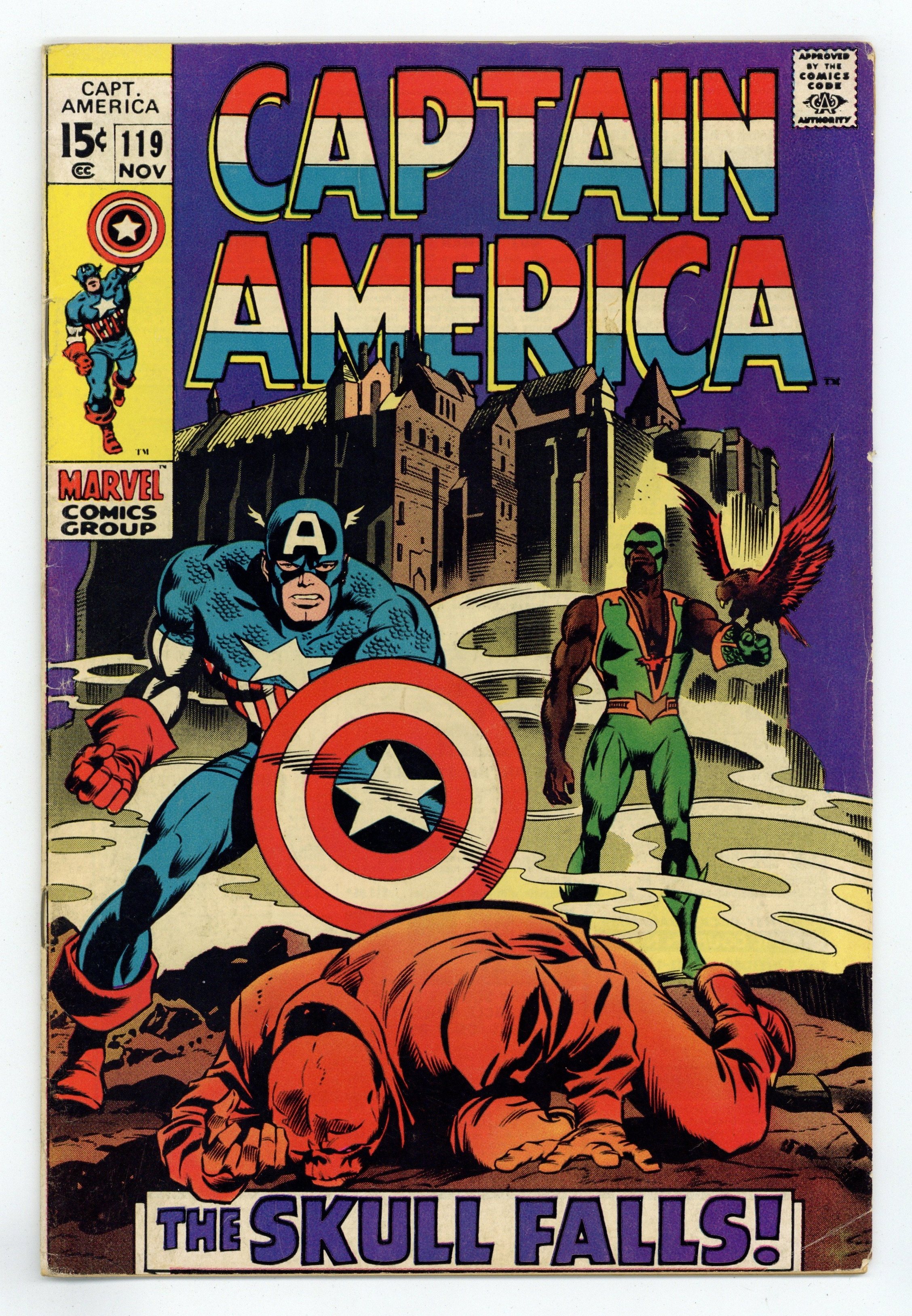 Tags: Marvel Legacy Numbering: Captain America (part 119), Captain America$32.50Cover pencils by Gene Colan, inks by Joe Sinnott. The dramatic conclusion to the story that began back in issue 115 in "Now Falls the Skull!", script by Stan Lee, pencils by Gene Colan, inks by Joe Sinnott; The Red Skull uses the Cosmic Cube to change bodies back with Captain America; Falcon realizes the man who he has been working with is Captain America; The Skull uses the Cube to toy with Cap and the Falcon during their battle; Elsewhere, MODOK activates his newly-created Catholite Block to disrupt the power of the Cosmic Cube; The Red Skull uses the remaining power of the Cube to disappear. Letter to the editor from writer Alan Brennert. 36 pgs., full color. $0.15. Cover price $0.15.