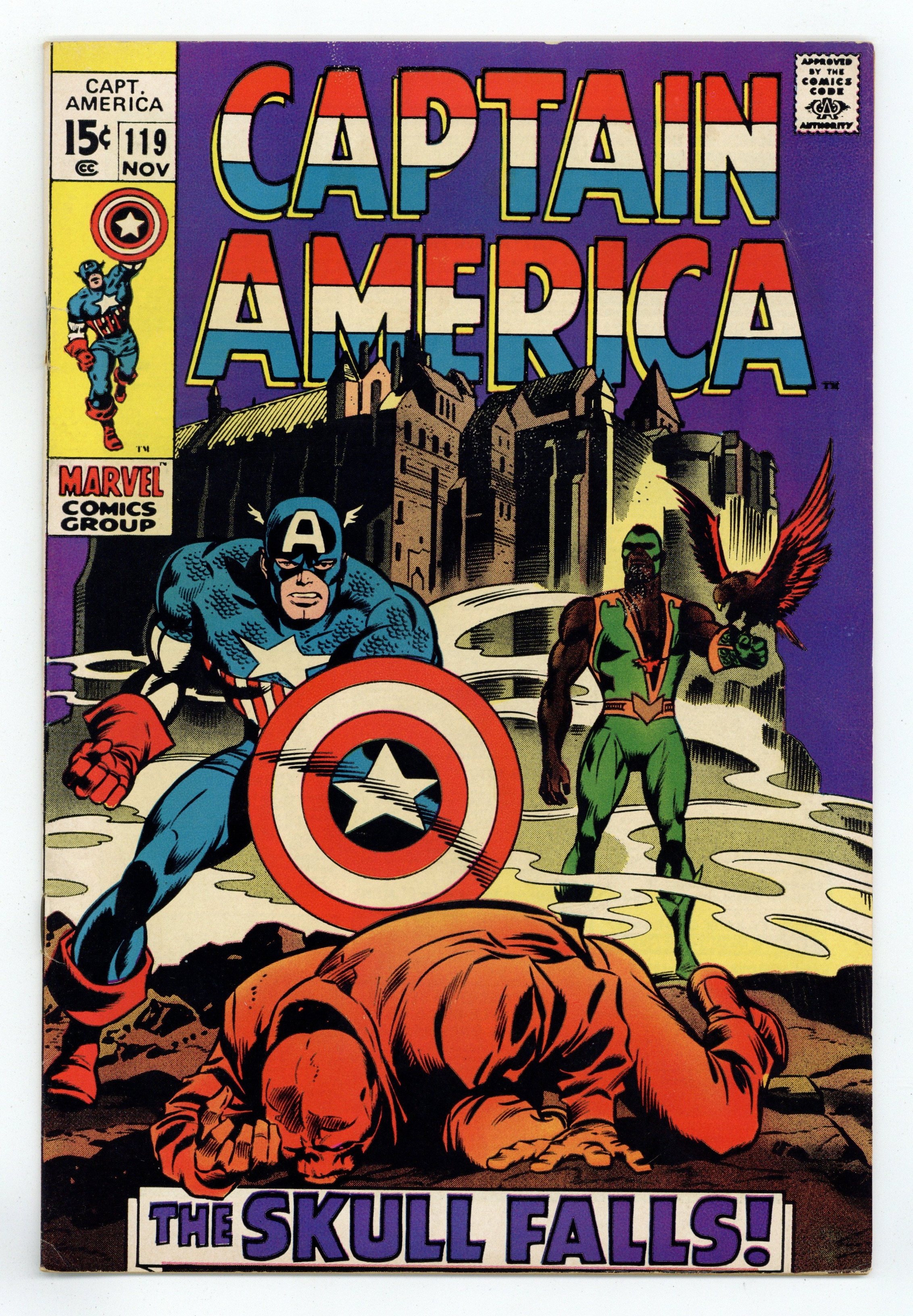 Cover pencils by Gene Colan, inks by Joe Sinnott. The dramatic conclusion to the story that began back in issue 115 in "Now Falls the Skull!", script by Stan Lee, pencils by Gene Colan, inks by Joe Sinnott; The Red Skull uses the Cosmic Cube to change bodies back with Captain America; Falcon realizes the man who he has been working with is Captain America; The Skull uses the Cube to toy with Cap and the Falcon during their battle; Elsewhere, MODOK activates his newly-created Catholite Block to disrupt the power of the Cosmic Cube; The Red Skull uses the remaining power of the Cube to disappear. Letter to the editor from writer Alan Brennert. 36 pgs., full color. $0.15. Cover price $0.15.