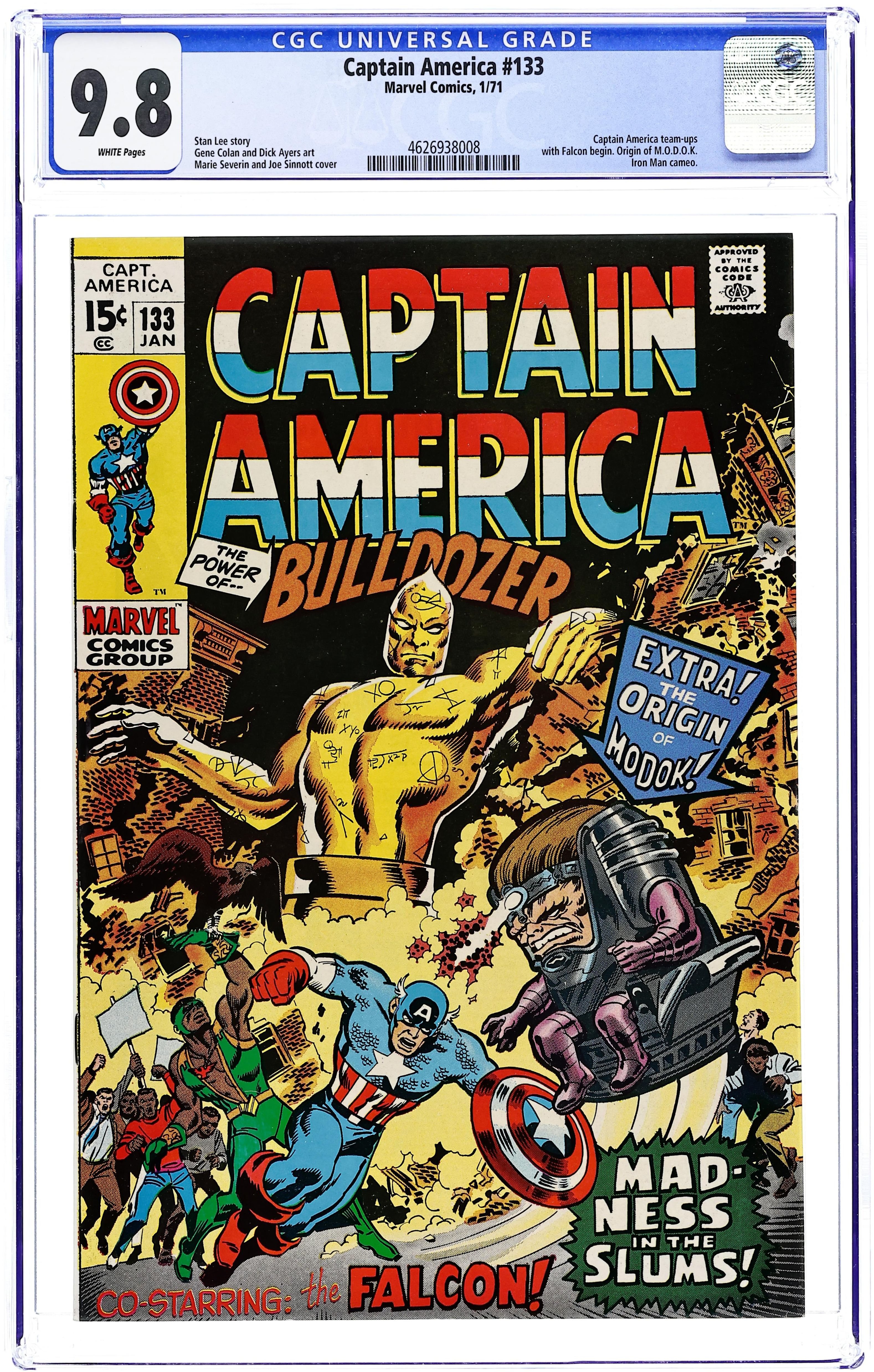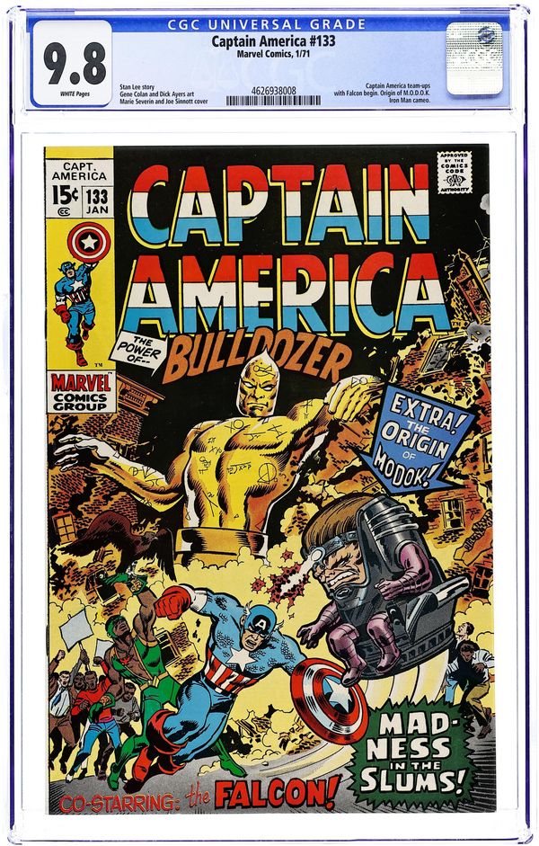 Cover pencils by Marie Severin, inks by Sal Buscema. The Falcon becomes Cap's partner in "Madness in the Slums!", script by Stan Lee, pencils by Gene Colan, inks by Dick Ayers; Modok's origin is revealed as a former AIM scientist who was turned against his will into the grotesque living computer; Modok creates the Bulldozer robot and sends it to Harlem to tear down the slums in order to gain the residents' favor while discrediting Captain America; Cap and the Falcon defeat the Bulldozer and Modok. Brief appearance by Tony Stark (Iron Man). Ad for Thor #183. 36 pgs., full color. $0.15. Cover price $0.15.
