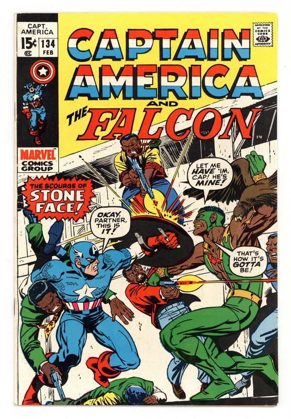Cover pencils by Marie Severin and John Romita (alterations), inks by Herb Trimpe and John Romita (alterations). "They Call Him - Stone-Face!", script by Stan Lee, pencils by Gene Colan, inks by Dick Ayers; Captain America and the Falcon defeat two punks who are running a protection racket on a Harlem shopkeeper; Their boss is Stone-Face, a gang lord nicknamed for his partially paralyzed face; Falcons nephew Jody Casper works as a numbers runner for the crime lord; Jody stops by Sam Wilsons office and rejects his uncles advice to avoid the racket; Jody gets arrested, and Cap joins Sam and Jodys mom in recommending leniency; Jody is given a suspended sentence and believes that Captain America works for Stone-Face; Cap and the Falcon battle Stone-Face. 36 pgs., full color. $0.15. Cover price $0.15.