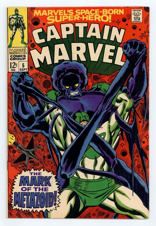 Cover pencils by Don Heck. The Mark of the Metazoid," script by Arnold Drake, pencils by Don Heck, inks by John Tartaglione; Aboard the Kree vessel over the Earth, Mar-Vell is put on trial by Yon-Rogg for being "Un-Kree" by allowing the Sub-Mariner to win a battle and prevent the people of Earth from being infected with bacteria (as seen last issue); However, after much consideration, Ronan decides to judge Mar-Vell based on his future actions in being able to carry out his mission; He orders Mar-Vell to kill Mr. Logan the one man who may hint at Mar-Vell's identity; Mar-Vell gets out of killing Logan by suggesting that killing Logan would attract unwanted attention and erasing his memory would be better; Ronan agrees and allows Mar-Vell to see things his own way; Back on Earth, Communist agents are plotting to capture Walter Lawson by sending their latest super-powered agent the Metazoid--a being mutated to have the metabolism of 50 men--to capture Lawson. Meanwhile, Mar-Vell returns to Earth and assumes his identity as Lawson. Letter to the editor from comics historian Peter Sanderson. 36 pgs., full color. Cover price $0.12.