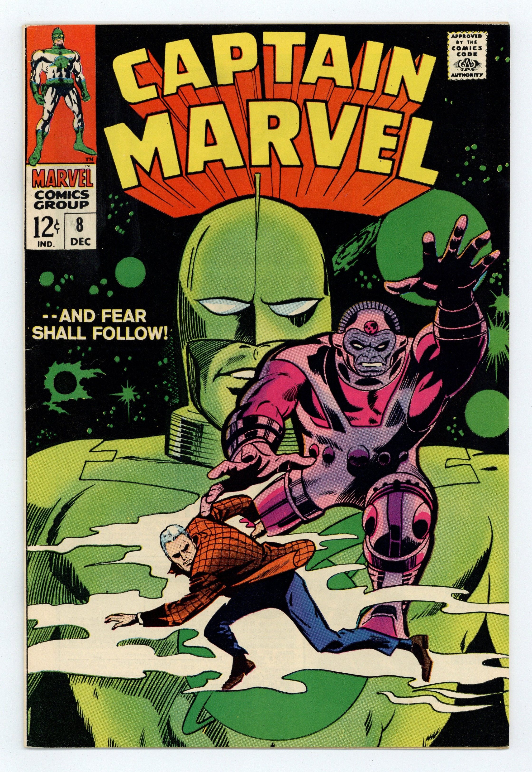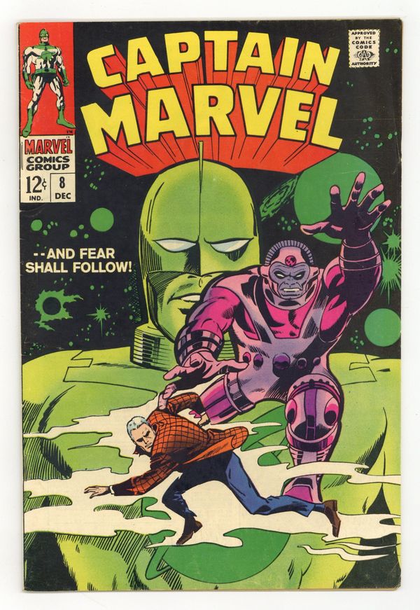 Cover pencils by Gene Colan, inks by Vince Colletta. "And Fear Shall Follow!", script by Arnold Drake, pencils by Don Heck, inks by Vince Colletta; When a trading vessel piloted by members of the Aakon race, they detect a Kree vessel in proximity to the planet Earth; As age old enemies of the Kree, the Aakon decide to land on the dark side of the moon to avoid detection; However, their effort proves too late and Yon-Rogg orders his men to attack the Aakon, in spite of Mar-Vell's warnings that it wouldn't be a good idea; During the battle on the Moon, Yon-Rogg is injured in combat, and Mar-Vell is forced to kill the Aakon leader in order to save his superior, and both parties flee the scene of the battle; Mar-Vell assumes temporary control of the Kree vessel while Yon-Rogg is injured, however he soon returns to Earth; On Earth, Mar-Vell decides to investigate the home of the late Walter Lawson to turn up clues about the man's past, partially for Carol Danvers, and partially for his own curiosity. When he finds a secret lab where something big and humanoid is being constructed, Mar-Vell is attacked by members of the Organization, who had commissioned Lawson to build a robot to be their perfect assassin for them. 36 pgs., full color. Cover price $0.12.