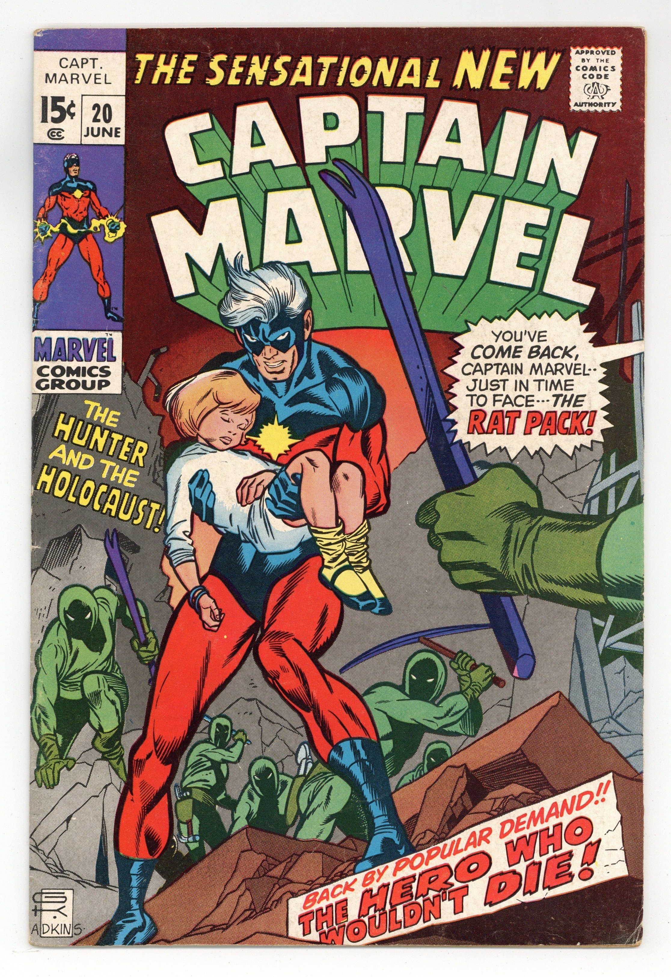 Cover pencils by Gil Kane, inks by Dan Adkins. "The Hunter and the Holocaust!", script by Roy Thomas, pencils by Gil Kane, inks by Dan Adkins; After playing a number of gigs in New York, Rick Jones is once more met by Mordecai P. Boggs; He offers the opportunity to be Rick's promoter, which Rick once more declines; Later in his apartment, Rick (with the help of Mar-Vell) manage to stop some muggers trying to rob someone in their building; During the fight Rick comes up with a possible solution to separate themselves and free Mar-Vell from the Negative Zone: his old friend Bruce Banner; The two decide to try and track down Banner, first by searching his old hidden labs in the Nevada desert; Along the way they pass through a disaster zone, where Mar-Vell is compelled to stop and help people out, save a little girl, and stop a group of looters known as the Rat Pack from capitalizing on the disaster zone; Brief appearance by the Hulk. Letter to the editor from comic artist Alan Kupperberg. 36 pgs., full color. Cover price $0.15.