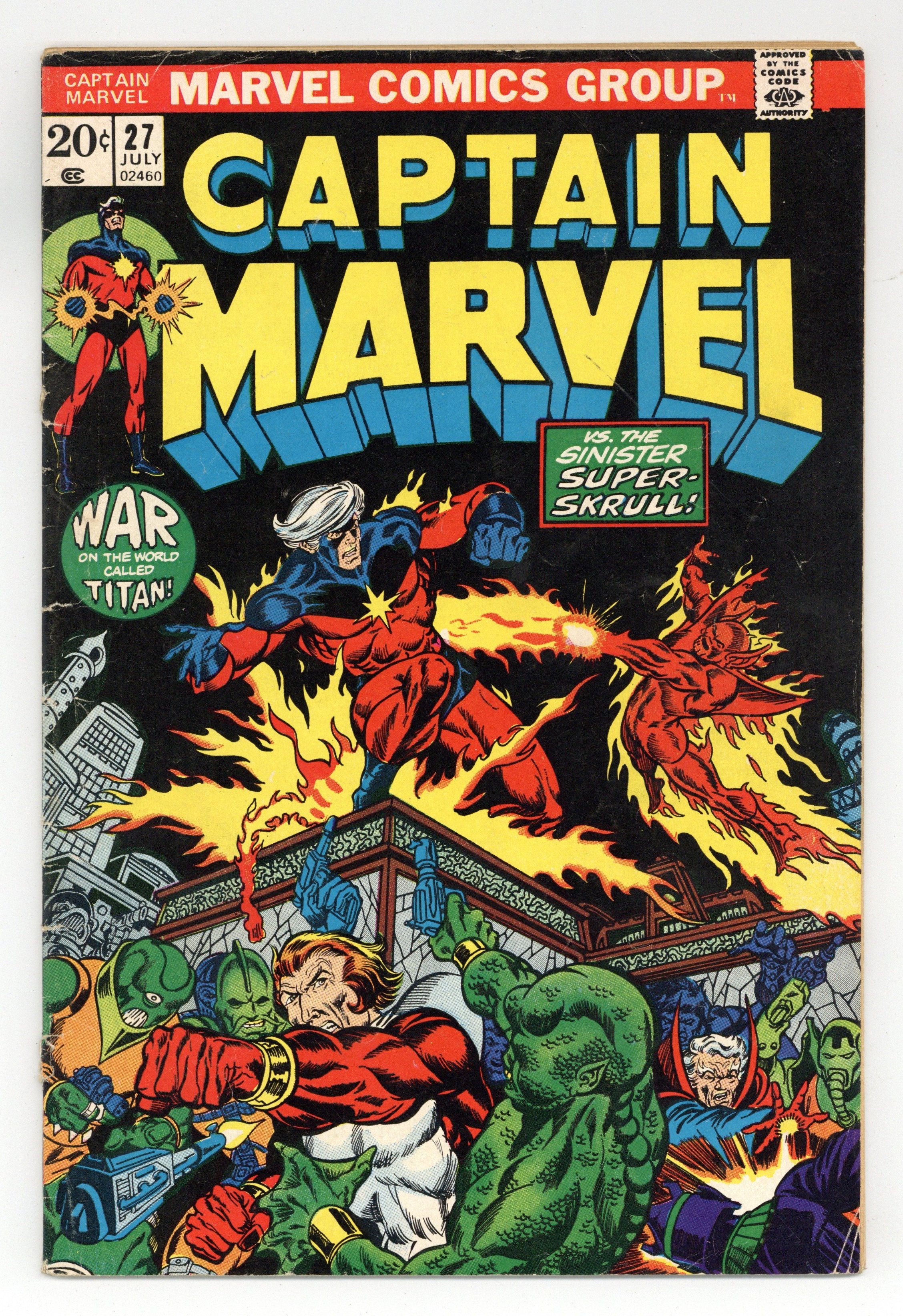 The Super-Skrull continues to pester Captain Marvel in "Trapped on Titan!" Script by Mike Friedrich, plot and pencils by Jim Starlin, inks by Pablo Marcos. Meanwhile, Thanos seeks out the Cosmic Cube. Cameos by the Thing (of the Fantastic Four), the Avengers (Captain America, Iron Man, the Scarlet Witch, the Vision, and the Black Panther), and Drax the Destroyer. This issue also contains a map of Titan. Cover price $0.20.