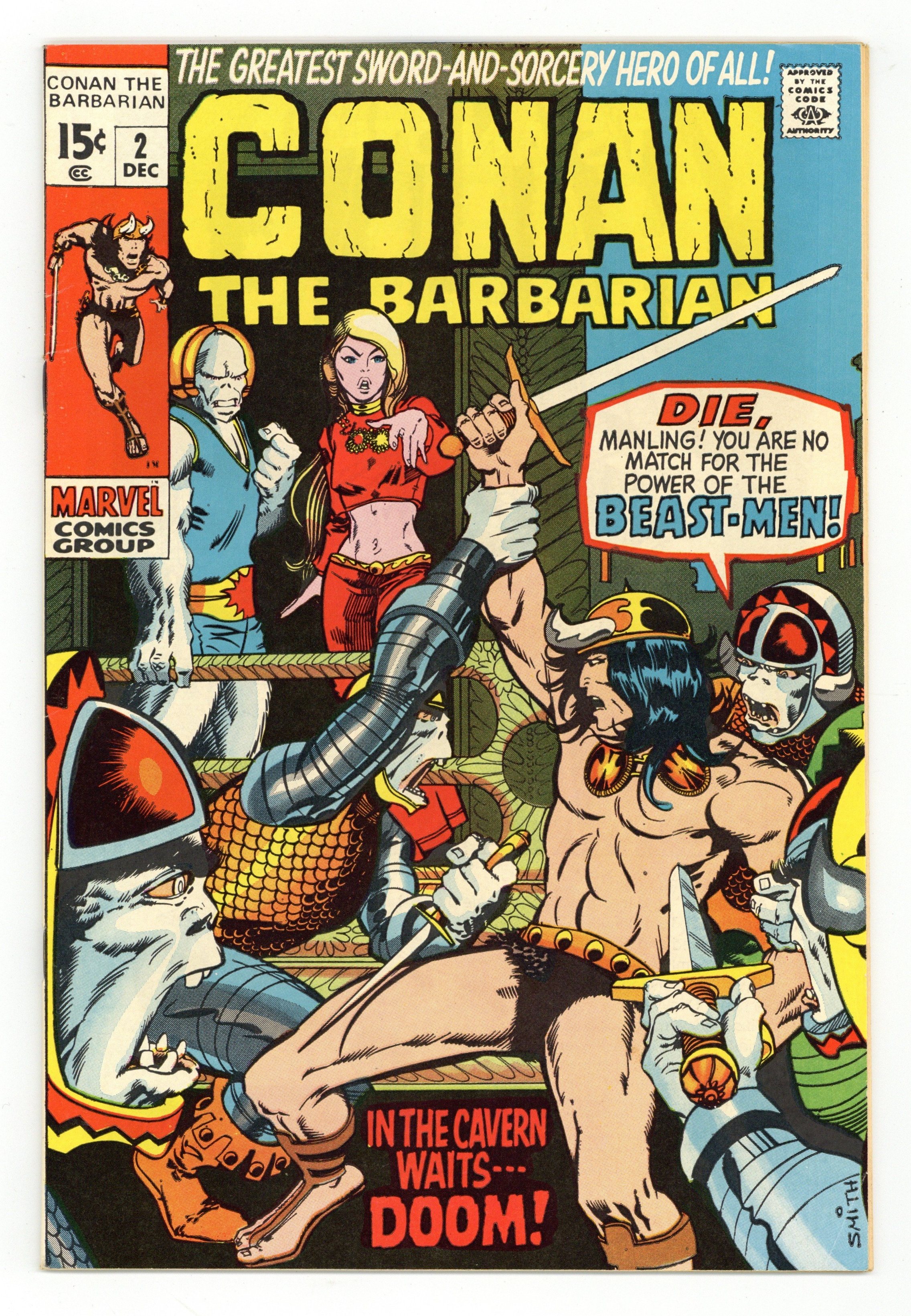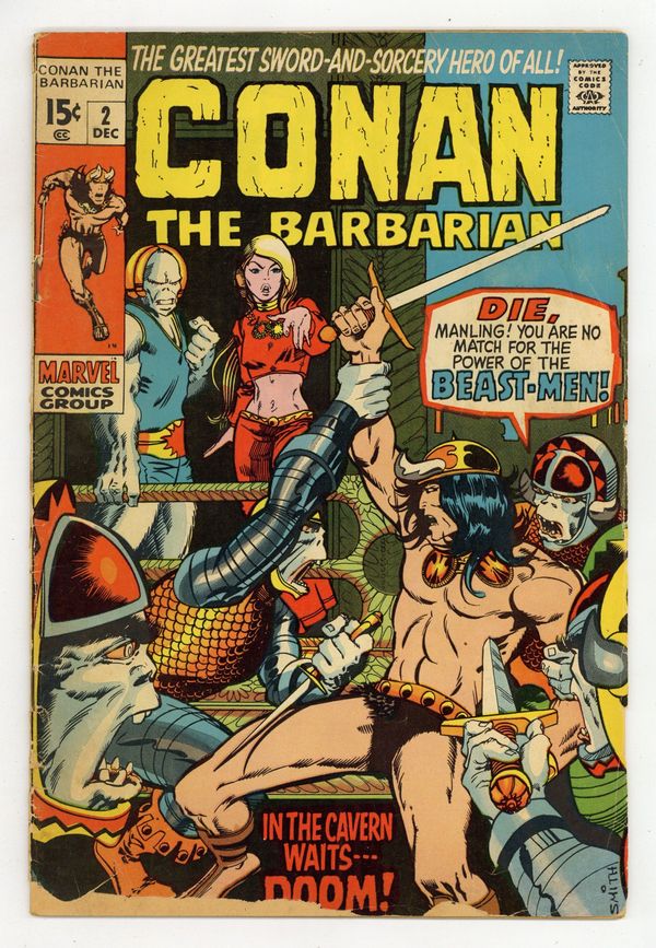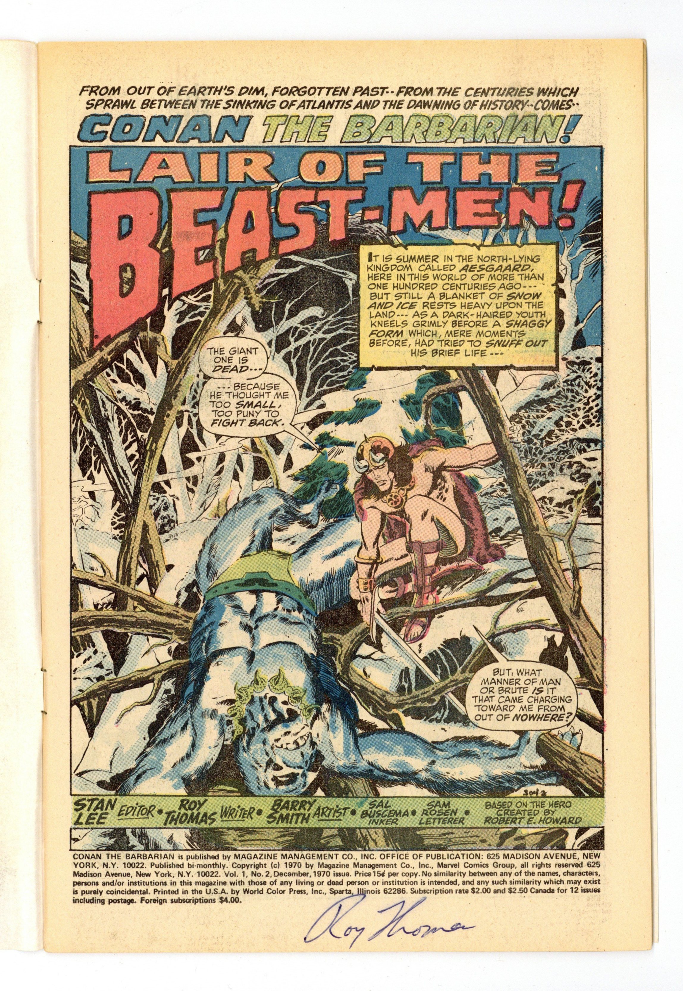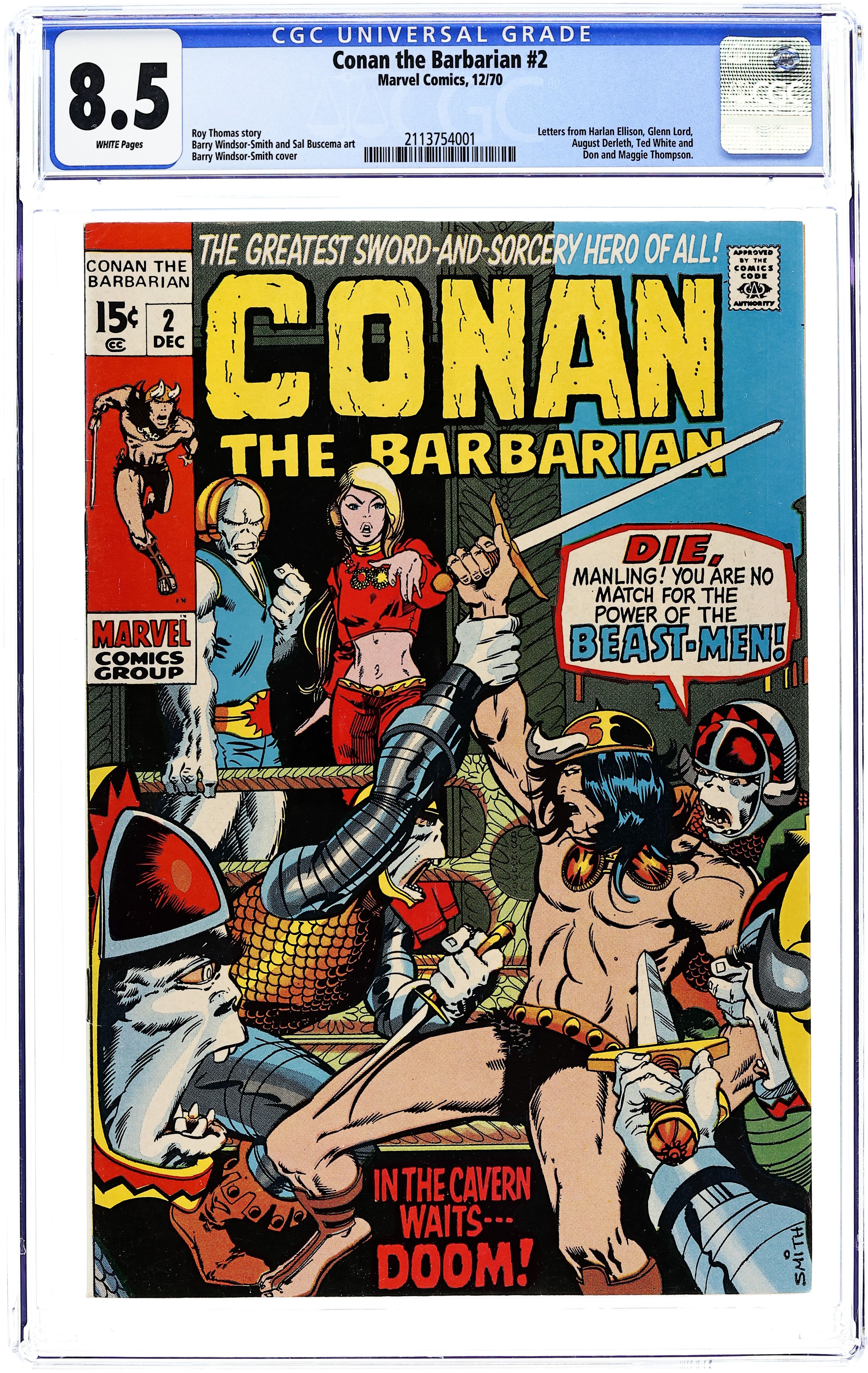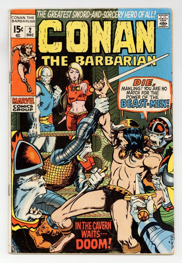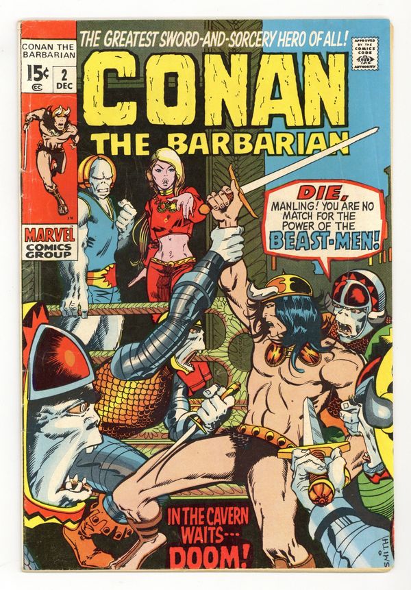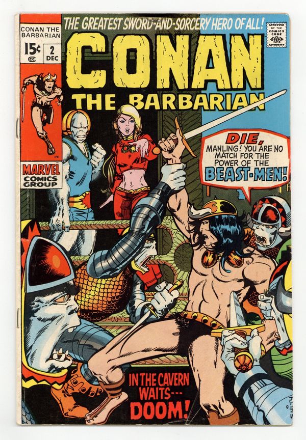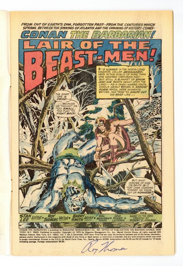 Cover art by Barry Windsor-Smith. Lair of the Beast-Men!, script by Roy Thomas, pencils by Barry Windsor-Smith, inks by Sal Buscema; Conan leads humans in a revolution against their ape-masters; Conan kills a snow-lion; Conan's 1st time in chains. Letters to the editor from writers Harlan Ellison, Dick Lupoff, August Derleth, and Ted White; comics historians Don and Maggie Thompson; and Glenn Lord. The letters page reprints the Hyborian Age map from Conan 1. 36 pgs. Cover price: $0.15. Cover price $0.15.