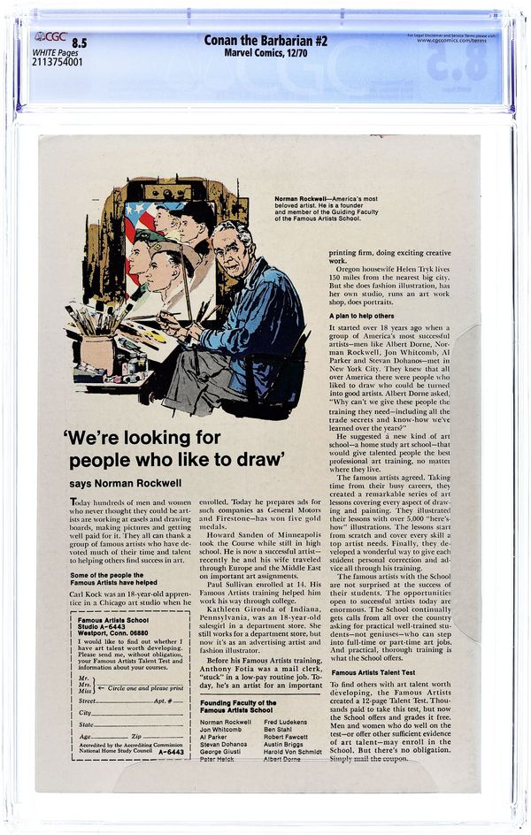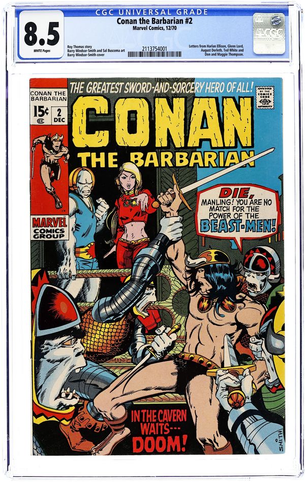 Ends Dec 8 7:54 PM CST Bid History 9 bids Current Bid $45 Your Secret Max Bid If you'd like to bid, please log in or register. Cover art by Barry Windsor-Smith. Lair of the Beast-Men!, script by Roy Thomas, pencils by Barry Windsor-Smith, inks by Sal Buscema; Conan leads humans in a revolution against their ape-masters; Conan kills a snow-lion; Conan's 1st time in chains. Letters to the editor from writers Harlan Ellison, Dick Lupoff, August Derleth, and Ted White; comics historians Don and Maggie Thompson; and Glenn Lord. The letters page reprints the Hyborian Age map from Conan 1. 36 pgs. Cover price: $0.15. Cover price $0.15.