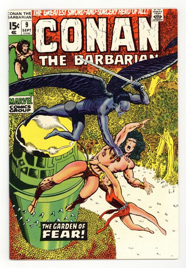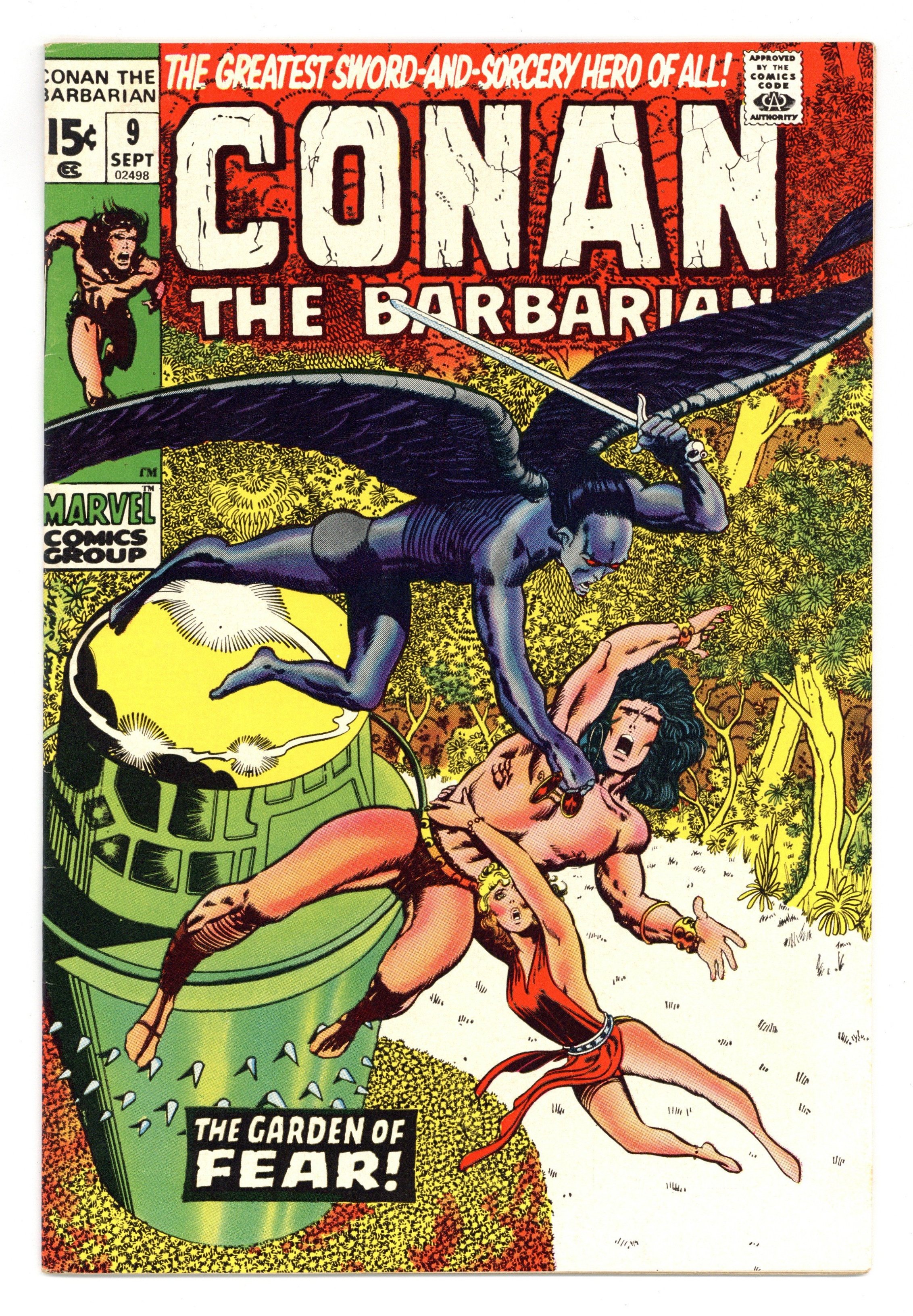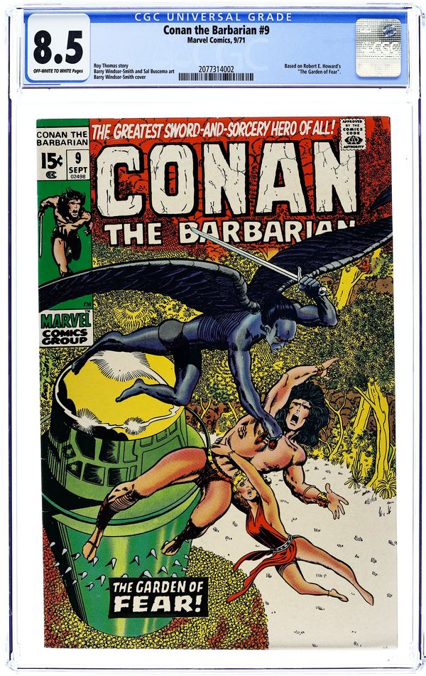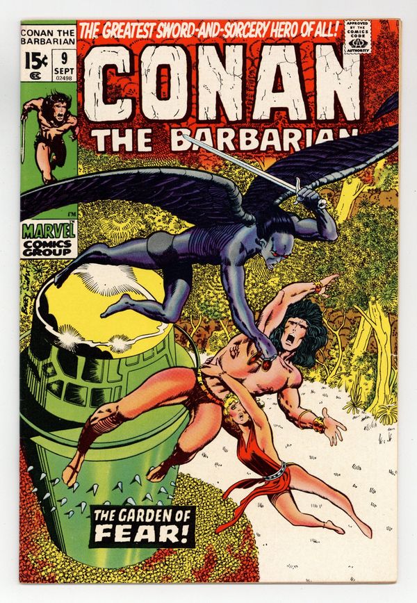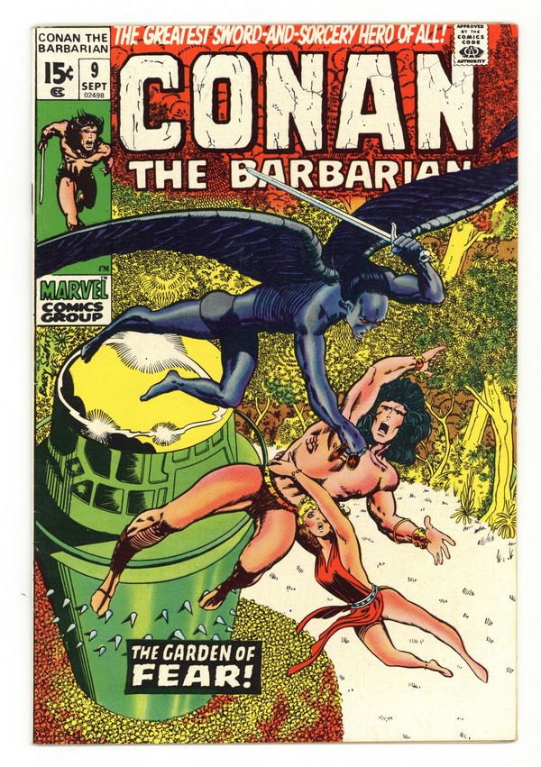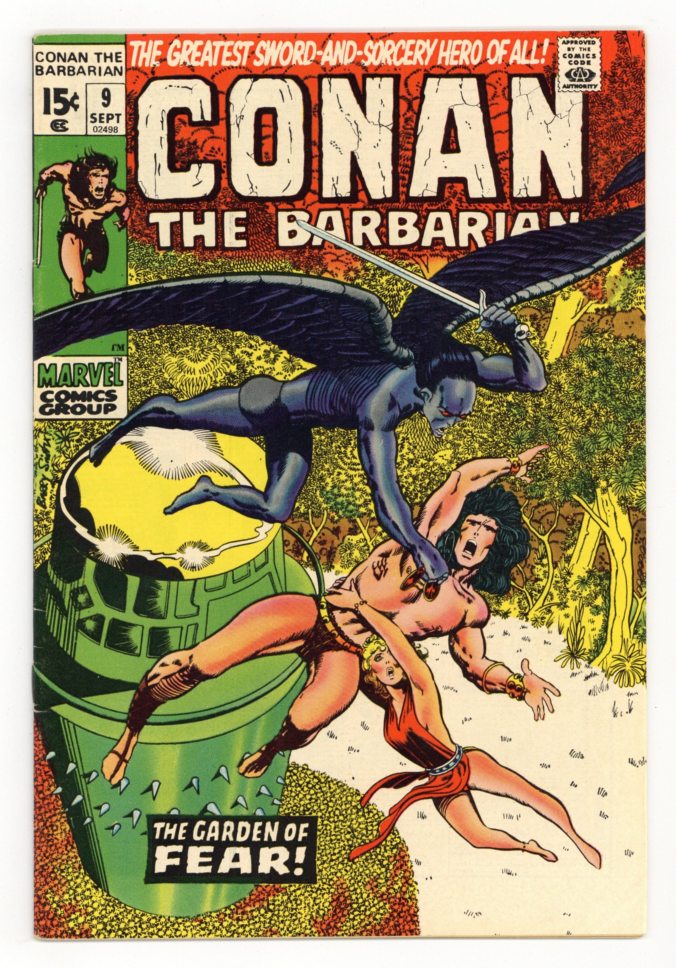 Ends Dec 8 7:55 PM CST Bid History 5 bids Current Bid $10 Your Secret Max Bid If you'd like to bid, please log in or register. Last 15-cent issue. Cover art by Barry Windsor-Smith. Last 15-cent issue. The Garden of Fear, script by Roy Thomas, pencils by Barry Windsor-Smith, inks by Sal Buscema; setting: primitive village & lost valley with Wooly Mammoths & man-eating flowers; Conan saves Jenna & kills sole survivor of ancient winged race; adapted from the non-Conan story by Robert E. Howard. 36 pgs. Cover price: $0.15. Cover price $0.15.