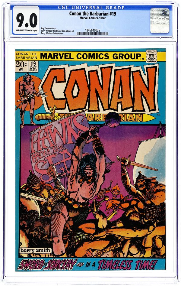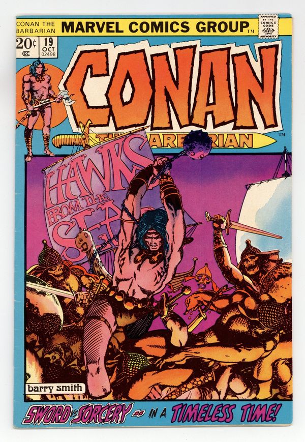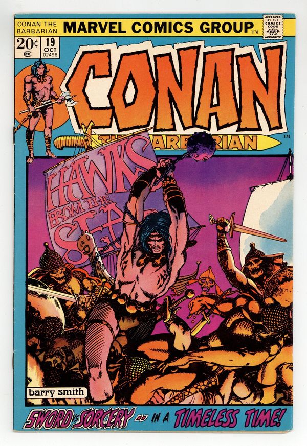 Cover art by Barry Windsor-Smith. Hawks From the Sea, script by Roy Thomas, pencils by Barry Windsor-Smith, inks (pages 1-9) by Dan Adkins. (Pages 10-20 were reproduced directly from the pencils); setting: Ship, City of Makkalet; Conan works for Turanian military and lays seige to Makkalet; Legend of the Living Tarim is told; Conan makes enemy of Balthaz; Fafnir is wounded by flaming arrow. 36 pgs. Cover price $0.20. Cover price $0.20.