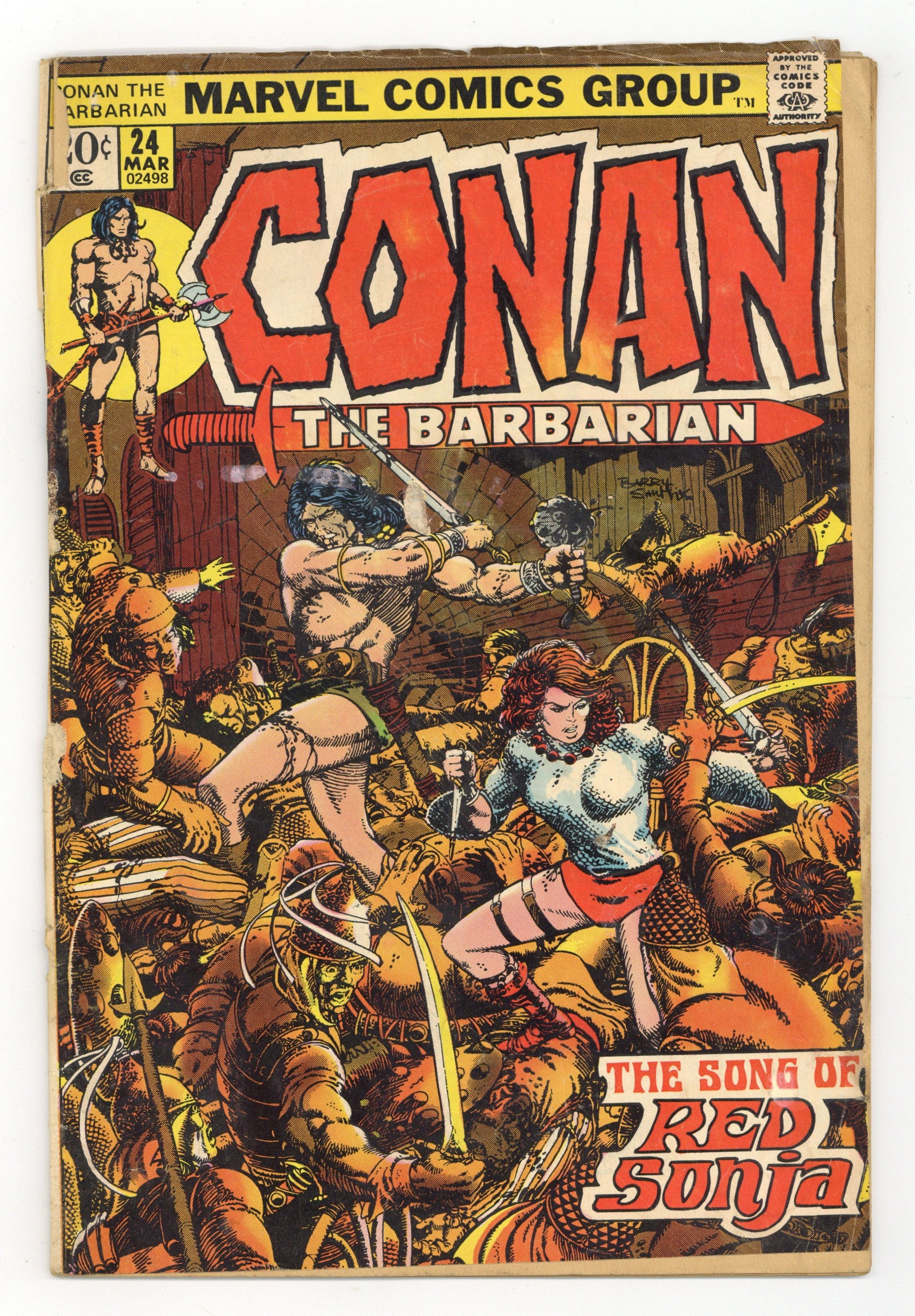 Cover art by Barry Windsor-Smith. First full Red Sonja story, The Song of Red Sonja, script by Roy Thomas, pencils by Barry Windsor-Smith; setting: Makkalet; Conan and Red Sonja start a bar-fight, bathe in a fountain, scale temple walls, break in and steal a snake-tiara, and fight a magical snake; at the end Sonja tricks Conan, and leaves for Pah-Disha; the Red Sonja story continues in Savage Sword of Conan 1. Final Windsor-Smith art on this title. The art in this issue (at least on page 8, and perhaps elsewhere) was altered without Windsor-Smith's approval. See Marvel Treasury Edition 15 or Savage Sword of Conan 82 for the original version. (The reprint in Conan Saga 8 contains the altered version). In the letter's column, Roy Thomas responds and announces Barry Smith's final departure as Conan the Barbarian artist; Incidentally, Roy's responses to R. Benitz and Keith Taylor are mistakenly transposed. 36 pgs. Cover price $0.20. Cover price $0.20.
