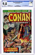 Cover pencils by Gil Kane, inks by Ernie Chan [as Ernie Chua]. Two Against Turan, script by Roy Thomas, pencils by John Buscema, inks by Ernie Chan [as Ernie Chua]; setting: City of Aghrapur; Conan kills Eithriall (a.k.a. Ormraxes) and many others; Conan joins the Turanian Army of King Yildiz; adapted from the non-Conan story, "Two Against Tyre," by Robert E. Howard. 36 pgs. Cover price $0.20. Cover price $0.20.