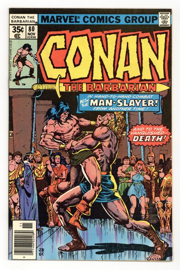 Tags: Marvel Legacy Numbering: Conan (part 80), Conan$6.00Cover pencils by John Buscema, inks by Ernie Chan. Trial By Combat! Script by Roy Thomas, pencils by Howard Chaykin, inks by Ernie Chan; setting: city of Attalus; Conan defeats Ptolemy and Becomes King of Attalus; Stygians attack Attalus; Aristo dies; adapted from the non-Conan story "The Lost Valley of Iskander" by Robert E. Howard. Spider-Man stars in a one-page Hostess ad, Legal Eagle. Jack Davis art on a Spalding back-cover ad. 36 pgs. Cover price $0.35. Cover price $0.35.