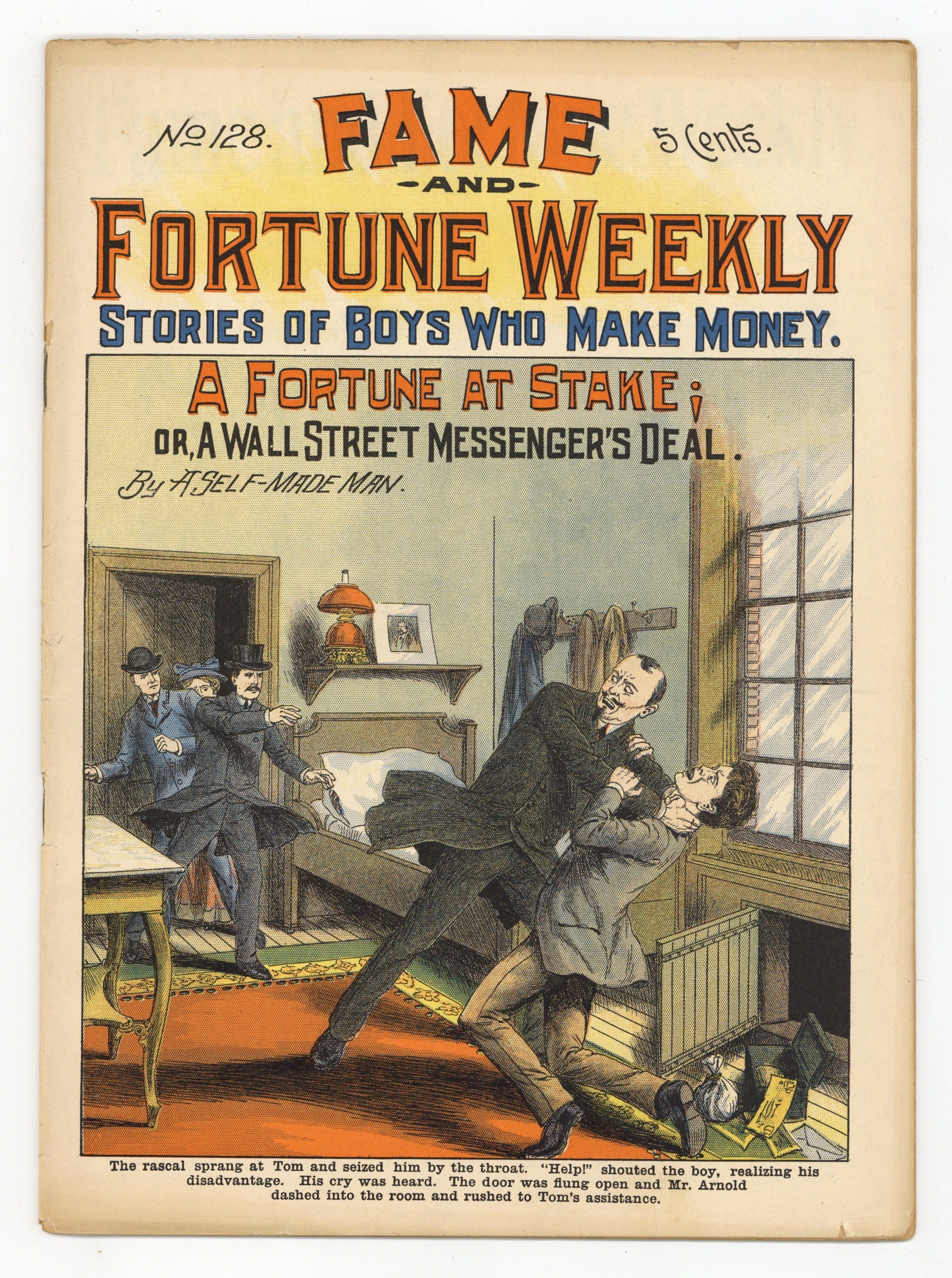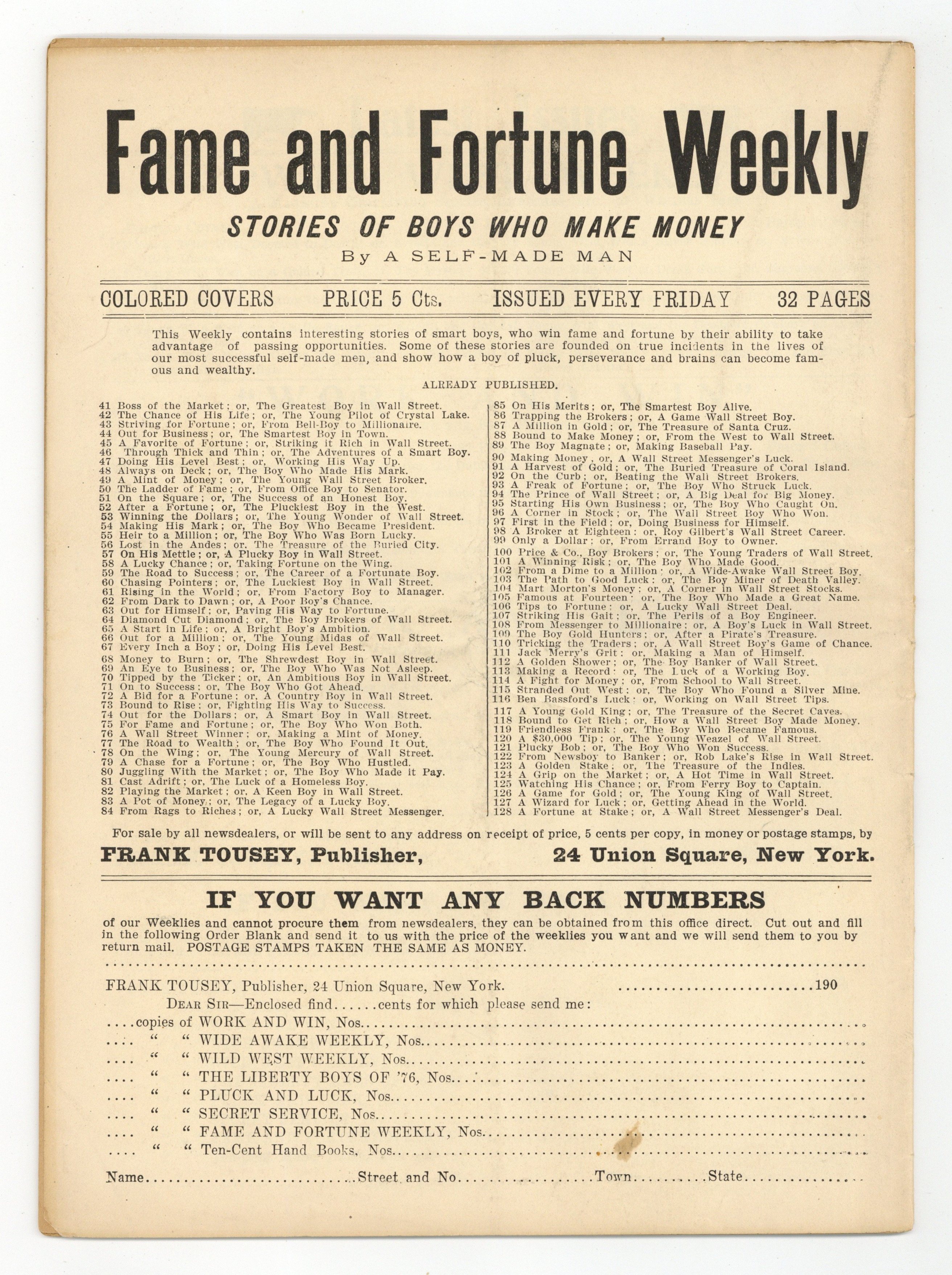 March 13, 1908. A Fortune at Stake; or, A Wall Street Messenger's Deal. 11" x 8", 32 pages. Cover price $0.05.