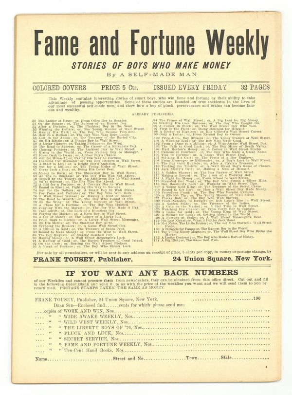 April 24, 1908. A Big Risk; or, The Game That Won. 11" x 8", 32 pages. Cover price $0.05.