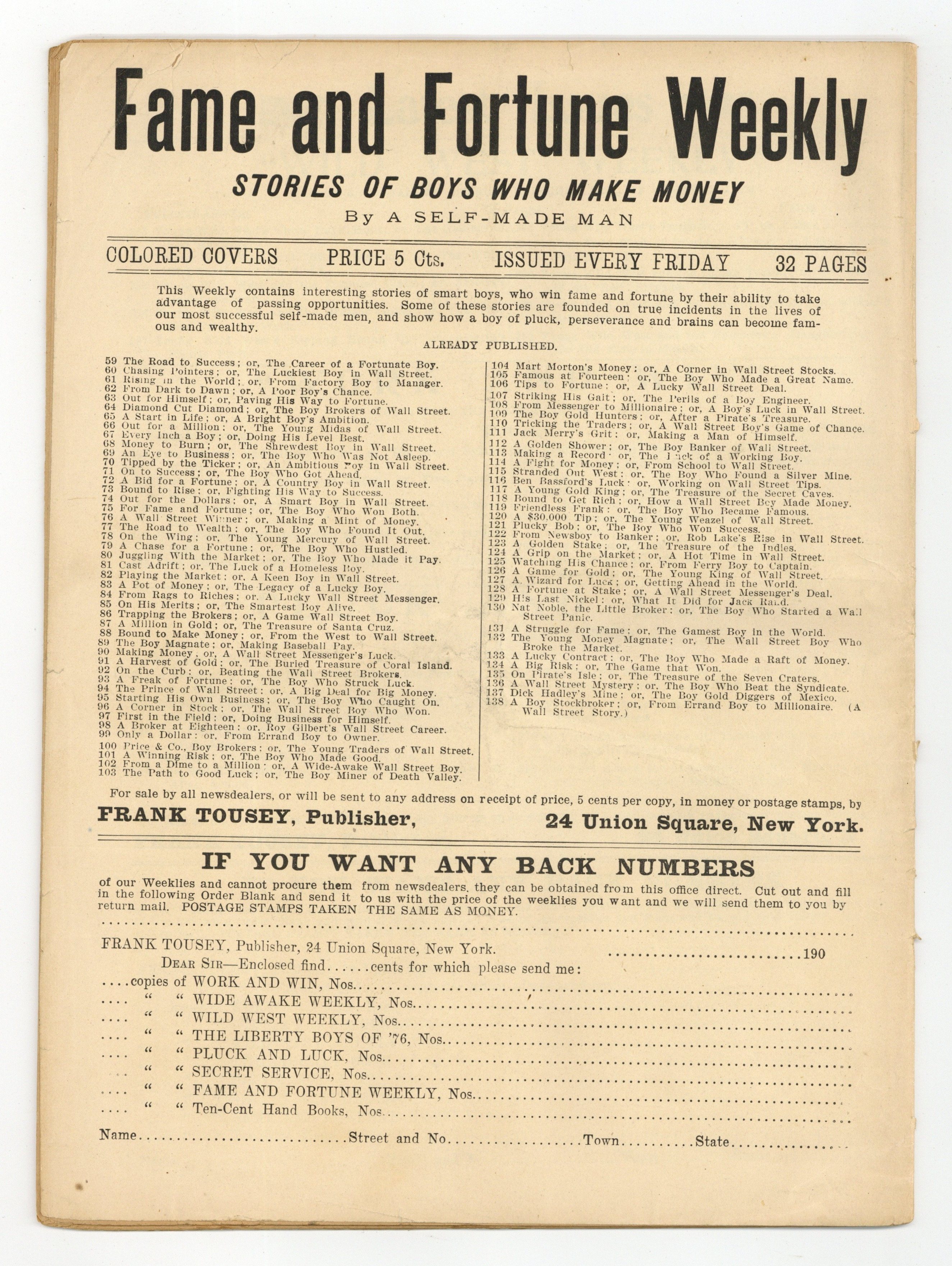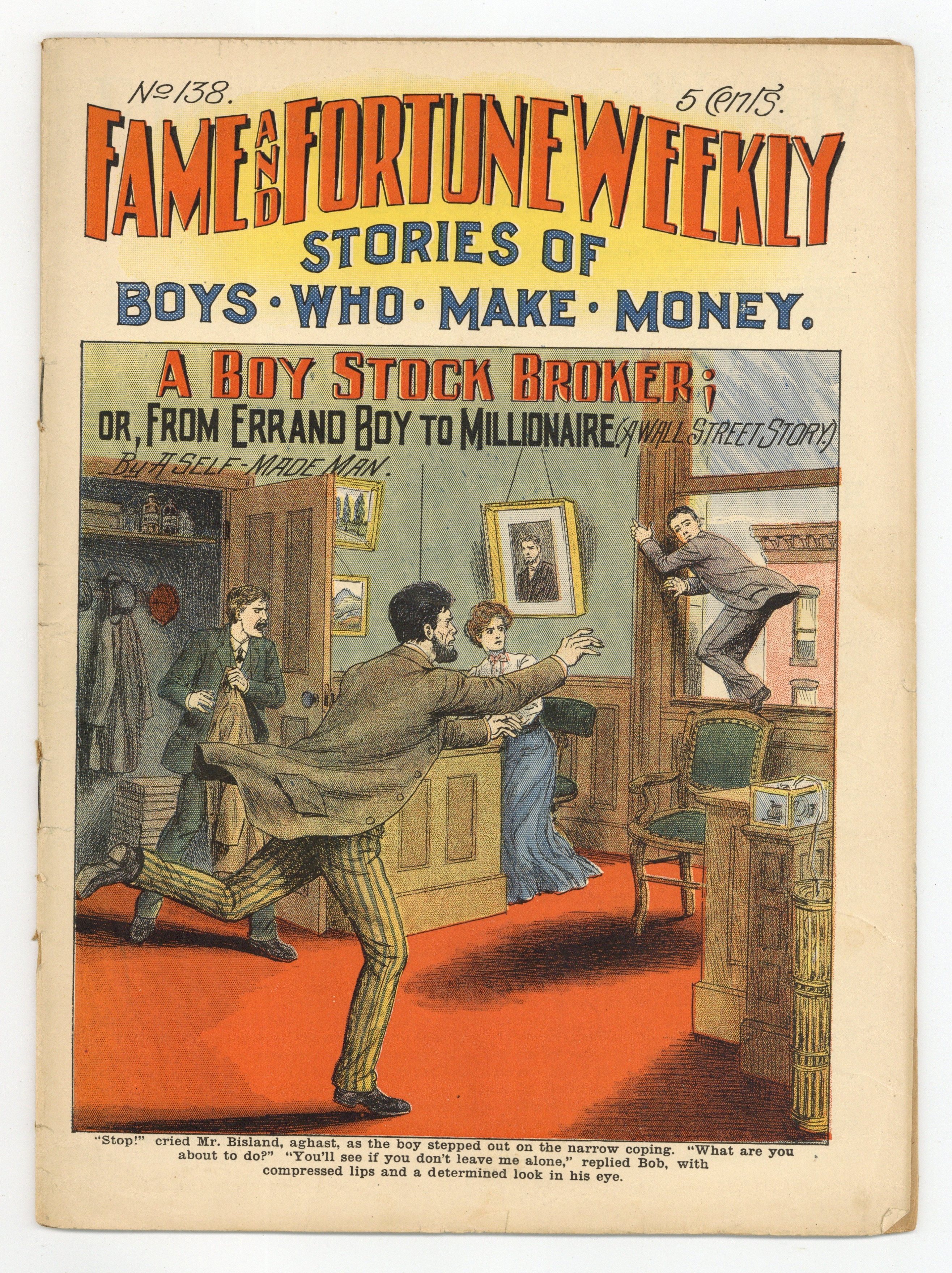 May 22, 1908. A Boy Stock Broker; or, From Errand Boy to Millionaire. 11" x 8", 32 pages. Cover price $0.05.