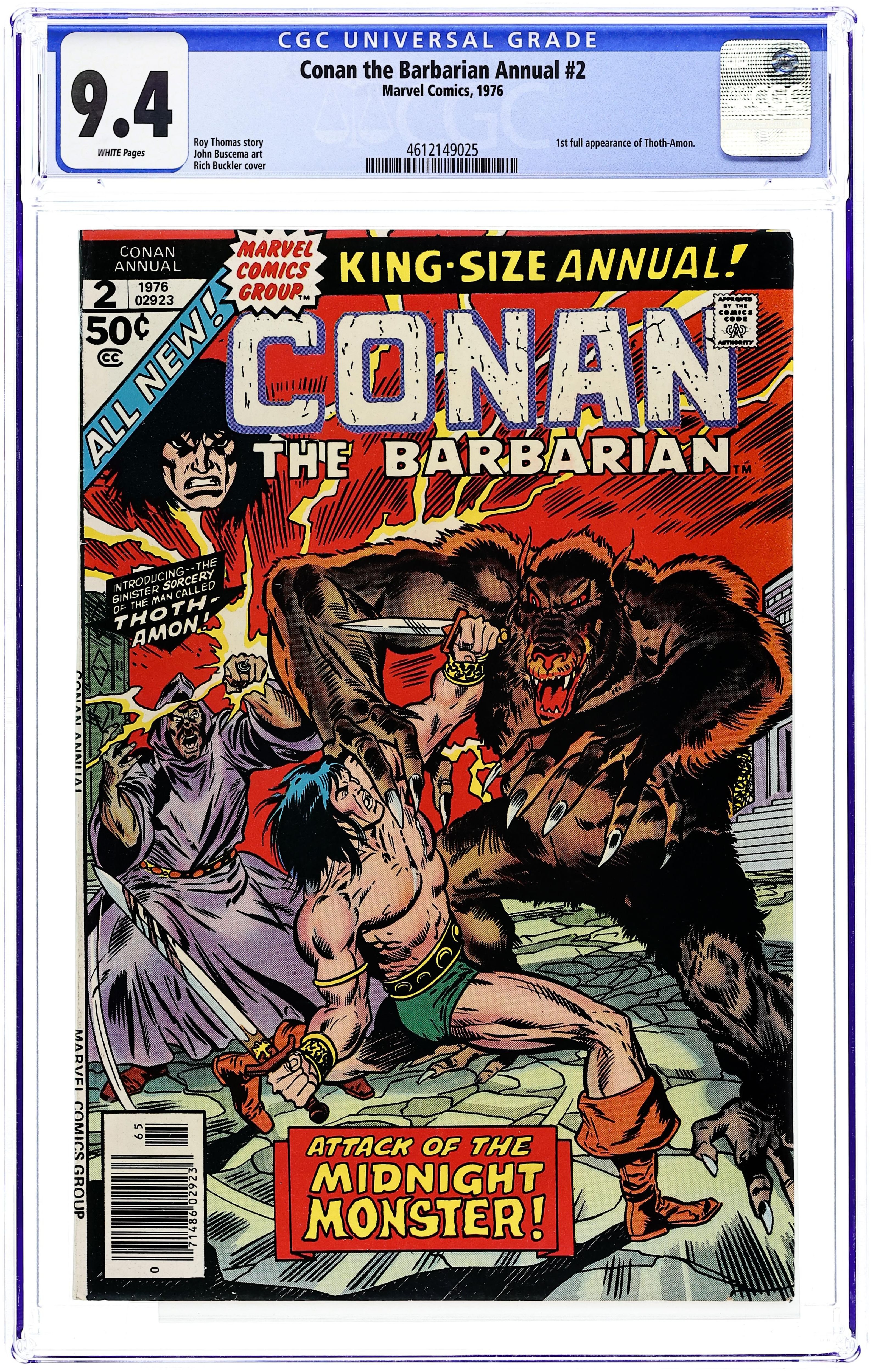 New stories begin. Conan faces Thoth-Amon in "The Phoenix on the Sword!" Script by Roy Thomas, pencils by Vicente Alcazar, inks by Yong Montano. Prologue (3 pages) pencils by John Buscema. Adapted from the story by Robert E. Howard. Rich Buckler cover pencils? 52 pgs. Cover price $0.50.