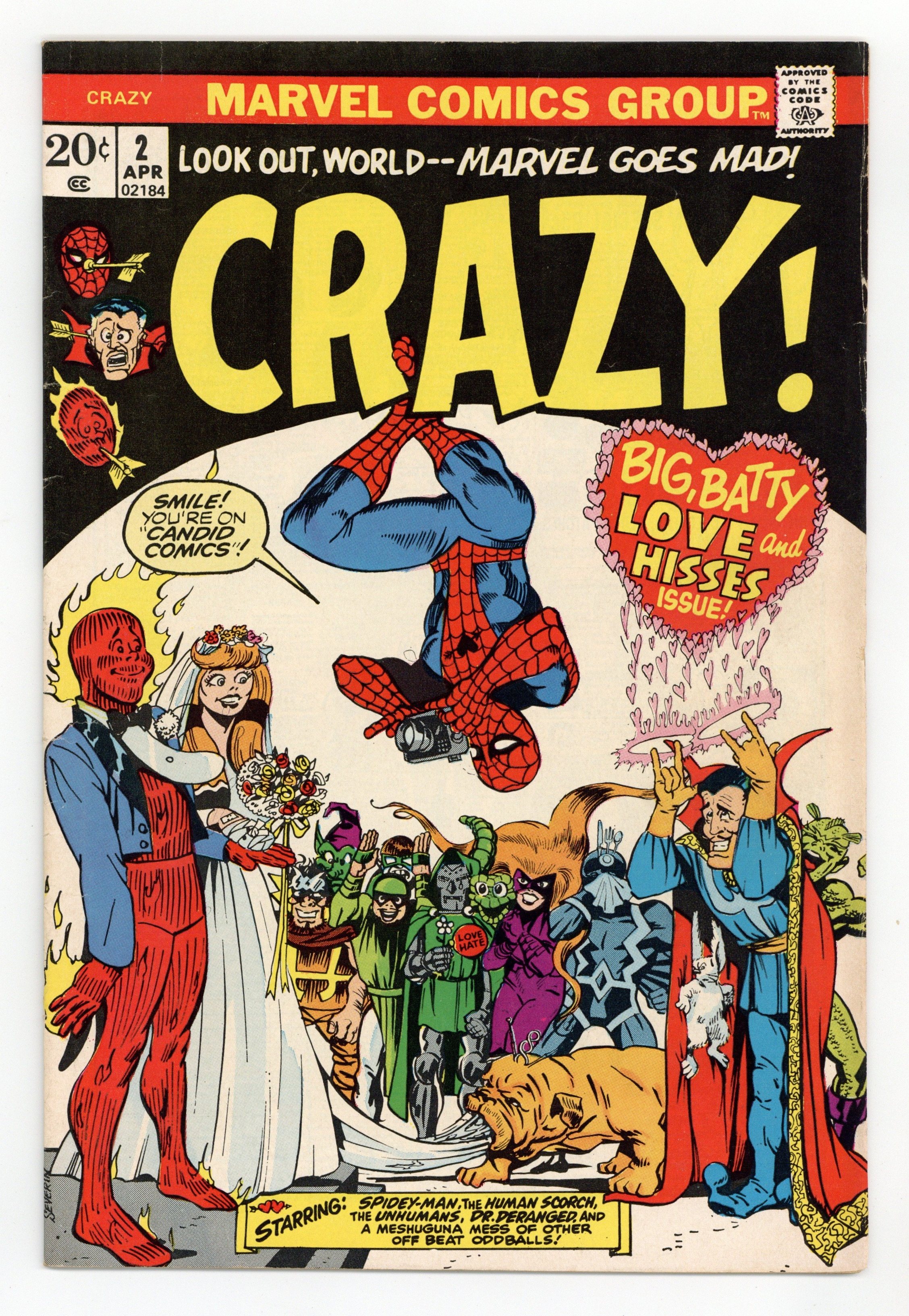 Stan Lee and the Marvel Bullpen spoof themselves in these MAD-style stories reprinted from issue #6 of Not Brand Ecch. Jack Kirby illustrates a Fantastic Four satire; Spider-Man falls for a mystery woman; Marvel and DC characters play rival gangs in Best Side Story. Other talents include Tom Sutton, Roy Thomas, Gary Friedrich and Marie Severin, who really did work for MAD in the early days. No relation to Crazy Magazine other than the title. Cover by Severin. 36 pages. Cover price $0.20.