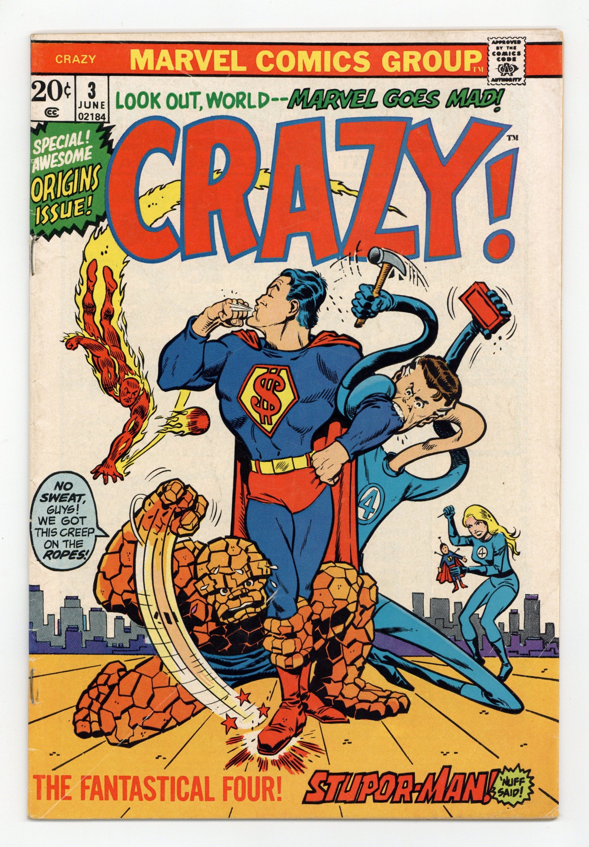 Stan Lee and the Marvel Bullpen spoof themselves in these MAD-style stories reprinted from issue #7 of Not Brand Ecch. Jack Kirby illustrates another Fantastic Four satire; Marvel takes on the competition in The Origin of Stuporman. Other talents include Tom Sutton, Roy Thomas, and Marie Severin, who really did work for MAD in the early days. No relation to Crazy Magazine other than the title. Cover by Severin. Cover price $0.20.