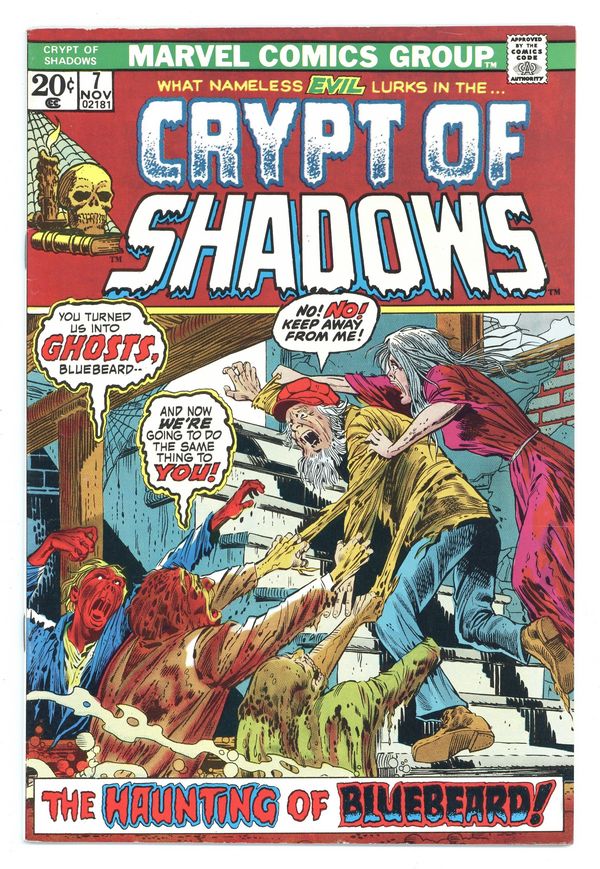 $22.50Cover inks by Herb Trimpe. All reprints: The Haunting of Bluebeard!, art by Tony Di Preta; A man who calls himself Bluebeard murders and robs the guests of his inn, but when a thief carrying a bottle of Nitro becomes his latest victim, Bluebeard decides to dispose of the bottle outside. Death and Tommy Norton, script by Stan Lee, art by John Romita; A boy's toy soldier shoots his aunt when she attempts to murder him. The Man Who Saw Tomorrow, art by Joe Sinnott. The Twin!; In eighteenth-century France, twin brothers are always competing with each other but the one who was born first always thinks of ideas slightly before the other. 36 pgs. $0.20. Cover price $0.20.