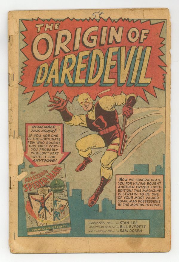 Ends Apr 14 8:03 PM CST Bid History 18 bids Current Bid $4,022 Your Secret Max Bid If you'd like to bid, please log in or register. Cover pencils by Jack Kirby, inks by Bill Everett. First appearances of Daredevil, Karen Page, and Foggy Nelson in The Origin of Daredevil, script by Stan Lee, art by Bill Everett (splash page penciled by Jack Kirby); Matt Murdock saves a blind man from an oncoming truck but is struck blind himself by a radioactive canister during the rescue; The radioactivity heightens Matt's other senses and gives him an uncanny radar sense; Matt graduates college and begins practicing law with his college roommate Foggy; Matt's father, a boxer, is killed by the Fixer after he refuses to throw a fight; Matt designs a costume and a billy club (from his cane) and takes his derogatory childhood nickname "Daredevil"; DD tracks down the Fixer and the man who shot his father. Spider-Man and Fantastic Four appear on the cover but not in the story inside. 36 pgs. Cover price $0.12. Cover price $0.12.
