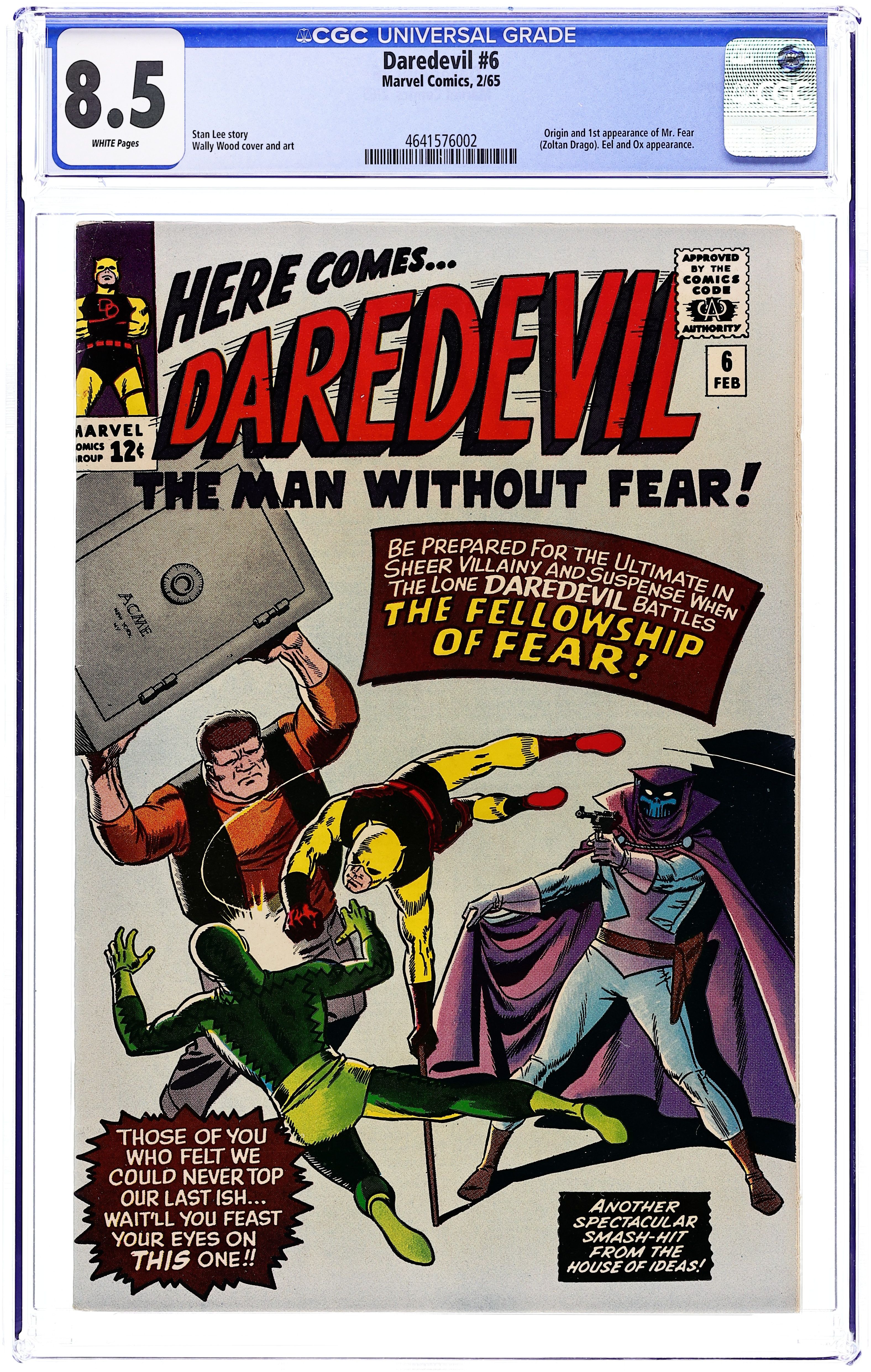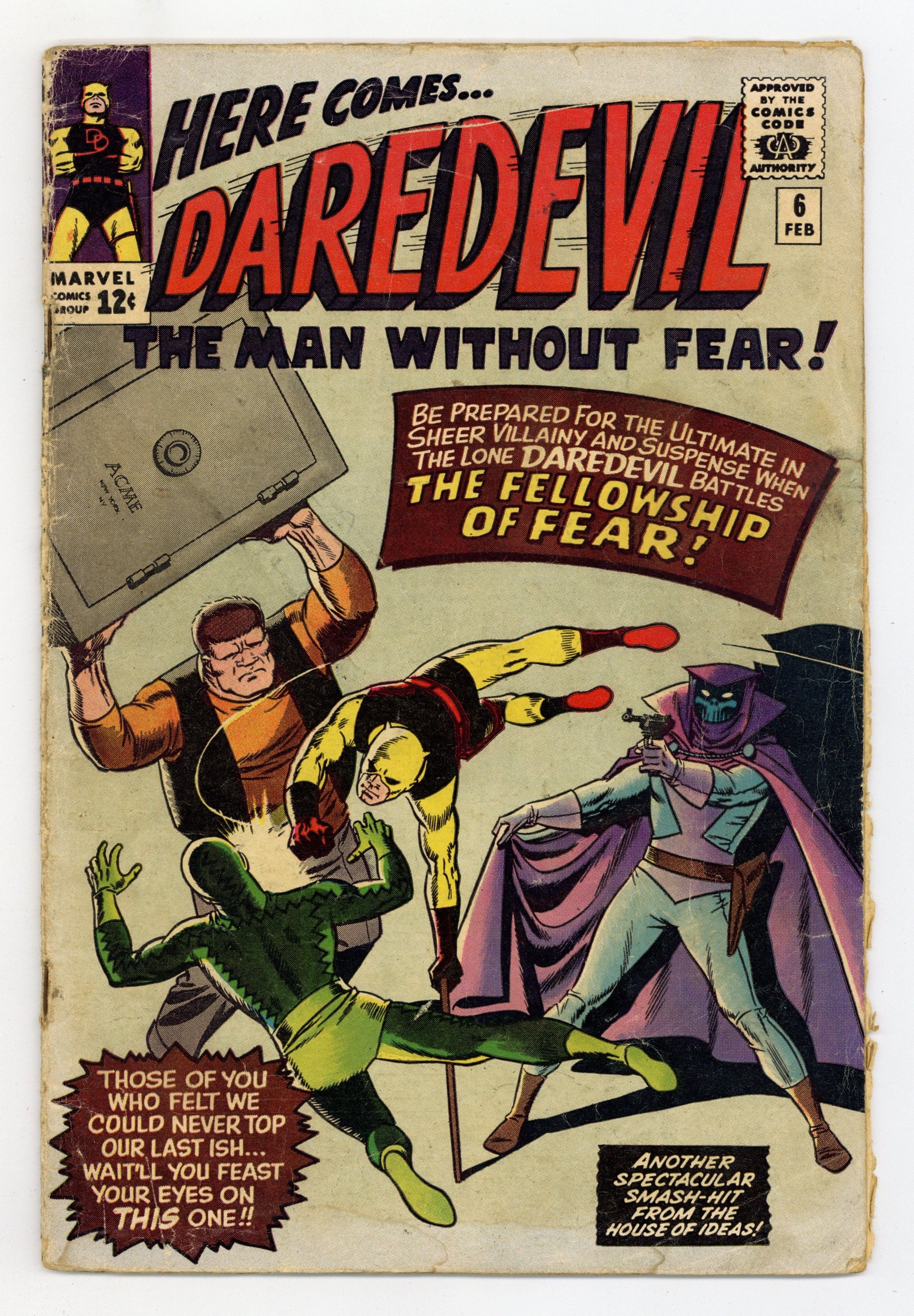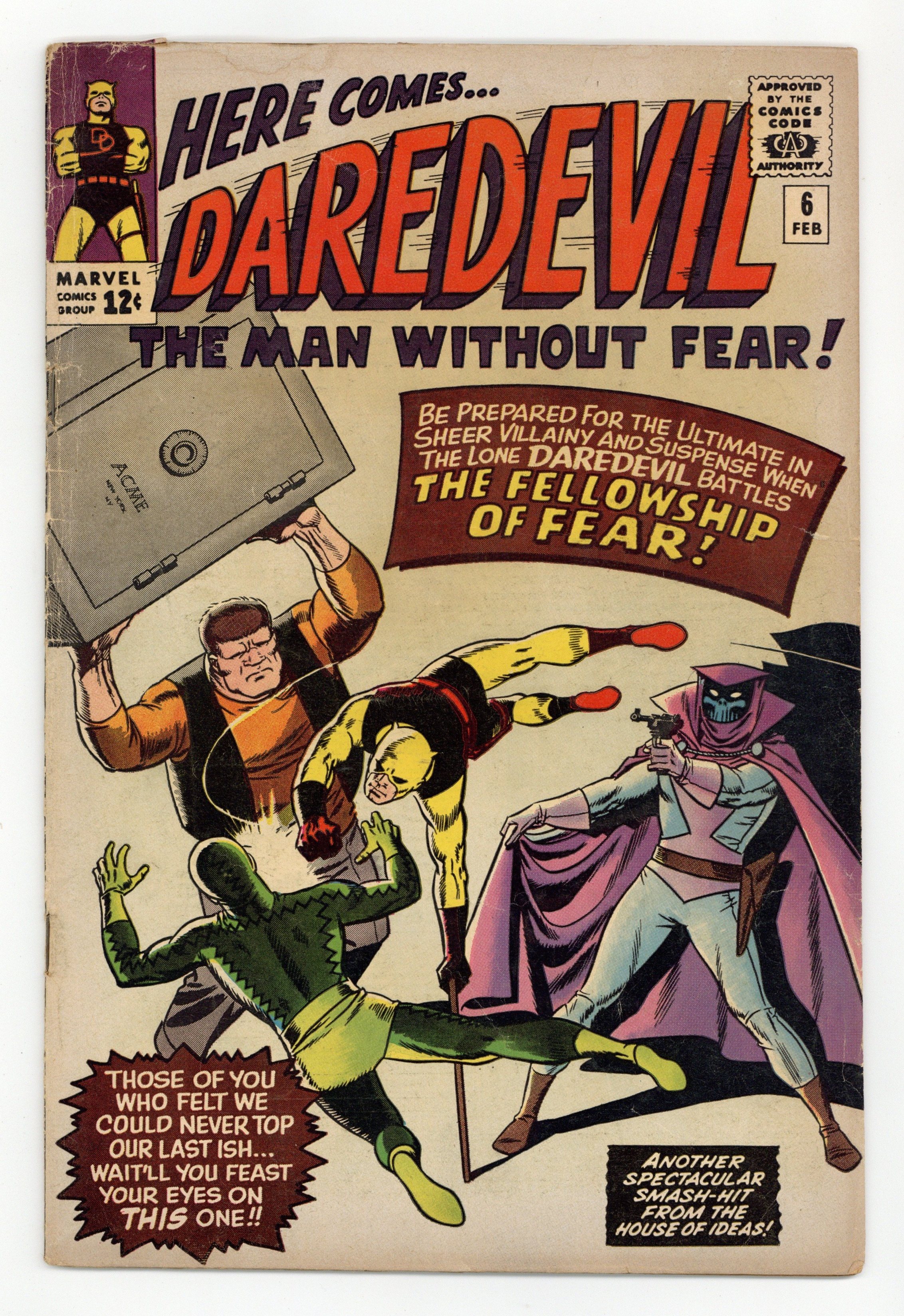 Starts Dec 15 Cover art by Wally Wood. First appearance of Mr. Fear in "Trapped by the Fellowship of Fear!" Script by Stan Lee, art by Wally Wood. The Fellowship of Fear includes Mr. Fear, the Ox, and the Eel. Cameos (Mr. Fear's sculptures) by Captain America, Electro, the Owl, Rama-Tut, Mysterio, Spider-Man, the Chameleon, Dr. Doom, the Hatemonger, Diablo, the Beetle, Kraven, Baron Zemo, Iron Man, the Toad, Mr. Doll, the Black Knight, Egghead, the Hulk, the Melter, Cyclops, the Vulture, the Thing (of the Fantastic Four), Dr. Octopus, Dr. Strange, Loki, Thor, the Super Skrull, the Cobra, Magneto, Giant Man, and the Green Goblin!; DD intrudes on a phony movie shoot where the Fellowship of Fear is robbing a bank and gets himself blasted by fear gas; Mr. Fear decides to flush DD out by creating a wax figure of Hornhead for his museum; DD and Foggy both get in a brawl with the Fellowship, and Foggy is injured; DD returns to the wax museum to put an end to the Fellowship. 36 pgs. Cover price $0.12. Cover price $0.12.