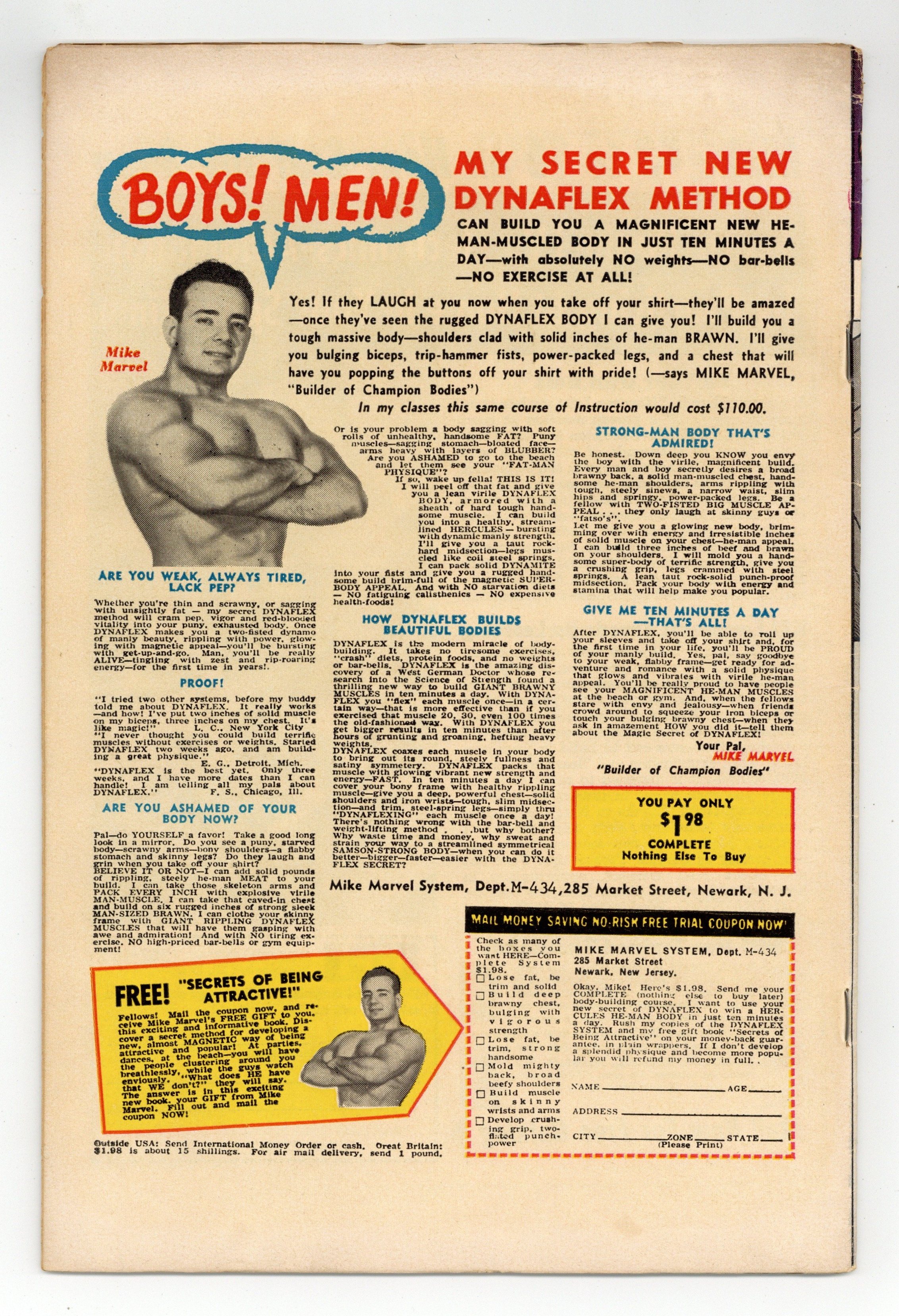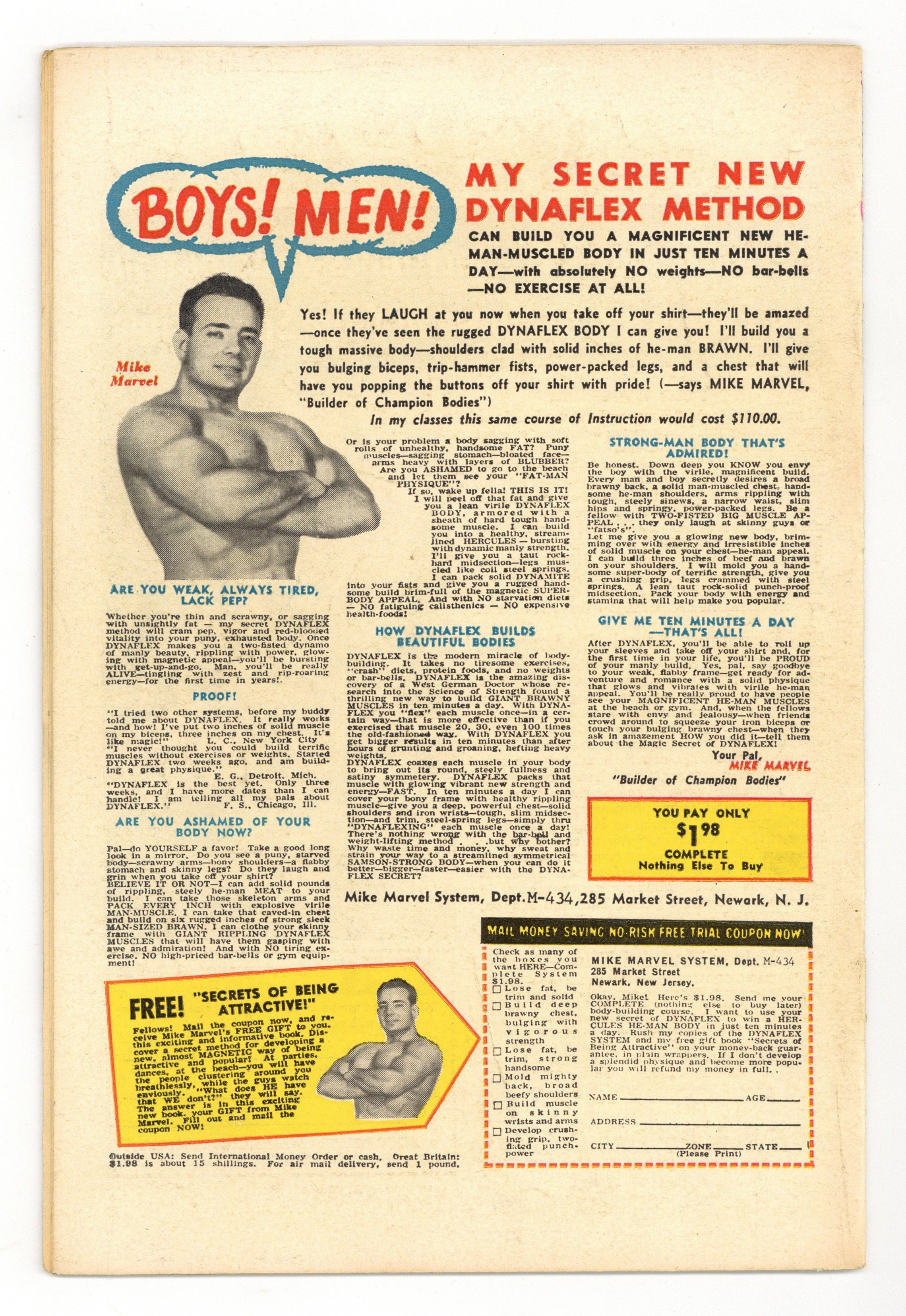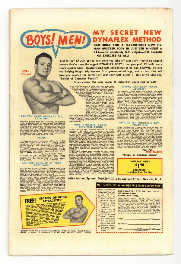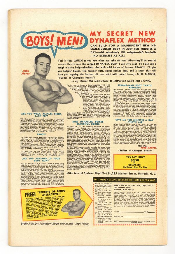 Starts Dec 15 Cover art by Wally Wood. First appearance of Mr. Fear in "Trapped by the Fellowship of Fear!" Script by Stan Lee, art by Wally Wood. The Fellowship of Fear includes Mr. Fear, the Ox, and the Eel. Cameos (Mr. Fear's sculptures) by Captain America, Electro, the Owl, Rama-Tut, Mysterio, Spider-Man, the Chameleon, Dr. Doom, the Hatemonger, Diablo, the Beetle, Kraven, Baron Zemo, Iron Man, the Toad, Mr. Doll, the Black Knight, Egghead, the Hulk, the Melter, Cyclops, the Vulture, the Thing (of the Fantastic Four), Dr. Octopus, Dr. Strange, Loki, Thor, the Super Skrull, the Cobra, Magneto, Giant Man, and the Green Goblin!; DD intrudes on a phony movie shoot where the Fellowship of Fear is robbing a bank and gets himself blasted by fear gas; Mr. Fear decides to flush DD out by creating a wax figure of Hornhead for his museum; DD and Foggy both get in a brawl with the Fellowship, and Foggy is injured; DD returns to the wax museum to put an end to the Fellowship. 36 pgs. Cover price $0.12. Cover price $0.12.