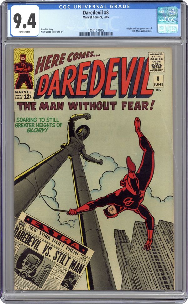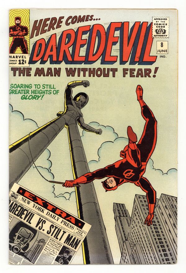Cover art by Wally Wood. First appearance of the Stilt-Man in The Stilt-Man Cometh!, script by Stan Lee, art and cover by Wally Wood; Nelson and Murdock are hired by a disgruntled scientist who claims his boss stole his invention; The scientist turns out, not only to be the real thief, but also the new villain, Stilt-Man. House ad for Fantastic Four #40 and Amazing Spider-Man #26. Letter by artist Alan Hutchinson. 36 pgs. Cover price $0.12. Cover price $0.12.