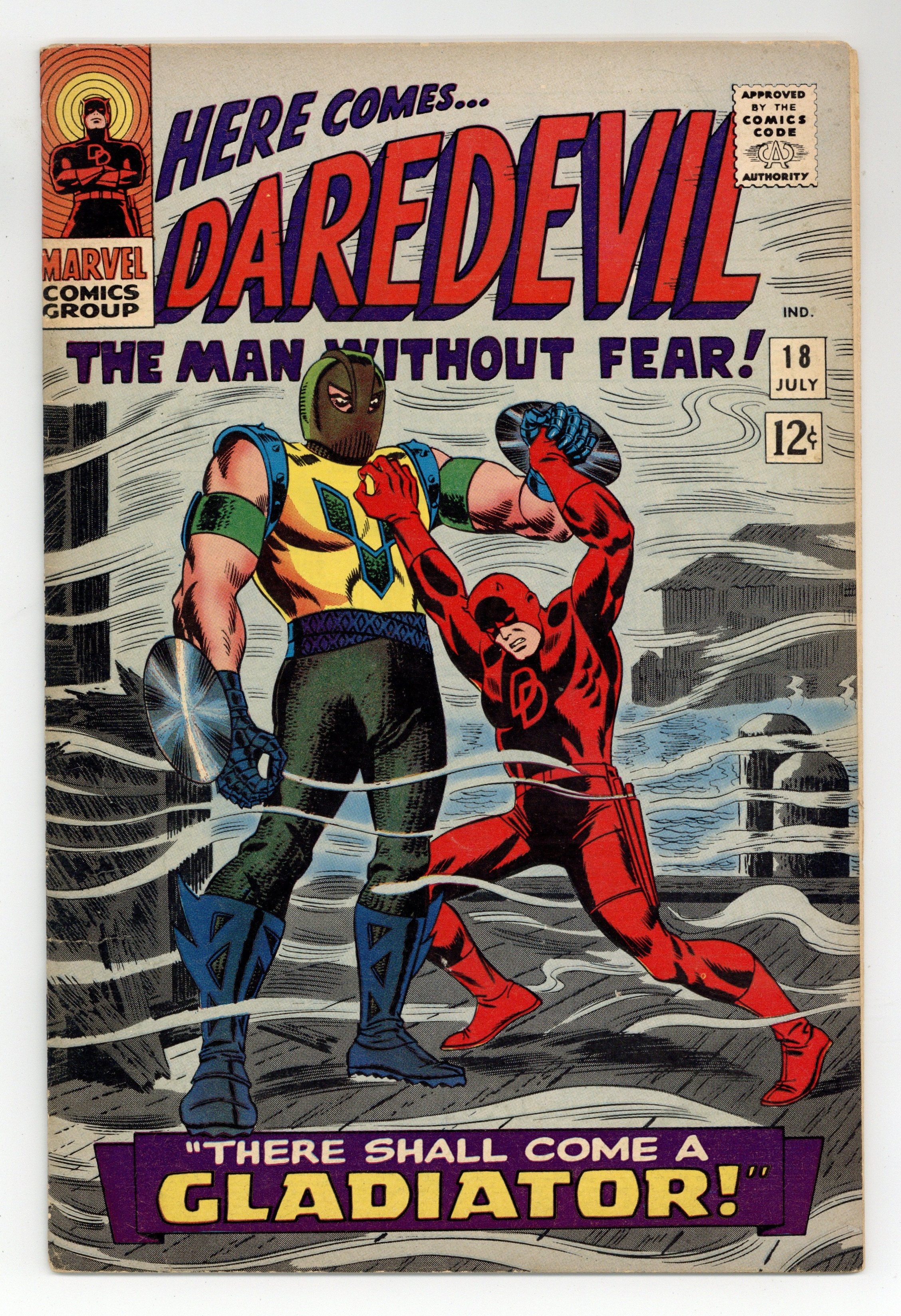 Cover pencils by John Romita, inks by Frank Giacoia. First appearance of the Gladiator in There Shall Come a Gladiator!, plot by Stan Lee, script by Lee (pages 1-7) and Dennis O'Neil (pages 8-20), pencils by John Romita Sr., inks by Frank Giacoia; A burly costume store owner decides it is really the clothes that make the man and begins his career as the Gladiator; Foggy gets a Daredevil costume from Melvin who talks the tubby lawyer into setting up a staged super fight to impress Karen; Thinking his fight with Foggy will draw out the real DD, Gladiator goes after him for real and Matt has to take a hand in rescuing his friend; In the night and the fog, everyone assumes it is Foggy as Daredevil that beat the Gladiator back; cameos by Thor, Dr. Strange, Captain America, and Dr. Doom (as costumes in the Gladiator's costume shop). 36 pgs. Cover price $0.12. Cover price $0.12.