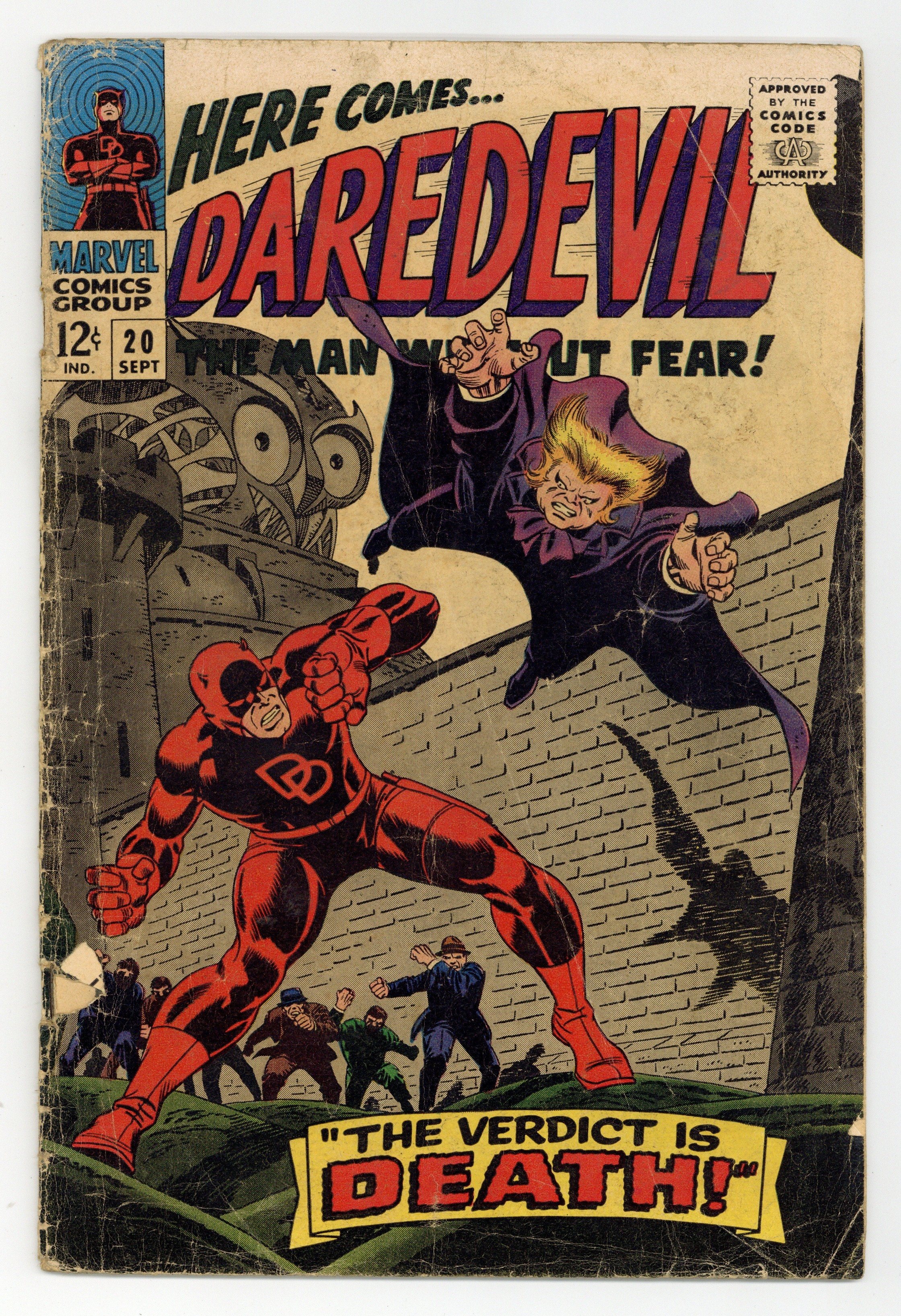 Tags: Marvel Legacy Numbering: Daredevil (part 20), Daredevil$10.50Cover pencils by John Romita, inks by Frank Giacoia. The Owl returns in The Verdict Is: Death!, script by Stan Lee, pencils by Gene Colan (first work on the title), inks by Frank Giacoia; The Owl kidnaps Matt Murdock to be the defense attorney in a mock trial the fowlish fiend has set up for the judge who sent him to prison. Reprinted in Giant-Size Marvel Triple Action #1. 36 pgs. Cover price $0.12. Cover price $0.12.