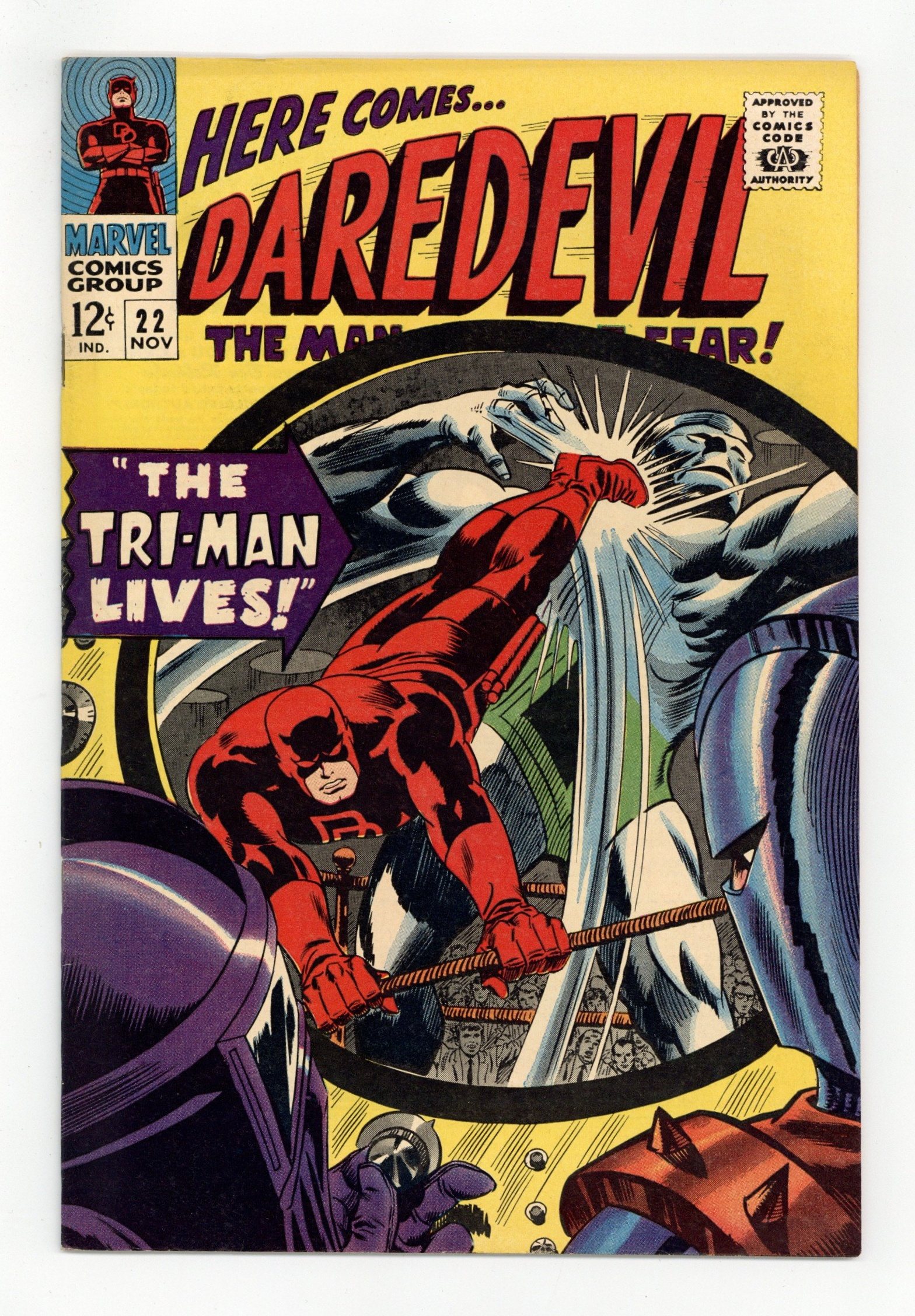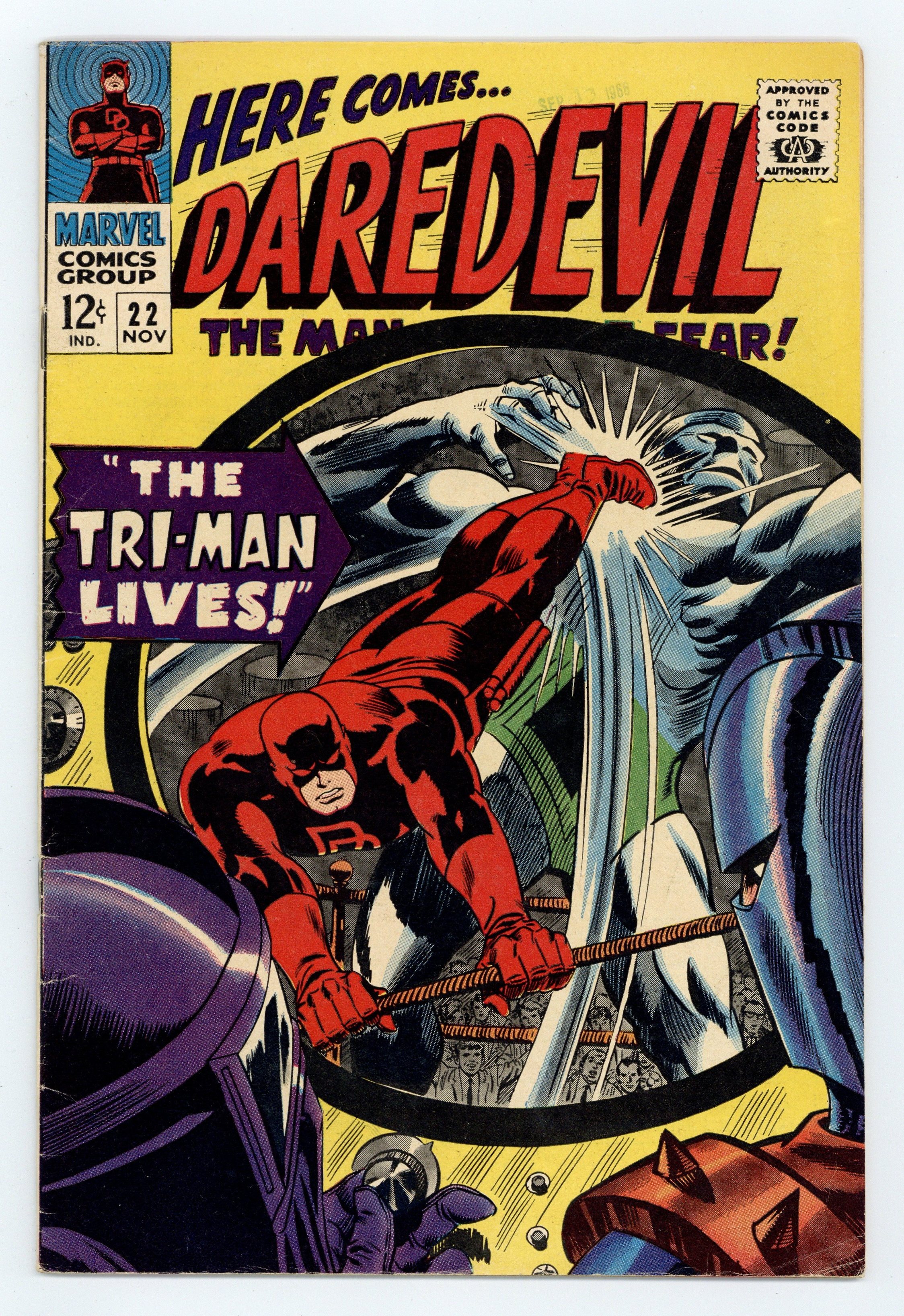 Cover pencils by Gene Colan, inks by Frank Giacoia. First appearance of the Tri-Man (the Mangler, the Dancer, and the Brain) in The Tri-Man Lives!, script by Stan Lee, pencils by Gene Colan, inks by Frank Giacoia (pages 1-9) and Dick Ayers (pages 10-20); The Masked Marauder and Gladiator create the Tri-Android and power him up with the combined skills of three master criminals; The dastardly duo send their android after DD in a bid to win leadership of the Maggia; appearance by the Owl. 36 pgs. Cover price $0.12. Cover price $0.12.