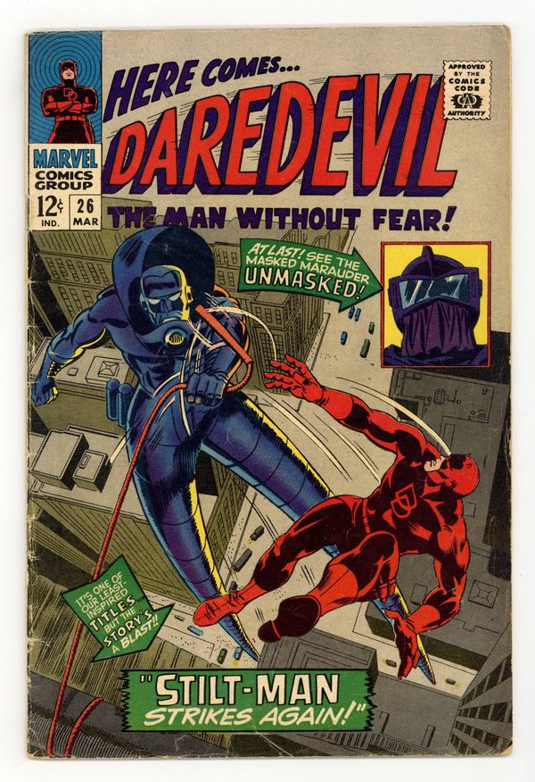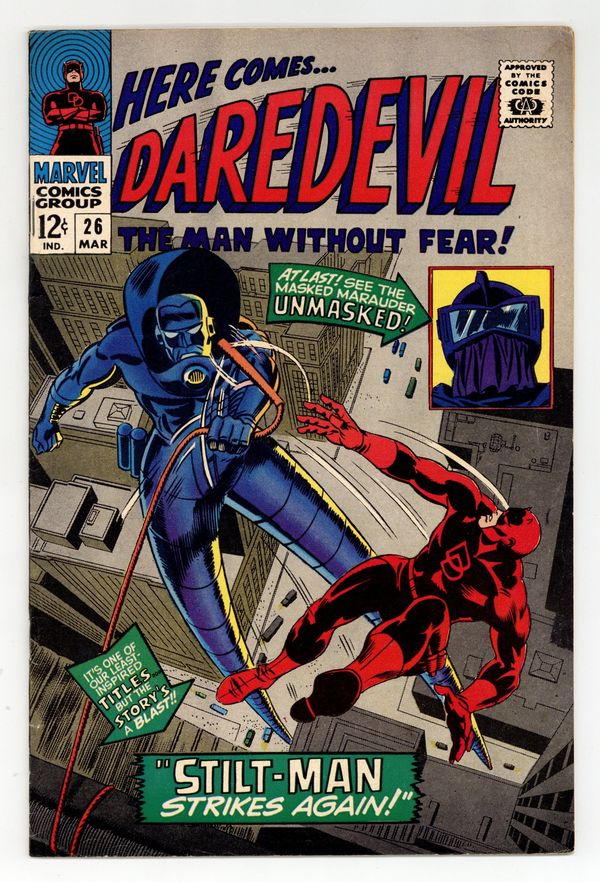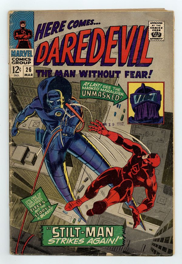 Cover pencils by Gene Colan, inks by Frank Giacoia. Stilt-Man Strikes Again, script by Stan Lee, art by Gene Colan; Matt continues in his role as Mike Murdock, Daredevil supreme; The Leap-Frog hops away from his trial and when DD goes after him, he runs across Stilt-Man; The Masked Marauder searches for DD's secret identity and rescues Stilt-Man from Hornhead. 32 pgs. Cover price $0.12. Cover price $0.12.