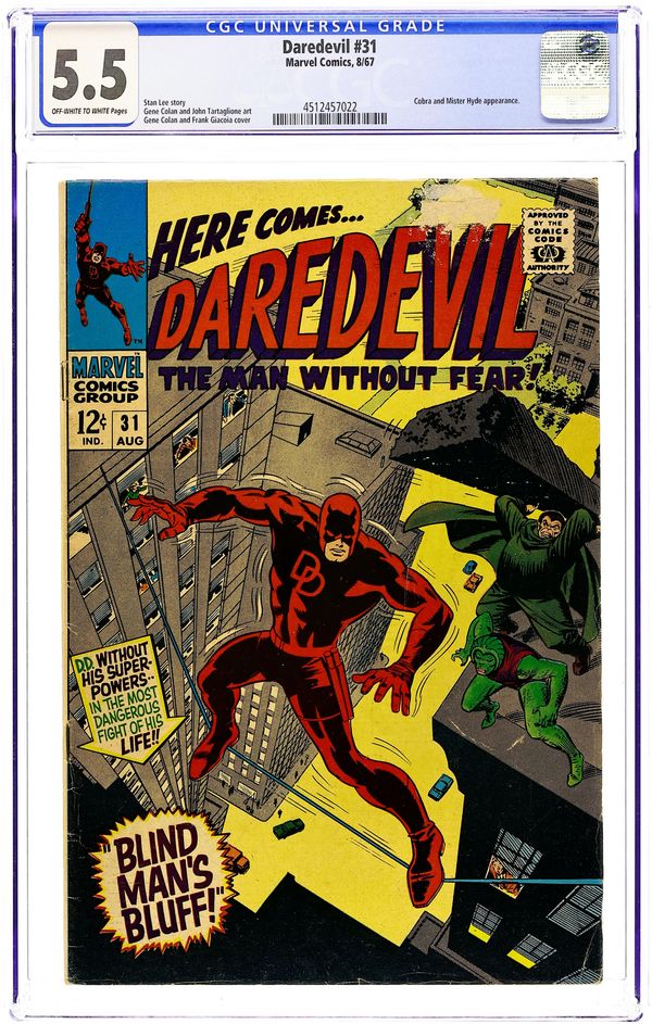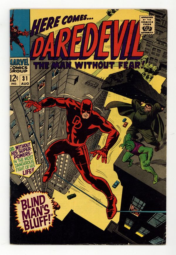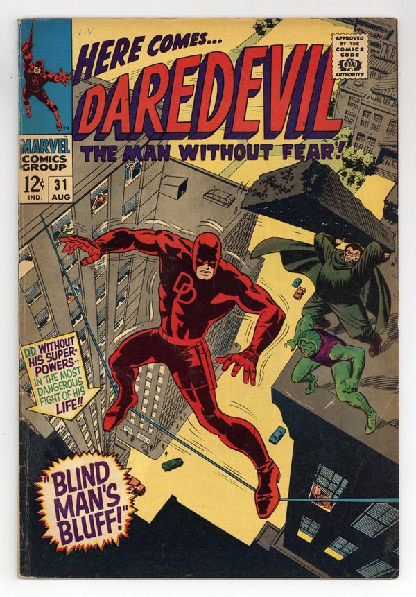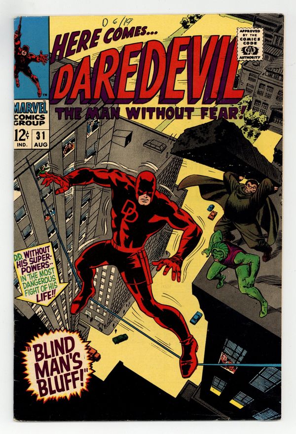 Tags: Marvel Legacy Numbering: Daredevil (part 31), Daredevil$17.25Cover pencils by Gene Colan, inks by Frank Giacoia. Blind Man's Bluff, script by Stan Lee, pencils by Gene Colan, inks by John Tartaglione; a powerless and totally blind DD has to try and tackle the combined might of Mr. Hyde and Cobra; Mike Murdock appearance. 36 pgs. Cover price $0.12. Cover price $0.12.