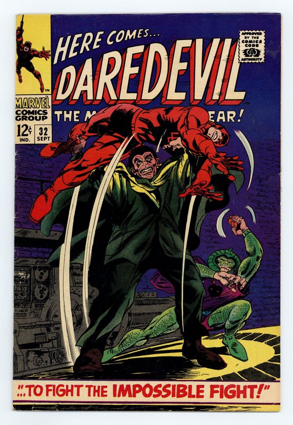 Tags: Marvel Legacy Numbering: Daredevil (part 32), Daredevil$25.50Cover pencils by Gene Colan, inks by John Tartaglione. To Fight the Impossible Fight, script by Stan Lee, pencils by Gene Colan, inks by John Tartaglione; Still truly blind, DD is captured by Cobra and Hyde and taken to their hideout where he desperately tries to find an antidote to restore his powers before the gruesome twosome finish him off. 36 pgs. Cover price $0.12. Cover price $0.12.
